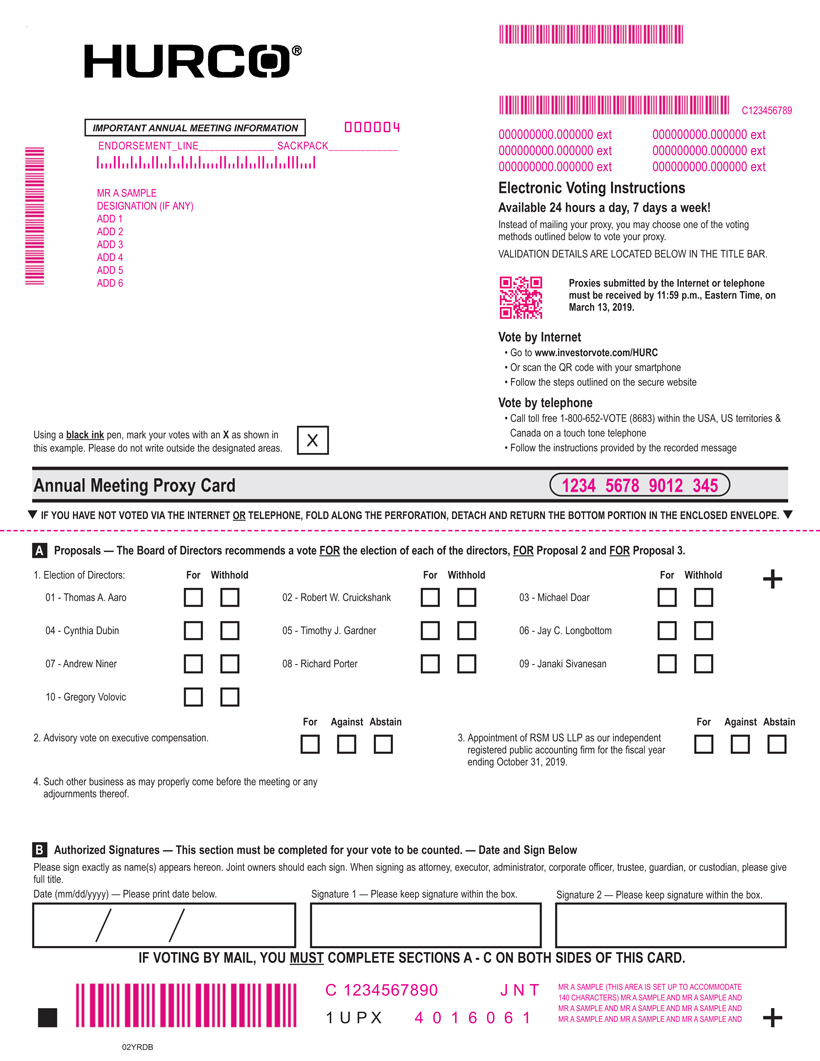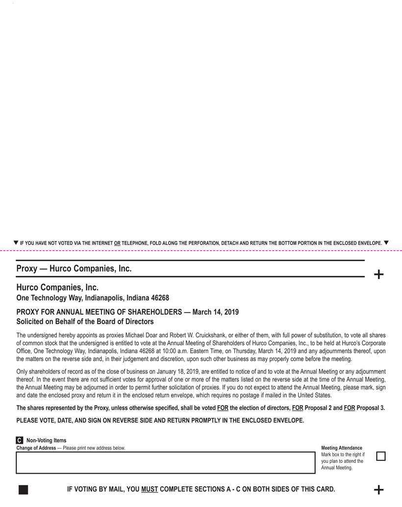 The 2019 Annual Meeting of Shareholders of Hurco Companies, Inc., will be held at our corporate headquarters, at One Technology Way, Indianapolis, Indiana 46268, at 10:00 a.m. Eastern Daylight Time on Thursday, March 14, 2019, for the following purposes: