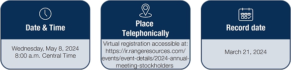 The 2024 Annual Meeting will be held telephonically. There will not be a physical location for the meeting. You may attend the 2024 Annual Meeting if you were a stockholder of record on March 21, 2024 or if you hold a valid proxy for the 2024 Annual Meeting. In order to join the Annual Meeting, you will need to register at: https://ir.rangeresources.com/events/event-details/2024-annual-meeting-stockholders.