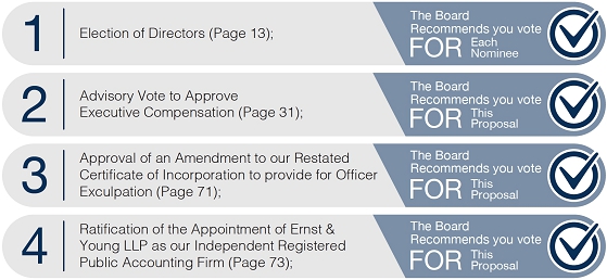 | • | To consider a Board proposal to amend our restated Certificate of Incorporation to reflect current Delaware corporate law provisions permitting the exculpation of certain officers; | |