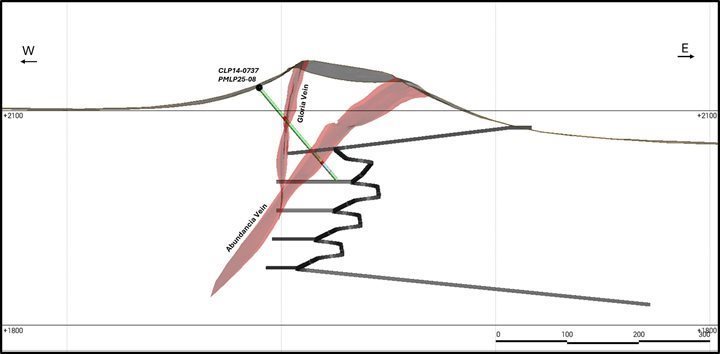 Figure 4 – Cross-Section of PMLP25-08, looking North, Showing the Abundancia Vein, the La Gloria vein and the Projections of the Decline Ramp.