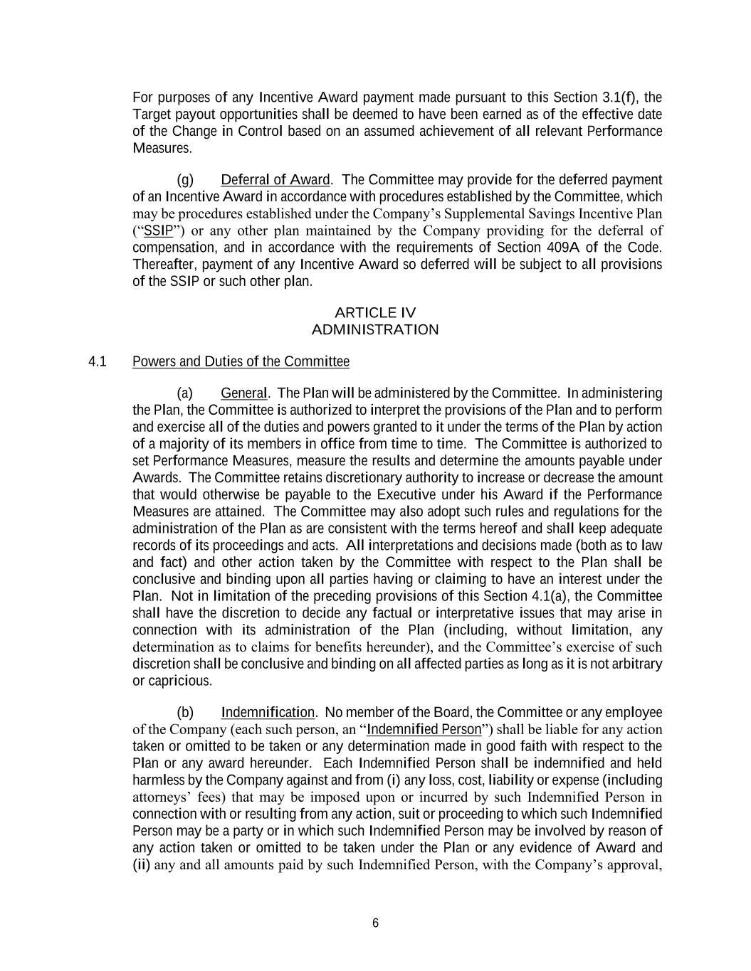 6 For purposes of any Incentive Award payment made pursuant to this Section 3.1(f), the Target payout opportunities shall be deemed to have been earned as of the effective date of the Change in Control based on an assumed achievement of all relevant Performance Measures. (g) Deferral of Award. The Committee may provide for the deferred payment of an Incentive Award in accordance with procedures established by the Committee, which may be procedures established under the Company’s Supplemental Savings Incentive Plan (“SSIP”) or any other plan maintained by the Company providing for the deferral of compensation, and in accordance with the requirements of Section 409A of the Code. Thereafter, payment of any Incentive Award so deferred will be subject to all provisions of the SSIP or such other plan. ARTICLE IV ADMINISTRATION 4.1 Powers and Duties of the Committee (a) General. The Plan will be administered by the Committee. In administering the Plan, the Committee is authorized to interpret the provisions of the Plan and to perform and exercise all of the duties and powers granted to it under the terms of the Plan by action of a majority of its members in office from time to time. The Committee is authorized to set Performance Measures, measure the results and determine the amounts payable under Awards. The Committee retains discretionary authority to increase or decrease the amount that would otherwise be payable to the Executive under his Award if the Performance Measures are attained. The Committee may also adopt such rules and regulations for the administration of the Plan as are consistent with the terms hereof and shall keep adequate records of its proceedings and acts. All interpretations and decisions made (both as to law and fact) and other action taken by the Committee with respect to the Plan shall be conclusive and binding upon all parties having or claiming to have an interest under the Plan. Not in limitation of the preceding provisions of this Section 4.1(a), the Committee shall have the discretion to decide any factual or interpretative issues that may arise in connection with its administration of the Plan (including, without limitation, any determination as to claims for benefits hereunder), and the Committee’s exercise of such discretion shall be conclusive and binding on all affected parties as long as it is not arbitrary or capricious. (b) Indemnification. No member of the Board, the Committee or any employee of the Company (each such person, an “Indemnified Person”) shall be liable for any action taken or omitted to be taken or any determination made in good faith with respect to the Plan or any award hereunder. Each Indemnified Person shall be indemnified and held harmless by the Company against and from (i) any loss, cost, liability or expense (including attorneys’ fees) that may be imposed upon or incurred by such Indemnified Person in connection with or resulting from any action, suit or proceeding to which such Indemnified Person may be a party or in which such Indemnified Person may be involved by reason of any action taken or omitted to be taken under the Plan or any evidence of Award and (ii) any and all amounts paid by such Indemnified Person, with the Company’s approval,
