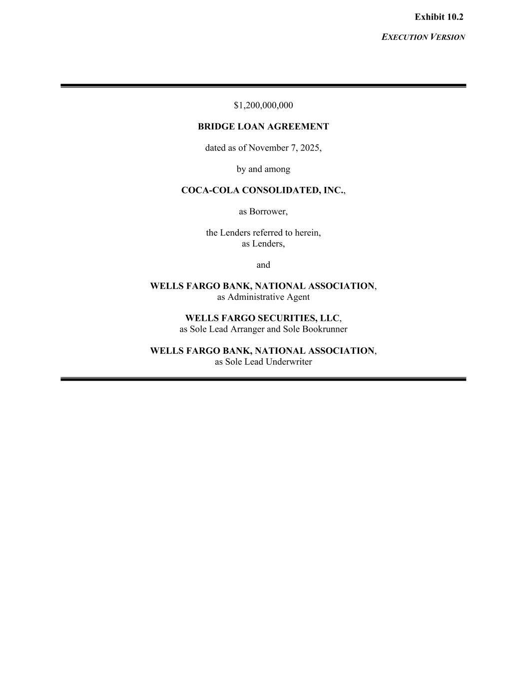 EXECUTION VERSION Exhibit 10.2 $1,200,000,000 BRIDGE LOAN AGREEMENT dated as of November 7, 2025, by and among COCA-COLA CONSOLIDATED, INC., as Borrower, the Lenders referred to herein, as Lenders, and WELLS FARGO BANK, NATIONAL ASSOCIATION, as Administrative Agent WELLS FARGO SECURITIES, LLC, as Sole Lead Arranger and Sole Bookrunner WELLS FARGO BANK, NATIONAL ASSOCIATION, as Sole Lead Underwriter