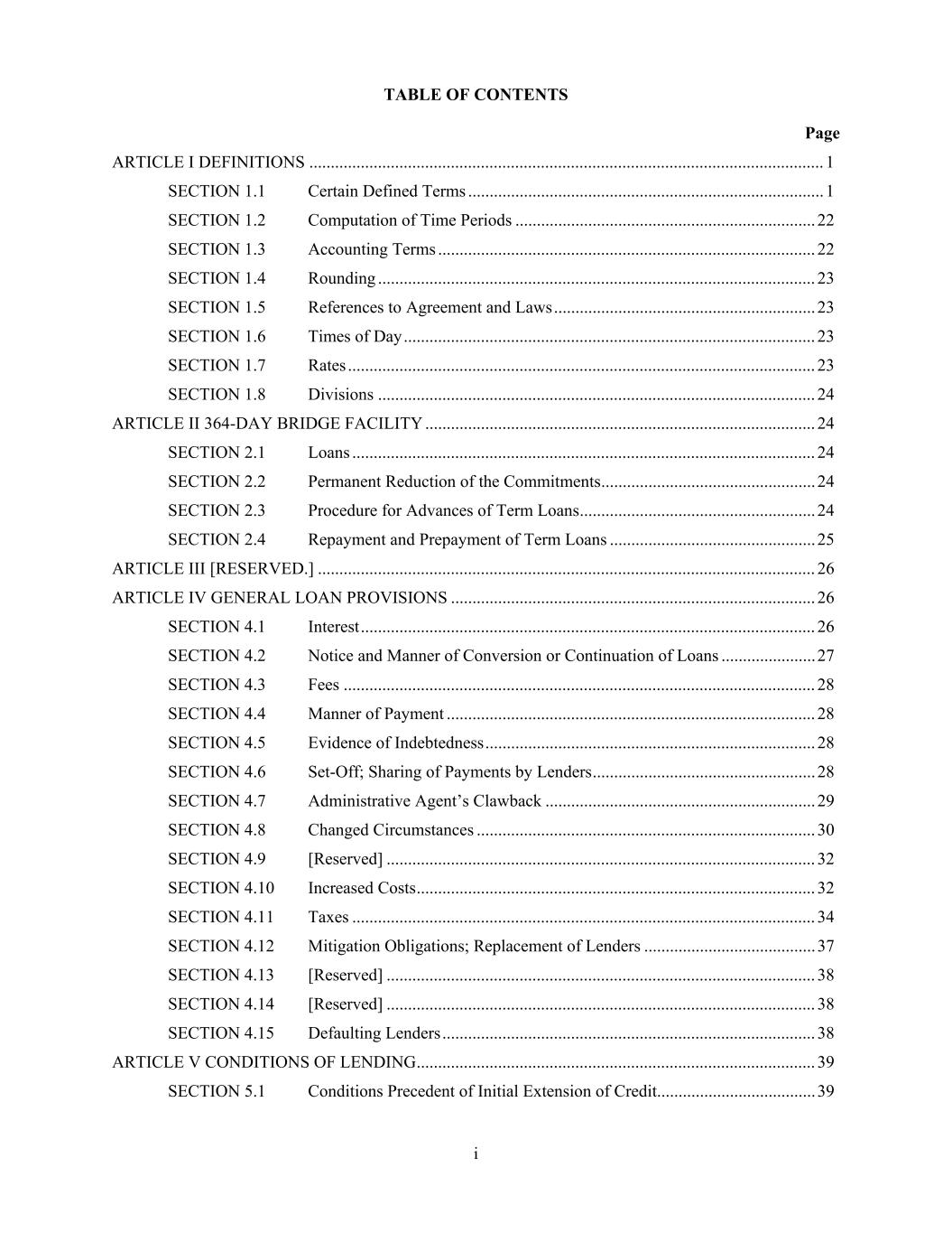 TABLE OF CONTENTS i Page ARTICLE I DEFINITIONS ........................................................................................................................ 1 SECTION 1.1 Certain Defined Terms ................................................................................... 1 SECTION 1.2 Computation of Time Periods ...................................................................... 22 SECTION 1.3 Accounting Terms ........................................................................................ 22 SECTION 1.4 Rounding ...................................................................................................... 23 SECTION 1.5 References to Agreement and Laws ............................................................. 23 SECTION 1.6 Times of Day ................................................................................................ 23 SECTION 1.7 Rates ............................................................................................................. 23 SECTION 1.8 Divisions ...................................................................................................... 24 ARTICLE II 364-DAY BRIDGE FACILITY ........................................................................................... 24 SECTION 2.1 Loans ............................................................................................................ 24 SECTION 2.2 Permanent Reduction of the Commitments .................................................. 24 SECTION 2.3 Procedure for Advances of Term Loans ....................................................... 24 SECTION 2.4 Repayment and Prepayment of Term Loans ................................................ 25 ARTICLE III [RESERVED.] .................................................................................................................... 26 ARTICLE IV GENERAL LOAN PROVISIONS ..................................................................................... 26 SECTION 4.1 Interest .......................................................................................................... 26 SECTION 4.2 Notice and Manner of Conversion or Continuation of Loans ...................... 27 SECTION 4.3 Fees .............................................................................................................. 28 SECTION 4.4 Manner of Payment ...................................................................................... 28 SECTION 4.5 Evidence of Indebtedness ............................................................................. 28 SECTION 4.6 Set-Off; Sharing of Payments by Lenders .................................................... 28 SECTION 4.7 Administrative Agent’s Clawback ............................................................... 29 SECTION 4.8 Changed Circumstances ............................................................................... 30 SECTION 4.9 [Reserved] .................................................................................................... 32 SECTION 4.10 Increased Costs ............................................................................................. 32 SECTION 4.11 Taxes ............................................................................................................ 34 SECTION 4.12 Mitigation Obligations; Replacement of Lenders ........................................ 37 SECTION 4.13 [Reserved] .................................................................................................... 38 SECTION 4.14 [Reserved] .................................................................................................... 38 SECTION 4.15 Defaulting Lenders ....................................................................................... 38 ARTICLE V CONDITIONS OF LENDING ............................................................................................. 39 SECTION 5.1 Conditions Precedent of Initial Extension of Credit..................................... 39