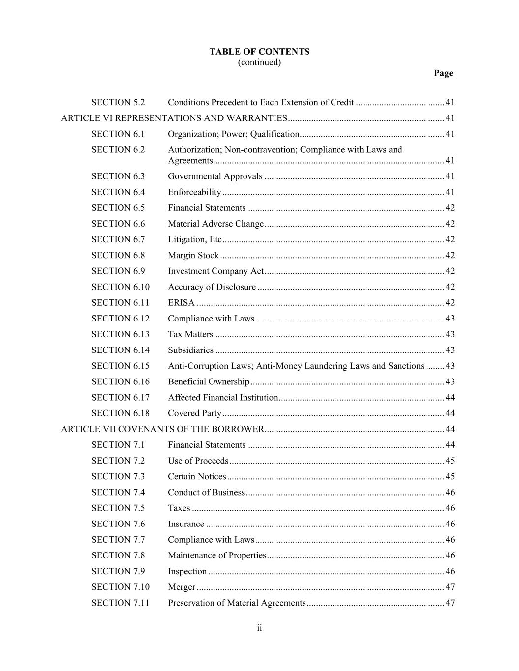 TABLE OF CONTENTS (continued) Page ii SECTION 5.2 Conditions Precedent to Each Extension of Credit ...................................... 41 ARTICLE VI REPRESENTATIONS AND WARRANTIES ................................................................... 41 SECTION 6.1 Organization; Power; Qualification .............................................................. 41 SECTION 6.2 Authorization; Non-contravention; Compliance with Laws and Agreements................................................................................................... 41 SECTION 6.3 Governmental Approvals ............................................................................. 41 SECTION 6.4 Enforceability ............................................................................................... 41 SECTION 6.5 Financial Statements .................................................................................... 42 SECTION 6.6 Material Adverse Change ............................................................................. 42 SECTION 6.7 Litigation, Etc ............................................................................................... 42 SECTION 6.8 Margin Stock ................................................................................................ 42 SECTION 6.9 Investment Company Act ............................................................................. 42 SECTION 6.10 Accuracy of Disclosure ................................................................................ 42 SECTION 6.11 ERISA .......................................................................................................... 42 SECTION 6.12 Compliance with Laws ................................................................................. 43 SECTION 6.13 Tax Matters .................................................................................................. 43 SECTION 6.14 Subsidiaries .................................................................................................. 43 SECTION 6.15 Anti-Corruption Laws; Anti-Money Laundering Laws and Sanctions ........ 43 SECTION 6.16 Beneficial Ownership ................................................................................... 43 SECTION 6.17 Affected Financial Institution ....................................................................... 44 SECTION 6.18 Covered Party ............................................................................................... 44 ARTICLE VII COVENANTS OF THE BORROWER ............................................................................. 44 SECTION 7.1 Financial Statements .................................................................................... 44 SECTION 7.2 Use of Proceeds ............................................................................................ 45 SECTION 7.3 Certain Notices ............................................................................................. 45 SECTION 7.4 Conduct of Business ..................................................................................... 46 SECTION 7.5 Taxes ............................................................................................................ 46 SECTION 7.6 Insurance ...................................................................................................... 46 SECTION 7.7 Compliance with Laws ................................................................................. 46 SECTION 7.8 Maintenance of Properties ............................................................................ 46 SECTION 7.9 Inspection ..................................................................................................... 46 SECTION 7.10 Merger .......................................................................................................... 47 SECTION 7.11 Preservation of Material Agreements ........................................................... 47
