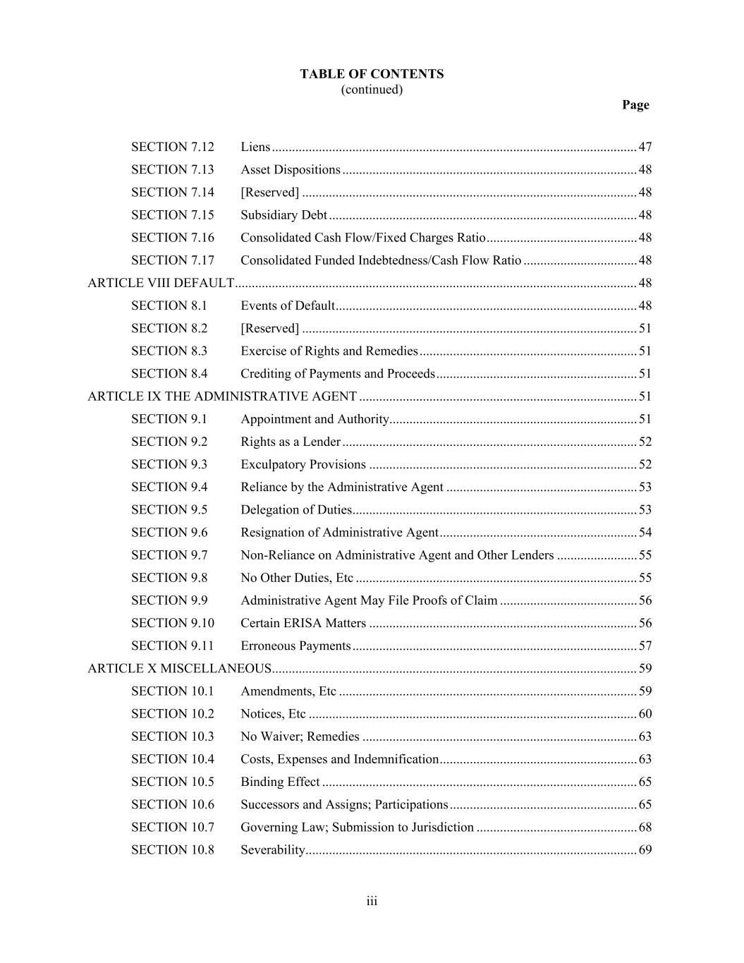TABLE OF CONTENTS (continued) Page iii SECTION 7.12 Liens ............................................................................................................. 47 SECTION 7.13 Asset Dispositions ........................................................................................ 48 SECTION 7.14 [Reserved] .................................................................................................... 48 SECTION 7.15 Subsidiary Debt ............................................................................................ 48 SECTION 7.16 Consolidated Cash Flow/Fixed Charges Ratio ............................................. 48 SECTION 7.17 Consolidated Funded Indebtedness/Cash Flow Ratio .................................. 48 ARTICLE VIII DEFAULT ........................................................................................................................ 48 SECTION 8.1 Events of Default .......................................................................................... 48 SECTION 8.2 [Reserved] .................................................................................................... 51 SECTION 8.3 Exercise of Rights and Remedies ................................................................. 51 SECTION 8.4 Crediting of Payments and Proceeds ............................................................ 51 ARTICLE IX THE ADMINISTRATIVE AGENT ................................................................................... 51 SECTION 9.1 Appointment and Authority.......................................................................... 51 SECTION 9.2 Rights as a Lender ........................................................................................ 52 SECTION 9.3 Exculpatory Provisions ................................................................................ 52 SECTION 9.4 Reliance by the Administrative Agent ......................................................... 53 SECTION 9.5 Delegation of Duties ..................................................................................... 53 SECTION 9.6 Resignation of Administrative Agent ........................................................... 54 SECTION 9.7 Non-Reliance on Administrative Agent and Other Lenders ........................ 55 SECTION 9.8 No Other Duties, Etc .................................................................................... 55 SECTION 9.9 Administrative Agent May File Proofs of Claim ......................................... 56 SECTION 9.10 Certain ERISA Matters ................................................................................ 56 SECTION 9.11 Erroneous Payments ..................................................................................... 57 ARTICLE X MISCELLANEOUS............................................................................................................. 59 SECTION 10.1 Amendments, Etc ......................................................................................... 59 SECTION 10.2 Notices, Etc .................................................................................................. 60 SECTION 10.3 No Waiver; Remedies .................................................................................. 63 SECTION 10.4 Costs, Expenses and Indemnification ........................................................... 63 SECTION 10.5 Binding Effect .............................................................................................. 65 SECTION 10.6 Successors and Assigns; Participations ........................................................ 65 SECTION 10.7 Governing Law; Submission to Jurisdiction ................................................ 68 SECTION 10.8 Severability................................................................................................... 69