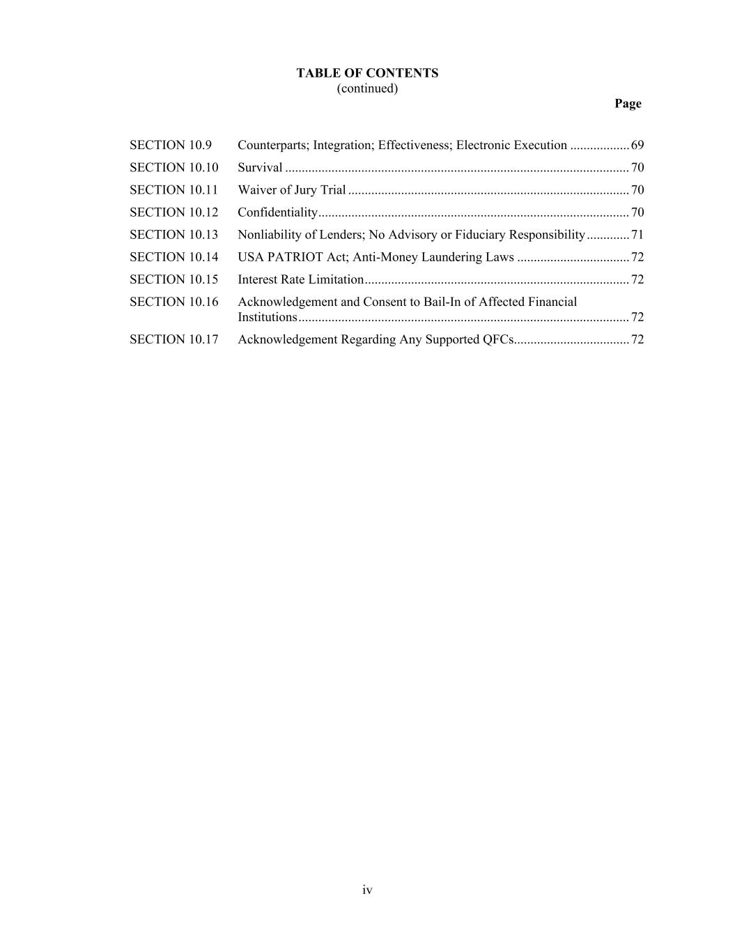 TABLE OF CONTENTS (continued) Page iv SECTION 10.9 Counterparts; Integration; Effectiveness; Electronic Execution .................. 69 SECTION 10.10 Survival ........................................................................................................ 70 SECTION 10.11 Waiver of Jury Trial ..................................................................................... 70 SECTION 10.12 Confidentiality .............................................................................................. 70 SECTION 10.13 Nonliability of Lenders; No Advisory or Fiduciary Responsibility ............. 71 SECTION 10.14 USA PATRIOT Act; Anti-Money Laundering Laws .................................. 72 SECTION 10.15 Interest Rate Limitation ................................................................................ 72 SECTION 10.16 Acknowledgement and Consent to Bail-In of Affected Financial Institutions .................................................................................................... 72 SECTION 10.17 Acknowledgement Regarding Any Supported QFCs ................................... 72