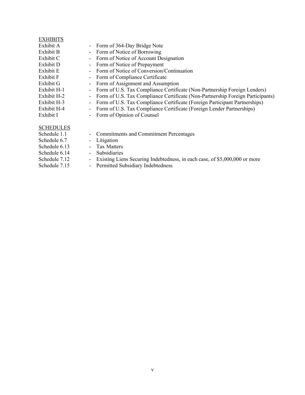 v EXHIBITS Exhibit A - Form of 364-Day Bridge Note Exhibit B - Form of Notice of Borrowing Exhibit C - Form of Notice of Account Designation Exhibit D - Form of Notice of Prepayment Exhibit E - Form of Notice of Conversion/Continuation Exhibit F - Form of Compliance Certificate Exhibit G - Form of Assignment and Assumption Exhibit H-1 - Form of U.S. Tax Compliance Certificate (Non-Partnership Foreign Lenders) Exhibit H-2 - Form of U.S. Tax Compliance Certificate (Non-Partnership Foreign Participants) Exhibit H-3 - Form of U.S. Tax Compliance Certificate (Foreign Participant Partnerships) Exhibit H-4 - Form of U.S. Tax Compliance Certificate (Foreign Lender Partnerships) Exhibit I - Form of Opinion of Counsel SCHEDULES Schedule 1.1 - Commitments and Commitment Percentages Schedule 6.7 - Litigation Schedule 6.13 - Tax Matters Schedule 6.14 - Subsidiaries Schedule 7.12 - Existing Liens Securing Indebtedness, in each case, of $5,000,000 or more Schedule 7.15 - Permitted Subsidiary Indebtedness