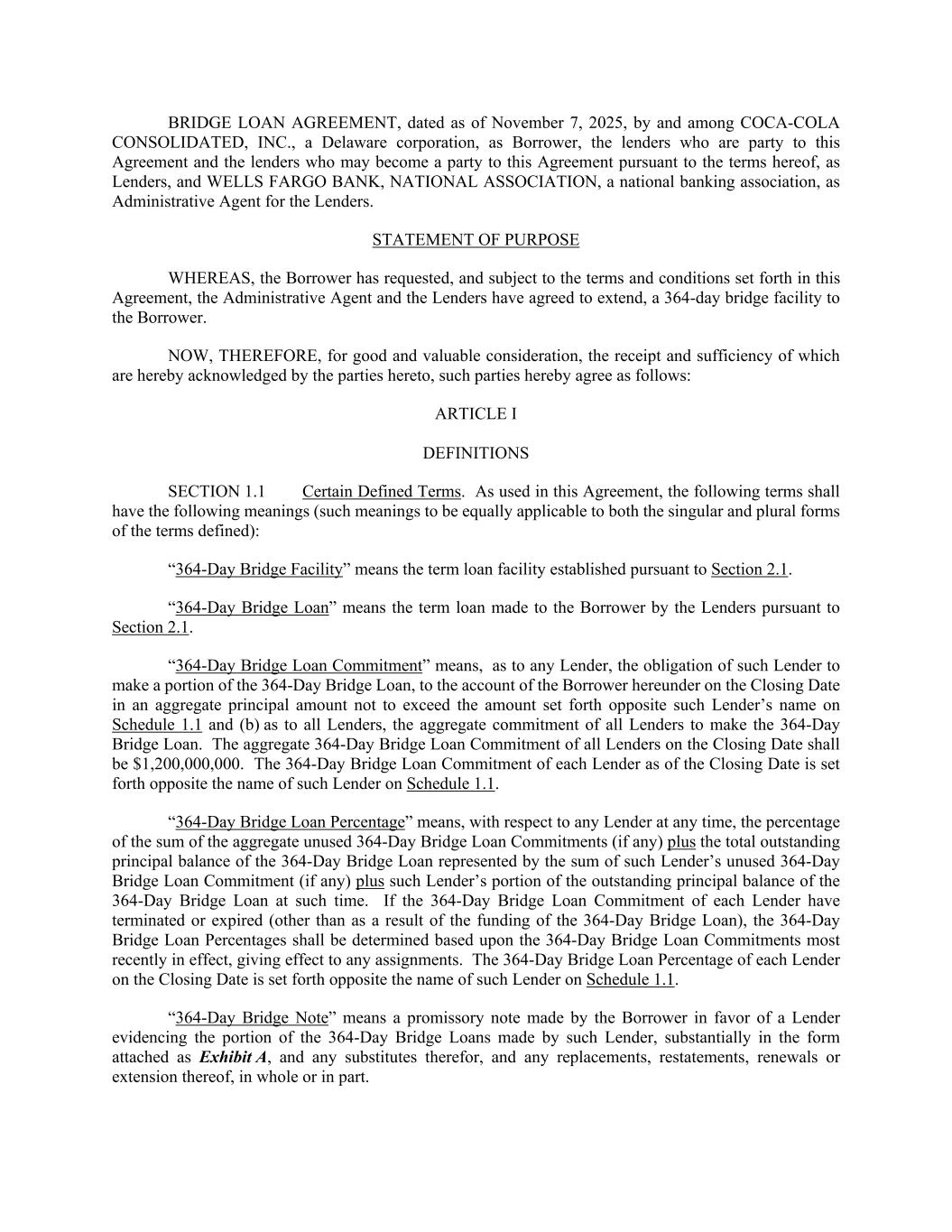 BRIDGE LOAN AGREEMENT, dated as of November 7, 2025, by and among COCA-COLA CONSOLIDATED, INC., a Delaware corporation, as Borrower, the lenders who are party to this Agreement and the lenders who may become a party to this Agreement pursuant to the terms hereof, as Lenders, and WELLS FARGO BANK, NATIONAL ASSOCIATION, a national banking association, as Administrative Agent for the Lenders. STATEMENT OF PURPOSE WHEREAS, the Borrower has requested, and subject to the terms and conditions set forth in this Agreement, the Administrative Agent and the Lenders have agreed to extend, a 364-day bridge facility to the Borrower. NOW, THEREFORE, for good and valuable consideration, the receipt and sufficiency of which are hereby acknowledged by the parties hereto, such parties hereby agree as follows: ARTICLE I DEFINITIONS SECTION 1.1 Certain Defined Terms. As used in this Agreement, the following terms shall have the following meanings (such meanings to be equally applicable to both the singular and plural forms of the terms defined): “364-Day Bridge Facility” means the term loan facility established pursuant to Section 2.1. “364-Day Bridge Loan” means the term loan made to the Borrower by the Lenders pursuant to Section 2.1. “364-Day Bridge Loan Commitment” means, as to any Lender, the obligation of such Lender to make a portion of the 364-Day Bridge Loan, to the account of the Borrower hereunder on the Closing Date in an aggregate principal amount not to exceed the amount set forth opposite such Lender’s name on Schedule 1.1 and (b) as to all Lenders, the aggregate commitment of all Lenders to make the 364-Day Bridge Loan. The aggregate 364-Day Bridge Loan Commitment of all Lenders on the Closing Date shall be $1,200,000,000. The 364-Day Bridge Loan Commitment of each Lender as of the Closing Date is set forth opposite the name of such Lender on Schedule 1.1. “364-Day Bridge Loan Percentage” means, with respect to any Lender at any time, the percentage of the sum of the aggregate unused 364-Day Bridge Loan Commitments (if any) plus the total outstanding principal balance of the 364-Day Bridge Loan represented by the sum of such Lender’s unused 364-Day Bridge Loan Commitment (if any) plus such Lender’s portion of the outstanding principal balance of the 364-Day Bridge Loan at such time. If the 364-Day Bridge Loan Commitment of each Lender have terminated or expired (other than as a result of the funding of the 364-Day Bridge Loan), the 364-Day Bridge Loan Percentages shall be determined based upon the 364-Day Bridge Loan Commitments most recently in effect, giving effect to any assignments. The 364-Day Bridge Loan Percentage of each Lender on the Closing Date is set forth opposite the name of such Lender on Schedule 1.1. “364-Day Bridge Note” means a promissory note made by the Borrower in favor of a Lender evidencing the portion of the 364-Day Bridge Loans made by such Lender, substantially in the form attached as Exhibit A, and any substitutes therefor, and any replacements, restatements, renewals or extension thereof, in whole or in part.