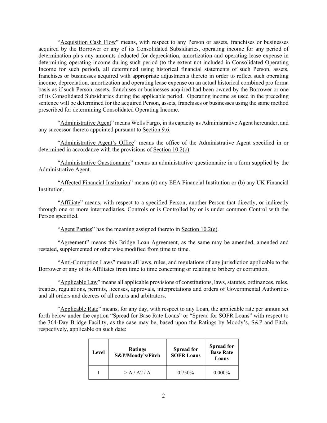 2 “Acquisition Cash Flow” means, with respect to any Person or assets, franchises or businesses acquired by the Borrower or any of its Consolidated Subsidiaries, operating income for any period of determination plus any amounts deducted for depreciation, amortization and operating lease expense in determining operating income during such period (to the extent not included in Consolidated Operating Income for such period), all determined using historical financial statements of such Person, assets, franchises or businesses acquired with appropriate adjustments thereto in order to reflect such operating income, depreciation, amortization and operating lease expense on an actual historical combined pro forma basis as if such Person, assets, franchises or businesses acquired had been owned by the Borrower or one of its Consolidated Subsidiaries during the applicable period. Operating income as used in the preceding sentence will be determined for the acquired Person, assets, franchises or businesses using the same method prescribed for determining Consolidated Operating Income. “Administrative Agent” means Wells Fargo, in its capacity as Administrative Agent hereunder, and any successor thereto appointed pursuant to Section 9.6. “Administrative Agent’s Office” means the office of the Administrative Agent specified in or determined in accordance with the provisions of Section 10.2(c). “Administrative Questionnaire” means an administrative questionnaire in a form supplied by the Administrative Agent. “Affected Financial Institution” means (a) any EEA Financial Institution or (b) any UK Financial Institution. “Affiliate” means, with respect to a specified Person, another Person that directly, or indirectly through one or more intermediaries, Controls or is Controlled by or is under common Control with the Person specified. “Agent Parties” has the meaning assigned thereto in Section 10.2(e). “Agreement” means this Bridge Loan Agreement, as the same may be amended, amended and restated, supplemented or otherwise modified from time to time. “Anti-Corruption Laws” means all laws, rules, and regulations of any jurisdiction applicable to the Borrower or any of its Affiliates from time to time concerning or relating to bribery or corruption. “Applicable Law” means all applicable provisions of constitutions, laws, statutes, ordinances, rules, treaties, regulations, permits, licenses, approvals, interpretations and orders of Governmental Authorities and all orders and decrees of all courts and arbitrators. “Applicable Rate” means, for any day, with respect to any Loan, the applicable rate per annum set forth below under the caption “Spread for Base Rate Loans” or “Spread for SOFR Loans” with respect to the 364-Day Bridge Facility, as the case may be, based upon the Ratings by Moody’s, S&P and Fitch, respectively, applicable on such date: Level Ratings S&P/Moody’s/Fitch Spread for SOFR Loans Spread for Base Rate Loans 1 > A / A2 / A 0.750% 0.000%