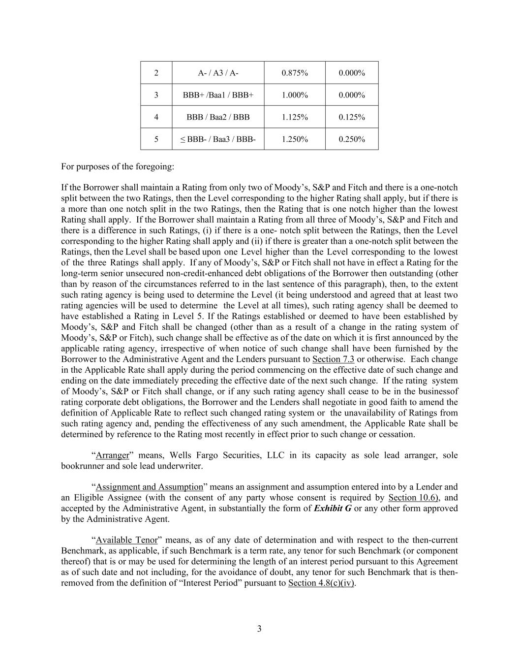 3 2 A- / A3 / A- 0.875% 0.000% 3 BBB+ /Baa1 / BBB+ 1.000% 0.000% 4 BBB / Baa2 / BBB 1.125% 0.125% 5 ≤ BBB- / Baa3 / BBB- 1.250% 0.250% For purposes of the foregoing: If the Borrower shall maintain a Rating from only two of Moody’s, S&P and Fitch and there is a one-notch split between the two Ratings, then the Level corresponding to the higher Rating shall apply, but if there is a more than one notch split in the two Ratings, then the Rating that is one notch higher than the lowest Rating shall apply. If the Borrower shall maintain a Rating from all three of Moody’s, S&P and Fitch and there is a difference in such Ratings, (i) if there is a one- notch split between the Ratings, then the Level corresponding to the higher Rating shall apply and (ii) if there is greater than a one-notch split between the Ratings, then the Level shall be based upon one Level higher than the Level corresponding to the lowest of the three Ratings shall apply. If any of Moody’s, S&P or Fitch shall not have in effect a Rating for the long-term senior unsecured non-credit-enhanced debt obligations of the Borrower then outstanding (other than by reason of the circumstances referred to in the last sentence of this paragraph), then, to the extent such rating agency is being used to determine the Level (it being understood and agreed that at least two rating agencies will be used to determine the Level at all times), such rating agency shall be deemed to have established a Rating in Level 5. If the Ratings established or deemed to have been established by Moody’s, S&P and Fitch shall be changed (other than as a result of a change in the rating system of Moody’s, S&P or Fitch), such change shall be effective as of the date on which it is first announced by the applicable rating agency, irrespective of when notice of such change shall have been furnished by the Borrower to the Administrative Agent and the Lenders pursuant to Section 7.3 or otherwise. Each change in the Applicable Rate shall apply during the period commencing on the effective date of such change and ending on the date immediately preceding the effective date of the next such change. If the rating system of Moody’s, S&P or Fitch shall change, or if any such rating agency shall cease to be in the business of rating corporate debt obligations, the Borrower and the Lenders shall negotiate in good faith to amend the definition of Applicable Rate to reflect such changed rating system or the unavailability of Ratings from such rating agency and, pending the effectiveness of any such amendment, the Applicable Rate shall be determined by reference to the Rating most recently in effect prior to such change or cessation. “Arranger” means, Wells Fargo Securities, LLC in its capacity as sole lead arranger, sole bookrunner and sole lead underwriter. “Assignment and Assumption” means an assignment and assumption entered into by a Lender and an Eligible Assignee (with the consent of any party whose consent is required by Section 10.6), and accepted by the Administrative Agent, in substantially the form of Exhibit G or any other form approved by the Administrative Agent. “Available Tenor” means, as of any date of determination and with respect to the then-current Benchmark, as applicable, if such Benchmark is a term rate, any tenor for such Benchmark (or component thereof) that is or may be used for determining the length of an interest period pursuant to this Agreement as of such date and not including, for the avoidance of doubt, any tenor for such Benchmark that is then- removed from the definition of “Interest Period” pursuant to Section 4.8(c)(iv).