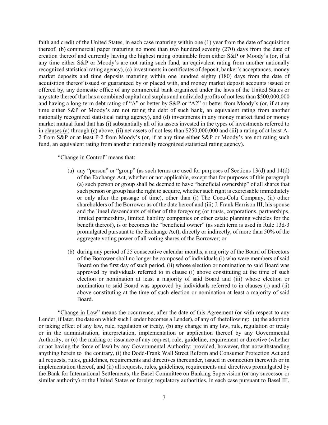 7 faith and credit of the United States, in each case maturing within one (1) year from the date of acquisition thereof, (b) commercial paper maturing no more than two hundred seventy (270) days from the date of creation thereof and currently having the highest rating obtainable from either S&P or Moody’s (or, if at any time either S&P or Moody’s are not rating such fund, an equivalent rating from another nationally recognized statistical rating agency), (c) investments in certificates of deposit, banker’s acceptances, money market deposits and time deposits maturing within one hundred eighty (180) days from the date of acquisition thereof issued or guaranteed by or placed with, and money market deposit accounts issued or offered by, any domestic office of any commercial bank organized under the laws of the United States or any state thereof that has a combined capital and surplus and undivided profits of not less than $500,000,000 and having a long-term debt rating of “A” or better by S&P or “A2” or better from Moody’s (or, if at any time either S&P or Moody’s are not rating the debt of such bank, an equivalent rating from another nationally recognized statistical rating agency), and (d) investments in any money market fund or money market mutual fund that has (i) substantially all of its assets invested in the types of investments referred to in clauses (a) through (c) above, (ii) net assets of not less than $250,000,000 and (iii) a rating of at least A- 2 from S&P or at least P-2 from Moody’s (or, if at any time either S&P or Moody’s are not rating such fund, an equivalent rating from another nationally recognized statistical rating agency). “Change in Control” means that: (a) any “person” or “group” (as such terms are used for purposes of Sections 13(d) and 14(d) of the Exchange Act, whether or not applicable, except that for purposes of this paragraph (a) such person or group shall be deemed to have “beneficial ownership” of all shares that such person or group has the right to acquire, whether such right is exercisable immediately or only after the passage of time), other than (i) The Coca-Cola Company, (ii) other shareholders of the Borrower as of the date hereof and (iii) J. Frank Harrison III, his spouse and the lineal descendants of either of the foregoing (or trusts, corporations, partnerships, limited partnerships, limited liability companies or other estate planning vehicles for the benefit thereof), is or becomes the “beneficial owner” (as such term is used in Rule 13d-3 promulgated pursuant to the Exchange Act), directly or indirectly, of more than 50% of the aggregate voting power of all voting shares of the Borrower; or (b) during any period of 25 consecutive calendar months, a majority of the Board of Directors of the Borrower shall no longer be composed of individuals (i) who were members of said Board on the first day of such period, (ii) whose election or nomination to said Board was approved by individuals referred to in clause (i) above constituting at the time of such election or nomination at least a majority of said Board and (iii) whose election or nomination to said Board was approved by individuals referred to in clauses (i) and (ii) above constituting at the time of such election or nomination at least a majority of said Board. “Change in Law” means the occurrence, after the date of this Agreement (or with respect to any Lender, if later, the date on which such Lender becomes a Lender), of any of the following: (a) the adoption or taking effect of any law, rule, regulation or treaty, (b) any change in any law, rule, regulation or treaty or in the administration, interpretation, implementation or application thereof by any Governmental Authority, or (c) the making or issuance of any request, rule, guideline, requirement or directive (whether or not having the force of law) by any Governmental Authority; provided, however, that notwithstanding anything herein to the contrary, (i) the Dodd-Frank Wall Street Reform and Consumer Protection Act and all requests, rules, guidelines, requirements and directives thereunder, issued in connection therewith or in implementation thereof, and (ii) all requests, rules, guidelines, requirements and directives promulgated by the Bank for International Settlements, the Basel Committee on Banking Supervision (or any successor or similar authority) or the United States or foreign regulatory authorities, in each case pursuant to Basel III,