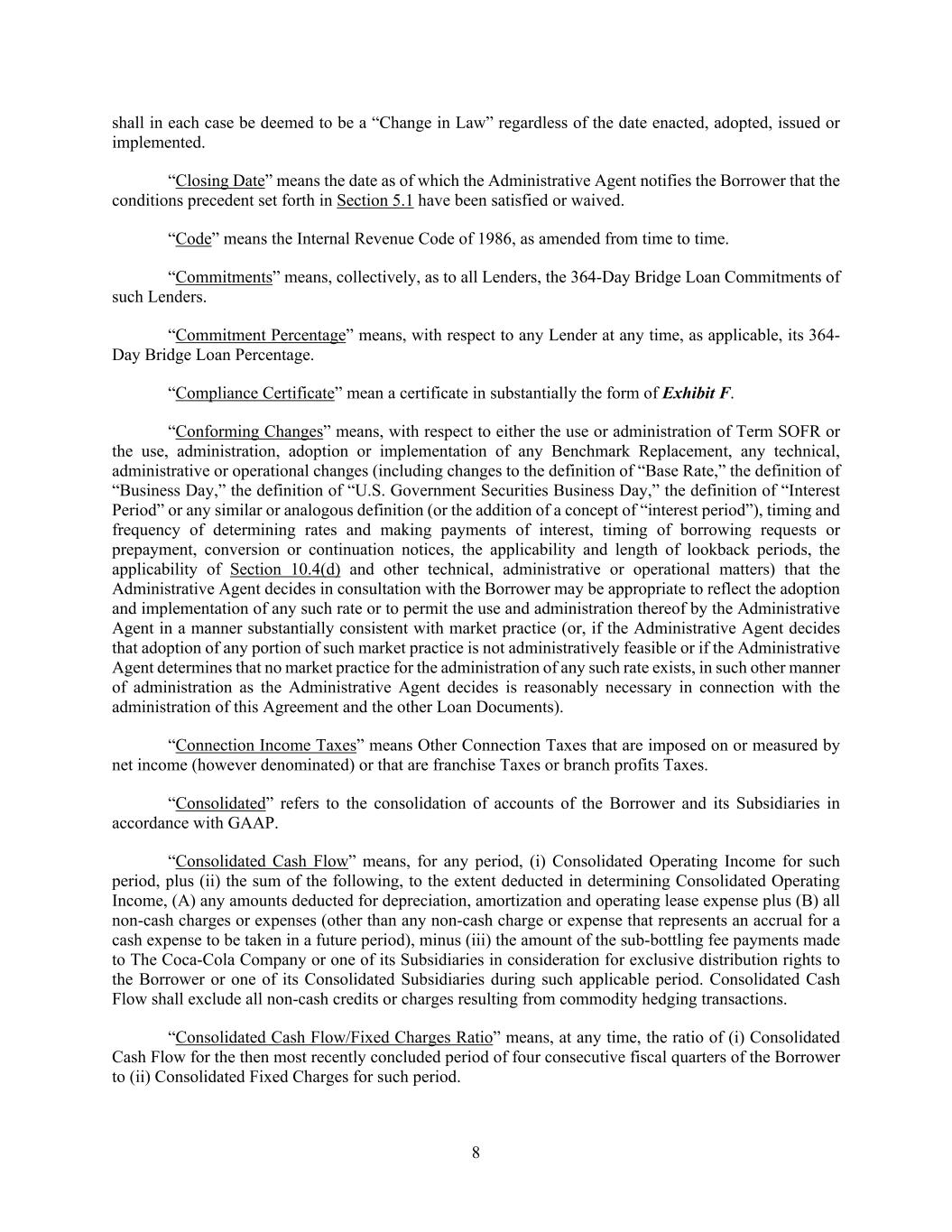 8 shall in each case be deemed to be a “Change in Law” regardless of the date enacted, adopted, issued or implemented. “Closing Date” means the date as of which the Administrative Agent notifies the Borrower that the conditions precedent set forth in Section 5.1 have been satisfied or waived. “Code” means the Internal Revenue Code of 1986, as amended from time to time. “Commitments” means, collectively, as to all Lenders, the 364-Day Bridge Loan Commitments of such Lenders. “Commitment Percentage” means, with respect to any Lender at any time, as applicable, its 364- Day Bridge Loan Percentage. “Compliance Certificate” mean a certificate in substantially the form of Exhibit F. “Conforming Changes” means, with respect to either the use or administration of Term SOFR or the use, administration, adoption or implementation of any Benchmark Replacement, any technical, administrative or operational changes (including changes to the definition of “Base Rate,” the definition of “Business Day,” the definition of “U.S. Government Securities Business Day,” the definition of “Interest Period” or any similar or analogous definition (or the addition of a concept of “interest period”), timing and frequency of determining rates and making payments of interest, timing of borrowing requests or prepayment, conversion or continuation notices, the applicability and length of lookback periods, the applicability of Section 10.4(d) and other technical, administrative or operational matters) that the Administrative Agent decides in consultation with the Borrower may be appropriate to reflect the adoption and implementation of any such rate or to permit the use and administration thereof by the Administrative Agent in a manner substantially consistent with market practice (or, if the Administrative Agent decides that adoption of any portion of such market practice is not administratively feasible or if the Administrative Agent determines that no market practice for the administration of any such rate exists, in such other manner of administration as the Administrative Agent decides is reasonably necessary in connection with the administration of this Agreement and the other Loan Documents). “Connection Income Taxes” means Other Connection Taxes that are imposed on or measured by net income (however denominated) or that are franchise Taxes or branch profits Taxes. “Consolidated” refers to the consolidation of accounts of the Borrower and its Subsidiaries in accordance with GAAP. “Consolidated Cash Flow” means, for any period, (i) Consolidated Operating Income for such period, plus (ii) the sum of the following, to the extent deducted in determining Consolidated Operating Income, (A) any amounts deducted for depreciation, amortization and operating lease expense plus (B) all non-cash charges or expenses (other than any non-cash charge or expense that represents an accrual for a cash expense to be taken in a future period), minus (iii) the amount of the sub-bottling fee payments made to The Coca-Cola Company or one of its Subsidiaries in consideration for exclusive distribution rights to the Borrower or one of its Consolidated Subsidiaries during such applicable period. Consolidated Cash Flow shall exclude all non-cash credits or charges resulting from commodity hedging transactions. “Consolidated Cash Flow/Fixed Charges Ratio” means, at any time, the ratio of (i) Consolidated Cash Flow for the then most recently concluded period of four consecutive fiscal quarters of the Borrower to (ii) Consolidated Fixed Charges for such period.