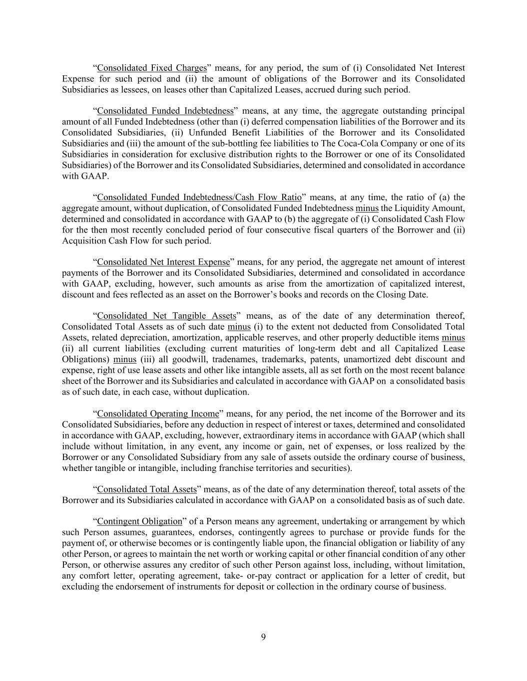 9 “Consolidated Fixed Charges” means, for any period, the sum of (i) Consolidated Net Interest Expense for such period and (ii) the amount of obligations of the Borrower and its Consolidated Subsidiaries as lessees, on leases other than Capitalized Leases, accrued during such period. “Consolidated Funded Indebtedness” means, at any time, the aggregate outstanding principal amount of all Funded Indebtedness (other than (i) deferred compensation liabilities of the Borrower and its Consolidated Subsidiaries, (ii) Unfunded Benefit Liabilities of the Borrower and its Consolidated Subsidiaries and (iii) the amount of the sub-bottling fee liabilities to The Coca-Cola Company or one of its Subsidiaries in consideration for exclusive distribution rights to the Borrower or one of its Consolidated Subsidiaries) of the Borrower and its Consolidated Subsidiaries, determined and consolidated in accordance with GAAP. “Consolidated Funded Indebtedness/Cash Flow Ratio” means, at any time, the ratio of (a) the aggregate amount, without duplication, of Consolidated Funded Indebtedness minus the Liquidity Amount, determined and consolidated in accordance with GAAP to (b) the aggregate of (i) Consolidated Cash Flow for the then most recently concluded period of four consecutive fiscal quarters of the Borrower and (ii) Acquisition Cash Flow for such period. “Consolidated Net Interest Expense” means, for any period, the aggregate net amount of interest payments of the Borrower and its Consolidated Subsidiaries, determined and consolidated in accordance with GAAP, excluding, however, such amounts as arise from the amortization of capitalized interest, discount and fees reflected as an asset on the Borrower’s books and records on the Closing Date. “Consolidated Net Tangible Assets” means, as of the date of any determination thereof, Consolidated Total Assets as of such date minus (i) to the extent not deducted from Consolidated Total Assets, related depreciation, amortization, applicable reserves, and other properly deductible items minus (ii) all current liabilities (excluding current maturities of long-term debt and all Capitalized Lease Obligations) minus (iii) all goodwill, tradenames, trademarks, patents, unamortized debt discount and expense, right of use lease assets and other like intangible assets, all as set forth on the most recent balance sheet of the Borrower and its Subsidiaries and calculated in accordance with GAAP on a consolidated basis as of such date, in each case, without duplication. “Consolidated Operating Income” means, for any period, the net income of the Borrower and its Consolidated Subsidiaries, before any deduction in respect of interest or taxes, determined and consolidated in accordance with GAAP, excluding, however, extraordinary items in accordance with GAAP (which shall include without limitation, in any event, any income or gain, net of expenses, or loss realized by the Borrower or any Consolidated Subsidiary from any sale of assets outside the ordinary course of business, whether tangible or intangible, including franchise territories and securities). “Consolidated Total Assets” means, as of the date of any determination thereof, total assets of the Borrower and its Subsidiaries calculated in accordance with GAAP on a consolidated basis as of such date. “Contingent Obligation” of a Person means any agreement, undertaking or arrangement by which such Person assumes, guarantees, endorses, contingently agrees to purchase or provide funds for the payment of, or otherwise becomes or is contingently liable upon, the financial obligation or liability of any other Person, or agrees to maintain the net worth or working capital or other financial condition of any other Person, or otherwise assures any creditor of such other Person against loss, including, without limitation, any comfort letter, operating agreement, take- or-pay contract or application for a letter of credit, but excluding the endorsement of instruments for deposit or collection in the ordinary course of business.
