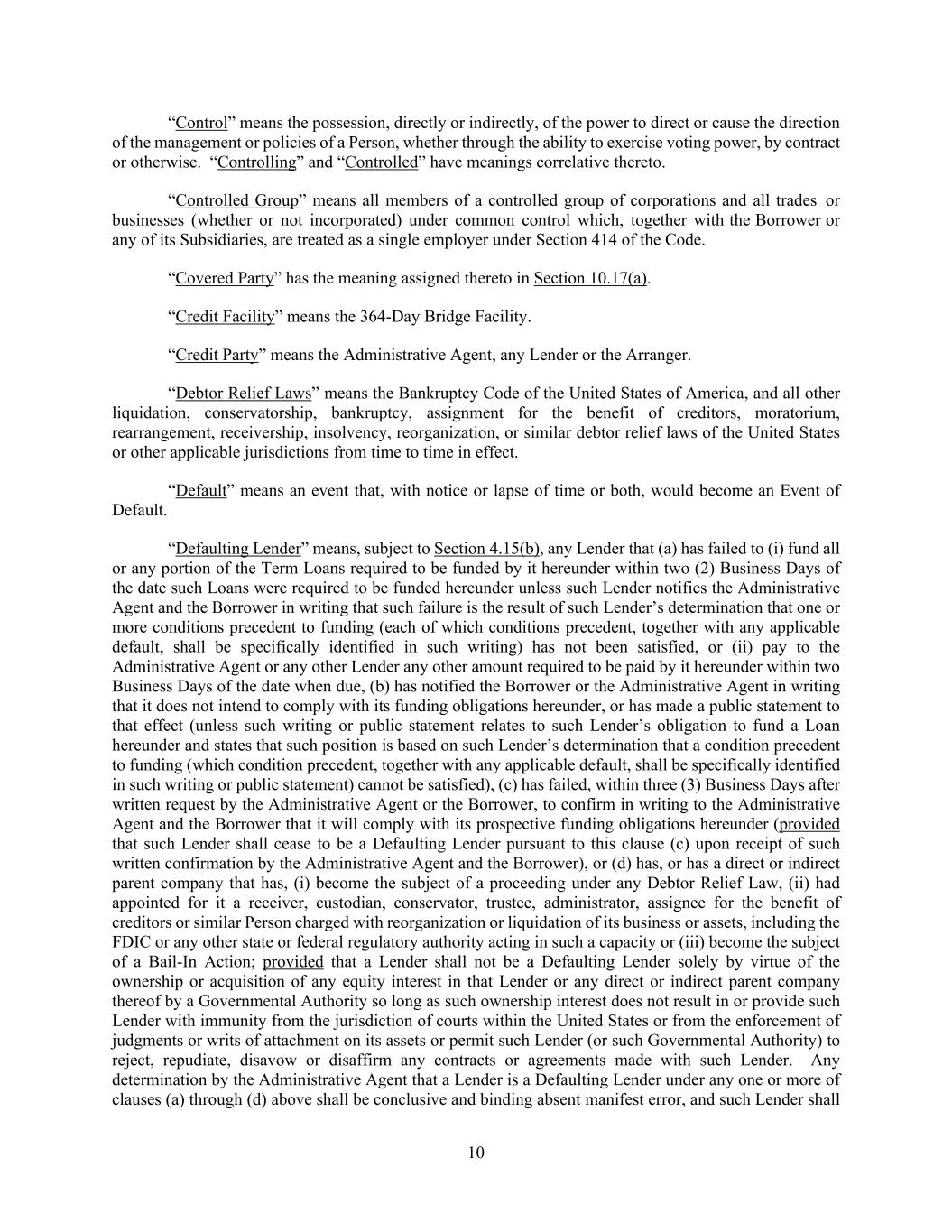 10 “Control” means the possession, directly or indirectly, of the power to direct or cause the direction of the management or policies of a Person, whether through the ability to exercise voting power, by contract or otherwise. “Controlling” and “Controlled” have meanings correlative thereto. “Controlled Group” means all members of a controlled group of corporations and all trades or businesses (whether or not incorporated) under common control which, together with the Borrower or any of its Subsidiaries, are treated as a single employer under Section 414 of the Code. “Covered Party” has the meaning assigned thereto in Section 10.17(a). “Credit Facility” means the 364-Day Bridge Facility. “Credit Party” means the Administrative Agent, any Lender or the Arranger. “Debtor Relief Laws” means the Bankruptcy Code of the United States of America, and all other liquidation, conservatorship, bankruptcy, assignment for the benefit of creditors, moratorium, rearrangement, receivership, insolvency, reorganization, or similar debtor relief laws of the United States or other applicable jurisdictions from time to time in effect. “Default” means an event that, with notice or lapse of time or both, would become an Event of Default. “Defaulting Lender” means, subject to Section 4.15(b), any Lender that (a) has failed to (i) fund all or any portion of the Term Loans required to be funded by it hereunder within two (2) Business Days of the date such Loans were required to be funded hereunder unless such Lender notifies the Administrative Agent and the Borrower in writing that such failure is the result of such Lender’s determination that one or more conditions precedent to funding (each of which conditions precedent, together with any applicable default, shall be specifically identified in such writing) has not been satisfied, or (ii) pay to the Administrative Agent or any other Lender any other amount required to be paid by it hereunder within two Business Days of the date when due, (b) has notified the Borrower or the Administrative Agent in writing that it does not intend to comply with its funding obligations hereunder, or has made a public statement to that effect (unless such writing or public statement relates to such Lender’s obligation to fund a Loan hereunder and states that such position is based on such Lender’s determination that a condition precedent to funding (which condition precedent, together with any applicable default, shall be specifically identified in such writing or public statement) cannot be satisfied), (c) has failed, within three (3) Business Days after written request by the Administrative Agent or the Borrower, to confirm in writing to the Administrative Agent and the Borrower that it will comply with its prospective funding obligations hereunder (provided that such Lender shall cease to be a Defaulting Lender pursuant to this clause (c) upon receipt of such written confirmation by the Administrative Agent and the Borrower), or (d) has, or has a direct or indirect parent company that has, (i) become the subject of a proceeding under any Debtor Relief Law, (ii) had appointed for it a receiver, custodian, conservator, trustee, administrator, assignee for the benefit of creditors or similar Person charged with reorganization or liquidation of its business or assets, including the FDIC or any other state or federal regulatory authority acting in such a capacity or (iii) become the subject of a Bail-In Action; provided that a Lender shall not be a Defaulting Lender solely by virtue of the ownership or acquisition of any equity interest in that Lender or any direct or indirect parent company thereof by a Governmental Authority so long as such ownership interest does not result in or provide such Lender with immunity from the jurisdiction of courts within the United States or from the enforcement of judgments or writs of attachment on its assets or permit such Lender (or such Governmental Authority) to reject, repudiate, disavow or disaffirm any contracts or agreements made with such Lender. Any determination by the Administrative Agent that a Lender is a Defaulting Lender under any one or more of clauses (a) through (d) above shall be conclusive and binding absent manifest error, and such Lender shall