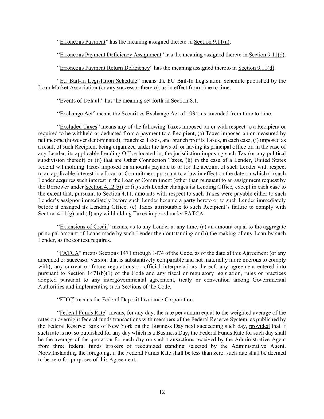 12 “Erroneous Payment” has the meaning assigned thereto in Section 9.11(a). “Erroneous Payment Deficiency Assignment” has the meaning assigned thereto in Section 9.11(d). “Erroneous Payment Return Deficiency” has the meaning assigned thereto in Section 9.11(d). “EU Bail-In Legislation Schedule” means the EU Bail-In Legislation Schedule published by the Loan Market Association (or any successor thereto), as in effect from time to time. “Events of Default” has the meaning set forth in Section 8.1. “Exchange Act” means the Securities Exchange Act of 1934, as amended from time to time. “Excluded Taxes” means any of the following Taxes imposed on or with respect to a Recipient or required to be withheld or deducted from a payment to a Recipient, (a) Taxes imposed on or measured by net income (however denominated), franchise Taxes, and branch profits Taxes, in each case, (i) imposed as a result of such Recipient being organized under the laws of, or having its principal office or, in the case of any Lender, its applicable Lending Office located in, the jurisdiction imposing such Tax (or any political subdivision thereof) or (ii) that are Other Connection Taxes, (b) in the case of a Lender, United States federal withholding Taxes imposed on amounts payable to or for the account of such Lender with respect to an applicable interest in a Loan or Commitment pursuant to a law in effect on the date on which (i) such Lender acquires such interest in the Loan or Commitment (other than pursuant to an assignment request by the Borrower under Section 4.12(b)) or (ii) such Lender changes its Lending Office, except in each case to the extent that, pursuant to Section 4.11, amounts with respect to such Taxes were payable either to such Lender’s assignor immediately before such Lender became a party hereto or to such Lender immediately before it changed its Lending Office, (c) Taxes attributable to such Recipient’s failure to comply with Section 4.11(g) and (d) any withholding Taxes imposed under FATCA. “Extensions of Credit” means, as to any Lender at any time, (a) an amount equal to the aggregate principal amount of Loans made by such Lender then outstanding or (b) the making of any Loan by such Lender, as the context requires. “FATCA” means Sections 1471 through 1474 of the Code, as of the date of this Agreement (or any amended or successor version that is substantively comparable and not materially more onerous to comply with), any current or future regulations or official interpretations thereof, any agreement entered into pursuant to Section 1471(b)(1) of the Code and any fiscal or regulatory legislation, rules or practices adopted pursuant to any intergovernmental agreement, treaty or convention among Governmental Authorities and implementing such Sections of the Code. “FDIC” means the Federal Deposit Insurance Corporation. “Federal Funds Rate” means, for any day, the rate per annum equal to the weighted average of the rates on overnight federal funds transactions with members of the Federal Reserve System, as published by the Federal Reserve Bank of New York on the Business Day next succeeding such day, provided that if such rate is not so published for any day which is a Business Day, the Federal Funds Rate for such day shall be the average of the quotation for such day on such transactions received by the Administrative Agent from three federal funds brokers of recognized standing selected by the Administrative Agent. Notwithstanding the foregoing, if the Federal Funds Rate shall be less than zero, such rate shall be deemed to be zero for purposes of this Agreement.