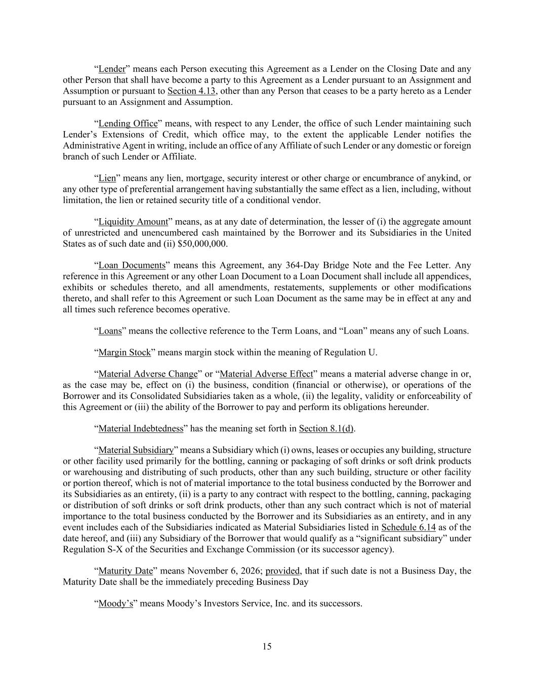 15 “Lender” means each Person executing this Agreement as a Lender on the Closing Date and any other Person that shall have become a party to this Agreement as a Lender pursuant to an Assignment and Assumption or pursuant to Section 4.13, other than any Person that ceases to be a party hereto as a Lender pursuant to an Assignment and Assumption. “Lending Office” means, with respect to any Lender, the office of such Lender maintaining such Lender’s Extensions of Credit, which office may, to the extent the applicable Lender notifies the Administrative Agent in writing, include an office of any Affiliate of such Lender or any domestic or foreign branch of such Lender or Affiliate. “Lien” means any lien, mortgage, security interest or other charge or encumbrance of any kind, or any other type of preferential arrangement having substantially the same effect as a lien, including, without limitation, the lien or retained security title of a conditional vendor. “Liquidity Amount” means, as at any date of determination, the lesser of (i) the aggregate amount of unrestricted and unencumbered cash maintained by the Borrower and its Subsidiaries in the United States as of such date and (ii) $50,000,000. “Loan Documents” means this Agreement, any 364-Day Bridge Note and the Fee Letter. Any reference in this Agreement or any other Loan Document to a Loan Document shall include all appendices, exhibits or schedules thereto, and all amendments, restatements, supplements or other modifications thereto, and shall refer to this Agreement or such Loan Document as the same may be in effect at any and all times such reference becomes operative. “Loans” means the collective reference to the Term Loans, and “Loan” means any of such Loans. “Margin Stock” means margin stock within the meaning of Regulation U. “Material Adverse Change” or “Material Adverse Effect” means a material adverse change in or, as the case may be, effect on (i) the business, condition (financial or otherwise), or operations of the Borrower and its Consolidated Subsidiaries taken as a whole, (ii) the legality, validity or enforceability of this Agreement or (iii) the ability of the Borrower to pay and perform its obligations hereunder. “Material Indebtedness” has the meaning set forth in Section 8.1(d). “Material Subsidiary” means a Subsidiary which (i) owns, leases or occupies any building, structure or other facility used primarily for the bottling, canning or packaging of soft drinks or soft drink products or warehousing and distributing of such products, other than any such building, structure or other facility or portion thereof, which is not of material importance to the total business conducted by the Borrower and its Subsidiaries as an entirety, (ii) is a party to any contract with respect to the bottling, canning, packaging or distribution of soft drinks or soft drink products, other than any such contract which is not of material importance to the total business conducted by the Borrower and its Subsidiaries as an entirety, and in any event includes each of the Subsidiaries indicated as Material Subsidiaries listed in Schedule 6.14 as of the date hereof, and (iii) any Subsidiary of the Borrower that would qualify as a “significant subsidiary” under Regulation S-X of the Securities and Exchange Commission (or its successor agency). “Maturity Date” means November 6, 2026; provided, that if such date is not a Business Day, the Maturity Date shall be the immediately preceding Business Day “Moody’s” means Moody’s Investors Service, Inc. and its successors.