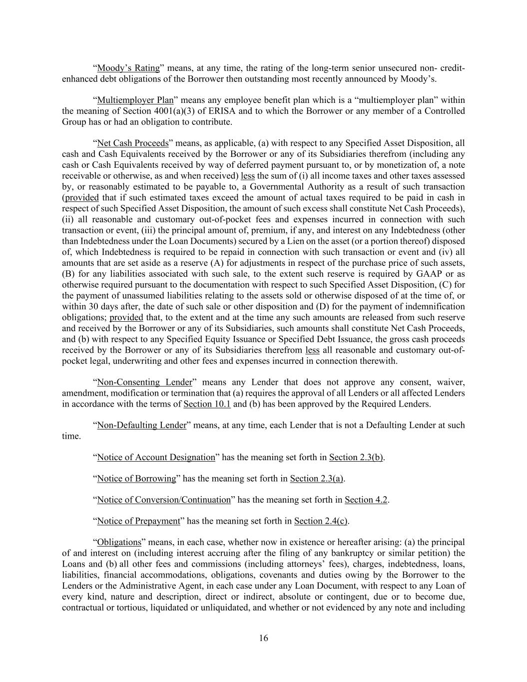 16 “Moody’s Rating” means, at any time, the rating of the long-term senior unsecured non- credit- enhanced debt obligations of the Borrower then outstanding most recently announced by Moody’s. “Multiemployer Plan” means any employee benefit plan which is a “multiemployer plan” within the meaning of Section 4001(a)(3) of ERISA and to which the Borrower or any member of a Controlled Group has or had an obligation to contribute. “Net Cash Proceeds” means, as applicable, (a) with respect to any Specified Asset Disposition, all cash and Cash Equivalents received by the Borrower or any of its Subsidiaries therefrom (including any cash or Cash Equivalents received by way of deferred payment pursuant to, or by monetization of, a note receivable or otherwise, as and when received) less the sum of (i) all income taxes and other taxes assessed by, or reasonably estimated to be payable to, a Governmental Authority as a result of such transaction (provided that if such estimated taxes exceed the amount of actual taxes required to be paid in cash in respect of such Specified Asset Disposition, the amount of such excess shall constitute Net Cash Proceeds), (ii) all reasonable and customary out-of-pocket fees and expenses incurred in connection with such transaction or event, (iii) the principal amount of, premium, if any, and interest on any Indebtedness (other than Indebtedness under the Loan Documents) secured by a Lien on the asset (or a portion thereof) disposed of, which Indebtedness is required to be repaid in connection with such transaction or event and (iv) all amounts that are set aside as a reserve (A) for adjustments in respect of the purchase price of such assets, (B) for any liabilities associated with such sale, to the extent such reserve is required by GAAP or as otherwise required pursuant to the documentation with respect to such Specified Asset Disposition, (C) for the payment of unassumed liabilities relating to the assets sold or otherwise disposed of at the time of, or within 30 days after, the date of such sale or other disposition and (D) for the payment of indemnification obligations; provided that, to the extent and at the time any such amounts are released from such reserve and received by the Borrower or any of its Subsidiaries, such amounts shall constitute Net Cash Proceeds, and (b) with respect to any Specified Equity Issuance or Specified Debt Issuance, the gross cash proceeds received by the Borrower or any of its Subsidiaries therefrom less all reasonable and customary out-of- pocket legal, underwriting and other fees and expenses incurred in connection therewith. “Non-Consenting Lender” means any Lender that does not approve any consent, waiver, amendment, modification or termination that (a) requires the approval of all Lenders or all affected Lenders in accordance with the terms of Section 10.1 and (b) has been approved by the Required Lenders. “Non-Defaulting Lender” means, at any time, each Lender that is not a Defaulting Lender at such time. “Notice of Account Designation” has the meaning set forth in Section 2.3(b). “Notice of Borrowing” has the meaning set forth in Section 2.3(a). “Notice of Conversion/Continuation” has the meaning set forth in Section 4.2. “Notice of Prepayment” has the meaning set forth in Section 2.4(c). “Obligations” means, in each case, whether now in existence or hereafter arising: (a) the principal of and interest on (including interest accruing after the filing of any bankruptcy or similar petition) the Loans and (b) all other fees and commissions (including attorneys’ fees), charges, indebtedness, loans, liabilities, financial accommodations, obligations, covenants and duties owing by the Borrower to the Lenders or the Administrative Agent, in each case under any Loan Document, with respect to any Loan of every kind, nature and description, direct or indirect, absolute or contingent, due or to become due, contractual or tortious, liquidated or unliquidated, and whether or not evidenced by any note and including