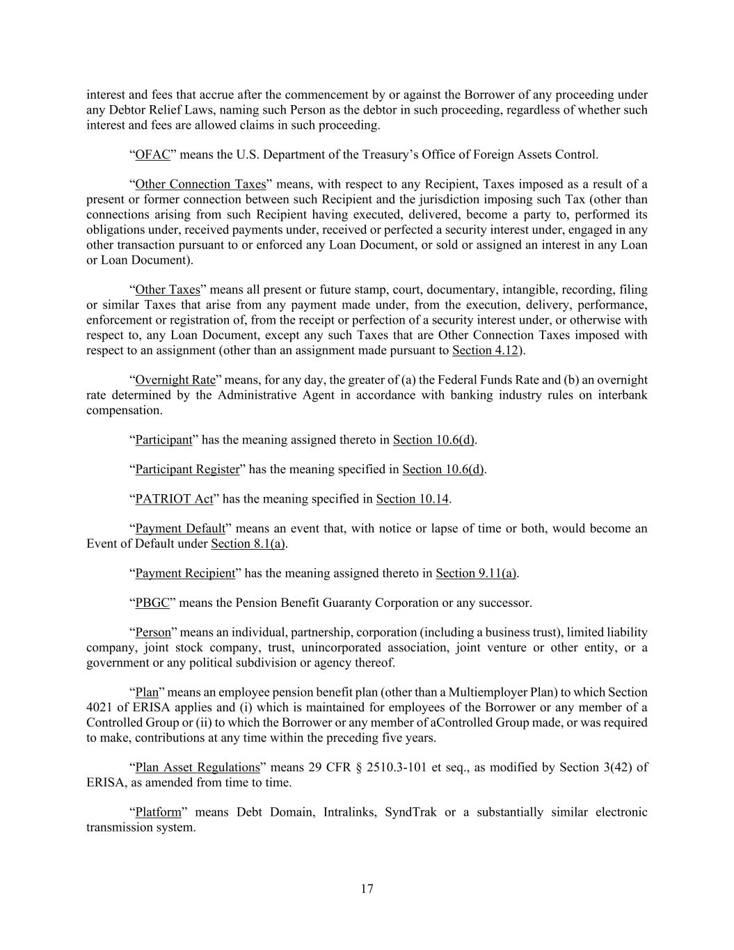 17 interest and fees that accrue after the commencement by or against the Borrower of any proceeding under any Debtor Relief Laws, naming such Person as the debtor in such proceeding, regardless of whether such interest and fees are allowed claims in such proceeding. “OFAC” means the U.S. Department of the Treasury’s Office of Foreign Assets Control. “Other Connection Taxes” means, with respect to any Recipient, Taxes imposed as a result of a present or former connection between such Recipient and the jurisdiction imposing such Tax (other than connections arising from such Recipient having executed, delivered, become a party to, performed its obligations under, received payments under, received or perfected a security interest under, engaged in any other transaction pursuant to or enforced any Loan Document, or sold or assigned an interest in any Loan or Loan Document). “Other Taxes” means all present or future stamp, court, documentary, intangible, recording, filing or similar Taxes that arise from any payment made under, from the execution, delivery, performance, enforcement or registration of, from the receipt or perfection of a security interest under, or otherwise with respect to, any Loan Document, except any such Taxes that are Other Connection Taxes imposed with respect to an assignment (other than an assignment made pursuant to Section 4.12). “Overnight Rate” means, for any day, the greater of (a) the Federal Funds Rate and (b) an overnight rate determined by the Administrative Agent in accordance with banking industry rules on interbank compensation. “Participant” has the meaning assigned thereto in Section 10.6(d). “Participant Register” has the meaning specified in Section 10.6(d). “PATRIOT Act” has the meaning specified in Section 10.14. “Payment Default” means an event that, with notice or lapse of time or both, would become an Event of Default under Section 8.1(a). “Payment Recipient” has the meaning assigned thereto in Section 9.11(a). “PBGC” means the Pension Benefit Guaranty Corporation or any successor. “Person” means an individual, partnership, corporation (including a business trust), limited liability company, joint stock company, trust, unincorporated association, joint venture or other entity, or a government or any political subdivision or agency thereof. “Plan” means an employee pension benefit plan (other than a Multiemployer Plan) to which Section 4021 of ERISA applies and (i) which is maintained for employees of the Borrower or any member of a Controlled Group or (ii) to which the Borrower or any member of a Controlled Group made, or was required to make, contributions at any time within the preceding five years. “Plan Asset Regulations” means 29 CFR § 2510.3-101 et seq., as modified by Section 3(42) of ERISA, as amended from time to time. “Platform” means Debt Domain, Intralinks, SyndTrak or a substantially similar electronic transmission system.