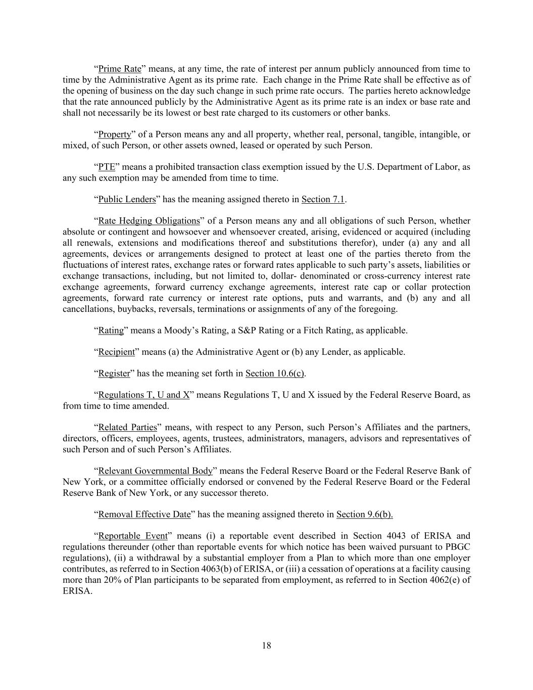 18 “Prime Rate” means, at any time, the rate of interest per annum publicly announced from time to time by the Administrative Agent as its prime rate. Each change in the Prime Rate shall be effective as of the opening of business on the day such change in such prime rate occurs. The parties hereto acknowledge that the rate announced publicly by the Administrative Agent as its prime rate is an index or base rate and shall not necessarily be its lowest or best rate charged to its customers or other banks. “Property” of a Person means any and all property, whether real, personal, tangible, intangible, or mixed, of such Person, or other assets owned, leased or operated by such Person. “PTE” means a prohibited transaction class exemption issued by the U.S. Department of Labor, as any such exemption may be amended from time to time. “Public Lenders” has the meaning assigned thereto in Section 7.1. “Rate Hedging Obligations” of a Person means any and all obligations of such Person, whether absolute or contingent and howsoever and whensoever created, arising, evidenced or acquired (including all renewals, extensions and modifications thereof and substitutions therefor), under (a) any and all agreements, devices or arrangements designed to protect at least one of the parties thereto from the fluctuations of interest rates, exchange rates or forward rates applicable to such party’s assets, liabilities or exchange transactions, including, but not limited to, dollar- denominated or cross-currency interest rate exchange agreements, forward currency exchange agreements, interest rate cap or collar protection agreements, forward rate currency or interest rate options, puts and warrants, and (b) any and all cancellations, buybacks, reversals, terminations or assignments of any of the foregoing. “Rating” means a Moody’s Rating, a S&P Rating or a Fitch Rating, as applicable. “Recipient” means (a) the Administrative Agent or (b) any Lender, as applicable. “Register” has the meaning set forth in Section 10.6(c). “Regulations T, U and X” means Regulations T, U and X issued by the Federal Reserve Board, as from time to time amended. “Related Parties” means, with respect to any Person, such Person’s Affiliates and the partners, directors, officers, employees, agents, trustees, administrators, managers, advisors and representatives of such Person and of such Person’s Affiliates. “Relevant Governmental Body” means the Federal Reserve Board or the Federal Reserve Bank of New York, or a committee officially endorsed or convened by the Federal Reserve Board or the Federal Reserve Bank of New York, or any successor thereto. “Removal Effective Date” has the meaning assigned thereto in Section 9.6(b). “Reportable Event” means (i) a reportable event described in Section 4043 of ERISA and regulations thereunder (other than reportable events for which notice has been waived pursuant to PBGC regulations), (ii) a withdrawal by a substantial employer from a Plan to which more than one employer contributes, as referred to in Section 4063(b) of ERISA, or (iii) a cessation of operations at a facility causing more than 20% of Plan participants to be separated from employment, as referred to in Section 4062(e) of ERISA.