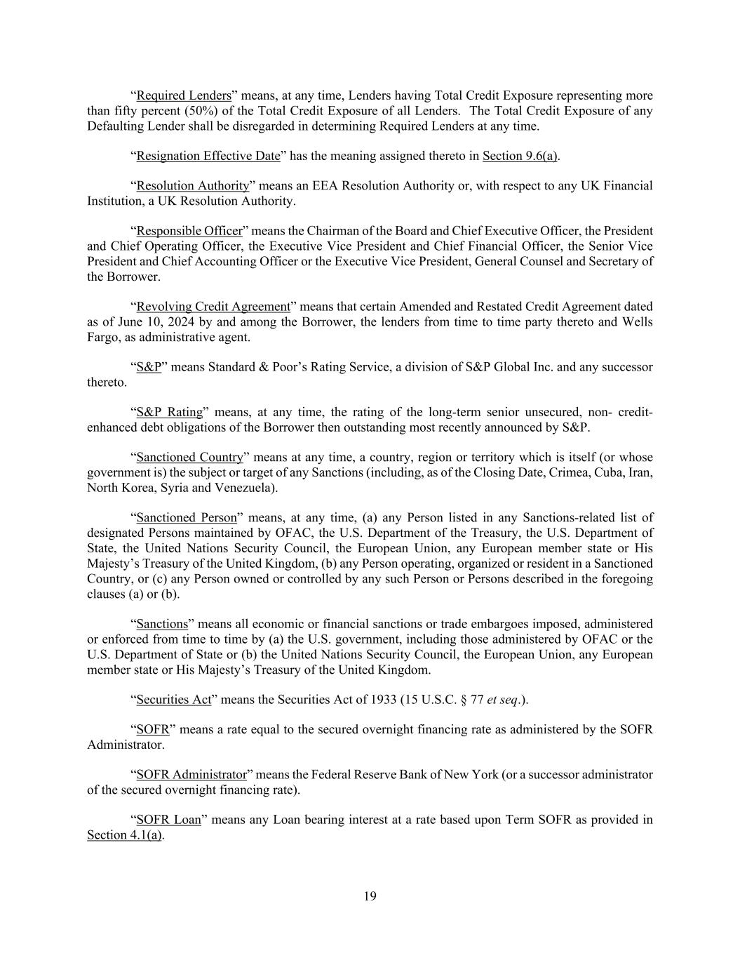 19 “Required Lenders” means, at any time, Lenders having Total Credit Exposure representing more than fifty percent (50%) of the Total Credit Exposure of all Lenders. The Total Credit Exposure of any Defaulting Lender shall be disregarded in determining Required Lenders at any time. “Resignation Effective Date” has the meaning assigned thereto in Section 9.6(a). “Resolution Authority” means an EEA Resolution Authority or, with respect to any UK Financial Institution, a UK Resolution Authority. “Responsible Officer” means the Chairman of the Board and Chief Executive Officer, the President and Chief Operating Officer, the Executive Vice President and Chief Financial Officer, the Senior Vice President and Chief Accounting Officer or the Executive Vice President, General Counsel and Secretary of the Borrower. “Revolving Credit Agreement” means that certain Amended and Restated Credit Agreement dated as of June 10, 2024 by and among the Borrower, the lenders from time to time party thereto and Wells Fargo, as administrative agent. “S&P” means Standard & Poor’s Rating Service, a division of S&P Global Inc. and any successor thereto. “S&P Rating” means, at any time, the rating of the long-term senior unsecured, non- credit- enhanced debt obligations of the Borrower then outstanding most recently announced by S&P. “Sanctioned Country” means at any time, a country, region or territory which is itself (or whose government is) the subject or target of any Sanctions (including, as of the Closing Date, Crimea, Cuba, Iran, North Korea, Syria and Venezuela). “Sanctioned Person” means, at any time, (a) any Person listed in any Sanctions-related list of designated Persons maintained by OFAC, the U.S. Department of the Treasury, the U.S. Department of State, the United Nations Security Council, the European Union, any European member state or His Majesty’s Treasury of the United Kingdom, (b) any Person operating, organized or resident in a Sanctioned Country, or (c) any Person owned or controlled by any such Person or Persons described in the foregoing clauses (a) or (b). “Sanctions” means all economic or financial sanctions or trade embargoes imposed, administered or enforced from time to time by (a) the U.S. government, including those administered by OFAC or the U.S. Department of State or (b) the United Nations Security Council, the European Union, any European member state or His Majesty’s Treasury of the United Kingdom. “Securities Act” means the Securities Act of 1933 (15 U.S.C. § 77 et seq.). “SOFR” means a rate equal to the secured overnight financing rate as administered by the SOFR Administrator. “SOFR Administrator” means the Federal Reserve Bank of New York (or a successor administrator of the secured overnight financing rate). “SOFR Loan” means any Loan bearing interest at a rate based upon Term SOFR as provided in Section 4.1(a).