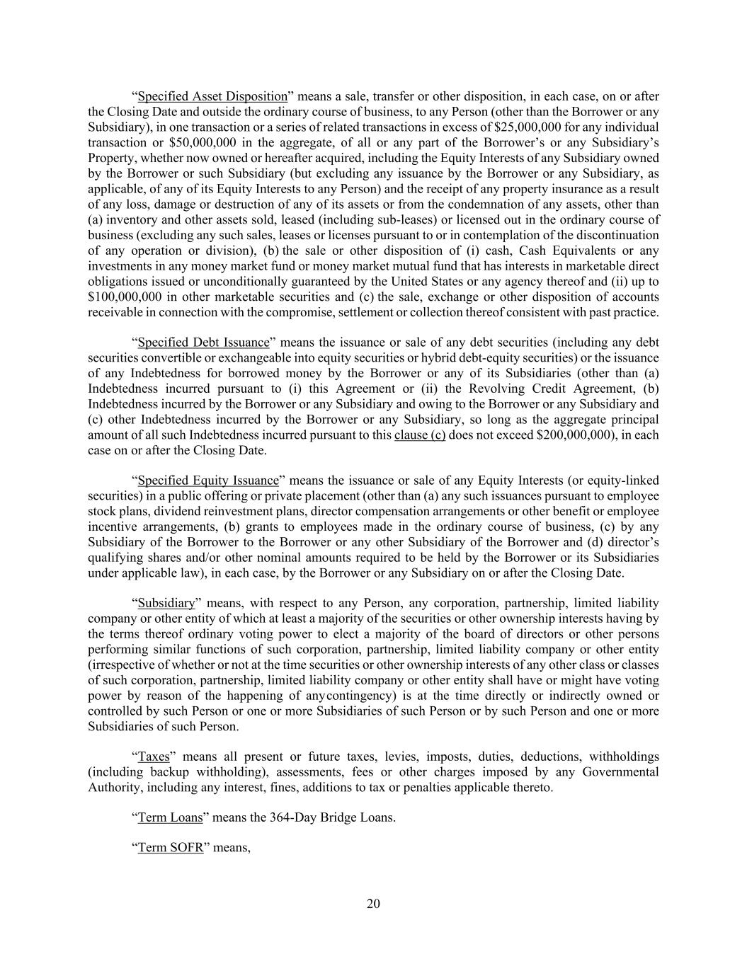 20 “Specified Asset Disposition” means a sale, transfer or other disposition, in each case, on or after the Closing Date and outside the ordinary course of business, to any Person (other than the Borrower or any Subsidiary), in one transaction or a series of related transactions in excess of $25,000,000 for any individual transaction or $50,000,000 in the aggregate, of all or any part of the Borrower’s or any Subsidiary’s Property, whether now owned or hereafter acquired, including the Equity Interests of any Subsidiary owned by the Borrower or such Subsidiary (but excluding any issuance by the Borrower or any Subsidiary, as applicable, of any of its Equity Interests to any Person) and the receipt of any property insurance as a result of any loss, damage or destruction of any of its assets or from the condemnation of any assets, other than (a) inventory and other assets sold, leased (including sub-leases) or licensed out in the ordinary course of business (excluding any such sales, leases or licenses pursuant to or in contemplation of the discontinuation of any operation or division), (b) the sale or other disposition of (i) cash, Cash Equivalents or any investments in any money market fund or money market mutual fund that has interests in marketable direct obligations issued or unconditionally guaranteed by the United States or any agency thereof and (ii) up to $100,000,000 in other marketable securities and (c) the sale, exchange or other disposition of accounts receivable in connection with the compromise, settlement or collection thereof consistent with past practice. “Specified Debt Issuance” means the issuance or sale of any debt securities (including any debt securities convertible or exchangeable into equity securities or hybrid debt-equity securities) or the issuance of any Indebtedness for borrowed money by the Borrower or any of its Subsidiaries (other than (a) Indebtedness incurred pursuant to (i) this Agreement or (ii) the Revolving Credit Agreement, (b) Indebtedness incurred by the Borrower or any Subsidiary and owing to the Borrower or any Subsidiary and (c) other Indebtedness incurred by the Borrower or any Subsidiary, so long as the aggregate principal amount of all such Indebtedness incurred pursuant to this clause (c) does not exceed $200,000,000), in each case on or after the Closing Date. “Specified Equity Issuance” means the issuance or sale of any Equity Interests (or equity-linked securities) in a public offering or private placement (other than (a) any such issuances pursuant to employee stock plans, dividend reinvestment plans, director compensation arrangements or other benefit or employee incentive arrangements, (b) grants to employees made in the ordinary course of business, (c) by any Subsidiary of the Borrower to the Borrower or any other Subsidiary of the Borrower and (d) director’s qualifying shares and/or other nominal amounts required to be held by the Borrower or its Subsidiaries under applicable law), in each case, by the Borrower or any Subsidiary on or after the Closing Date. “Subsidiary” means, with respect to any Person, any corporation, partnership, limited liability company or other entity of which at least a majority of the securities or other ownership interests having by the terms thereof ordinary voting power to elect a majority of the board of directors or other persons performing similar functions of such corporation, partnership, limited liability company or other entity (irrespective of whether or not at the time securities or other ownership interests of any other class or classes of such corporation, partnership, limited liability company or other entity shall have or might have voting power by reason of the happening of any contingency) is at the time directly or indirectly owned or controlled by such Person or one or more Subsidiaries of such Person or by such Person and one or more Subsidiaries of such Person. “Taxes” means all present or future taxes, levies, imposts, duties, deductions, withholdings (including backup withholding), assessments, fees or other charges imposed by any Governmental Authority, including any interest, fines, additions to tax or penalties applicable thereto. “Term Loans” means the 364-Day Bridge Loans. “Term SOFR” means,