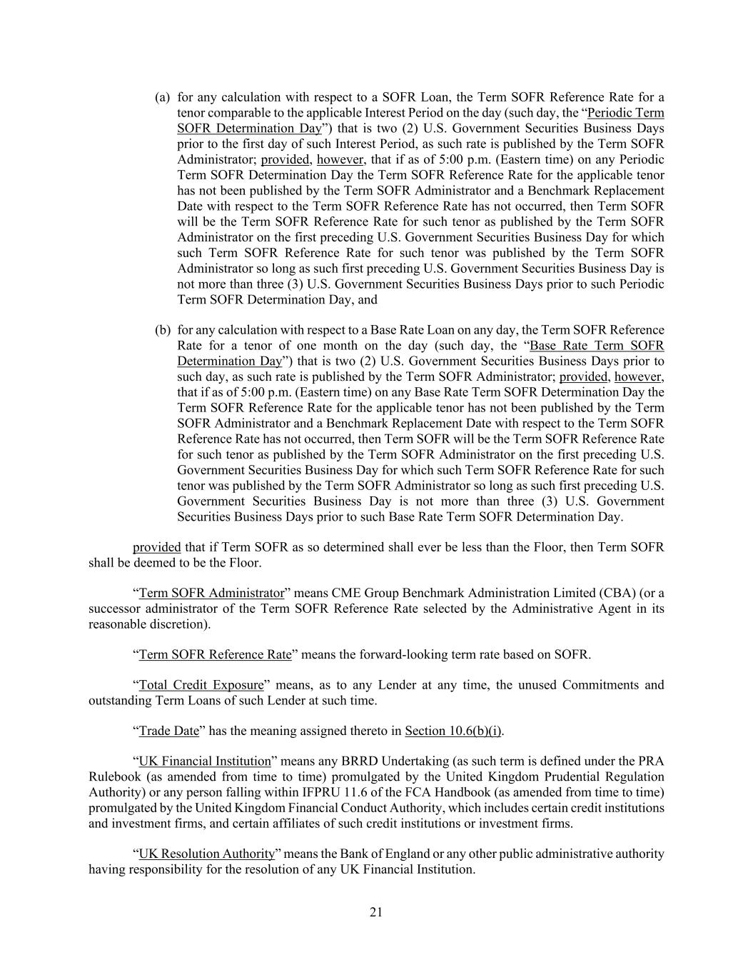 21 (a) for any calculation with respect to a SOFR Loan, the Term SOFR Reference Rate for a tenor comparable to the applicable Interest Period on the day (such day, the “Periodic Term SOFR Determination Day”) that is two (2) U.S. Government Securities Business Days prior to the first day of such Interest Period, as such rate is published by the Term SOFR Administrator; provided, however, that if as of 5:00 p.m. (Eastern time) on any Periodic Term SOFR Determination Day the Term SOFR Reference Rate for the applicable tenor has not been published by the Term SOFR Administrator and a Benchmark Replacement Date with respect to the Term SOFR Reference Rate has not occurred, then Term SOFR will be the Term SOFR Reference Rate for such tenor as published by the Term SOFR Administrator on the first preceding U.S. Government Securities Business Day for which such Term SOFR Reference Rate for such tenor was published by the Term SOFR Administrator so long as such first preceding U.S. Government Securities Business Day is not more than three (3) U.S. Government Securities Business Days prior to such Periodic Term SOFR Determination Day, and (b) for any calculation with respect to a Base Rate Loan on any day, the Term SOFR Reference Rate for a tenor of one month on the day (such day, the “Base Rate Term SOFR Determination Day”) that is two (2) U.S. Government Securities Business Days prior to such day, as such rate is published by the Term SOFR Administrator; provided, however, that if as of 5:00 p.m. (Eastern time) on any Base Rate Term SOFR Determination Day the Term SOFR Reference Rate for the applicable tenor has not been published by the Term SOFR Administrator and a Benchmark Replacement Date with respect to the Term SOFR Reference Rate has not occurred, then Term SOFR will be the Term SOFR Reference Rate for such tenor as published by the Term SOFR Administrator on the first preceding U.S. Government Securities Business Day for which such Term SOFR Reference Rate for such tenor was published by the Term SOFR Administrator so long as such first preceding U.S. Government Securities Business Day is not more than three (3) U.S. Government Securities Business Days prior to such Base Rate Term SOFR Determination Day. provided that if Term SOFR as so determined shall ever be less than the Floor, then Term SOFR shall be deemed to be the Floor. “Term SOFR Administrator” means CME Group Benchmark Administration Limited (CBA) (or a successor administrator of the Term SOFR Reference Rate selected by the Administrative Agent in its reasonable discretion). “Term SOFR Reference Rate” means the forward-looking term rate based on SOFR. “Total Credit Exposure” means, as to any Lender at any time, the unused Commitments and outstanding Term Loans of such Lender at such time. “Trade Date” has the meaning assigned thereto in Section 10.6(b)(i). “UK Financial Institution” means any BRRD Undertaking (as such term is defined under the PRA Rulebook (as amended from time to time) promulgated by the United Kingdom Prudential Regulation Authority) or any person falling within IFPRU 11.6 of the FCA Handbook (as amended from time to time) promulgated by the United Kingdom Financial Conduct Authority, which includes certain credit institutions and investment firms, and certain affiliates of such credit institutions or investment firms. “UK Resolution Authority” means the Bank of England or any other public administrative authority having responsibility for the resolution of any UK Financial Institution.