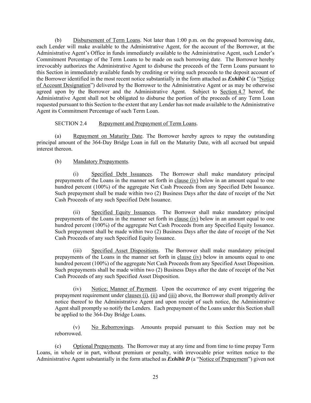 25 (b) Disbursement of Term Loans. Not later than 1:00 p.m. on the proposed borrowing date, each Lender will make available to the Administrative Agent, for the account of the Borrower, at the Administrative Agent’s Office in funds immediately available to the Administrative Agent, such Lender’s Commitment Percentage of the Term Loans to be made on such borrowing date. The Borrower hereby irrevocably authorizes the Administrative Agent to disburse the proceeds of the Term Loans pursuant to this Section in immediately available funds by crediting or wiring such proceeds to the deposit account of the Borrower identified in the most recent notice substantially in the form attached as Exhibit C (a “Notice of Account Designation”) delivered by the Borrower to the Administrative Agent or as may be otherwise agreed upon by the Borrower and the Administrative Agent. Subject to Section 4.7 hereof, the Administrative Agent shall not be obligated to disburse the portion of the proceeds of any Term Loan requested pursuant to this Section to the extent that any Lender has not made available to the Administrative Agent its Commitment Percentage of such Term Loan. SECTION 2.4 Repayment and Prepayment of Term Loans. (a) Repayment on Maturity Date. The Borrower hereby agrees to repay the outstanding principal amount of the 364-Day Bridge Loan in full on the Maturity Date, with all accrued but unpaid interest thereon. (b) Mandatory Prepayments. (i) Specified Debt Issuances. The Borrower shall make mandatory principal prepayments of the Loans in the manner set forth in clause (iv) below in an amount equal to one hundred percent (100%) of the aggregate Net Cash Proceeds from any Specified Debt Issuance. Such prepayment shall be made within two (2) Business Days after the date of receipt of the Net Cash Proceeds of any such Specified Debt Issuance. (ii) Specified Equity Issuances. The Borrower shall make mandatory principal prepayments of the Loans in the manner set forth in clause (iv) below in an amount equal to one hundred percent (100%) of the aggregate Net Cash Proceeds from any Specified Equity Issuance. Such prepayment shall be made within two (2) Business Days after the date of receipt of the Net Cash Proceeds of any such Specified Equity Issuance. (iii) Specified Asset Dispositions. The Borrower shall make mandatory principal prepayments of the Loans in the manner set forth in clause (iv) below in amounts equal to one hundred percent (100%) of the aggregate Net Cash Proceeds from any Specified Asset Disposition. Such prepayments shall be made within two (2) Business Days after the date of receipt of the Net Cash Proceeds of any such Specified Asset Disposition. (iv) Notice; Manner of Payment. Upon the occurrence of any event triggering the prepayment requirement under clauses (i), (ii) and (iii) above, the Borrower shall promptly deliver notice thereof to the Administrative Agent and upon receipt of such notice, the Administrative Agent shall promptly so notify the Lenders. Each prepayment of the Loans under this Section shall be applied to the 364-Day Bridge Loans. (v) No Reborrowings. Amounts prepaid pursuant to this Section may not be reborrowed. (c) Optional Prepayments. The Borrower may at any time and from time to time prepay Term Loans, in whole or in part, without premium or penalty, with irrevocable prior written notice to the Administrative Agent substantially in the form attached as Exhibit D (a “Notice of Prepayment”) given not