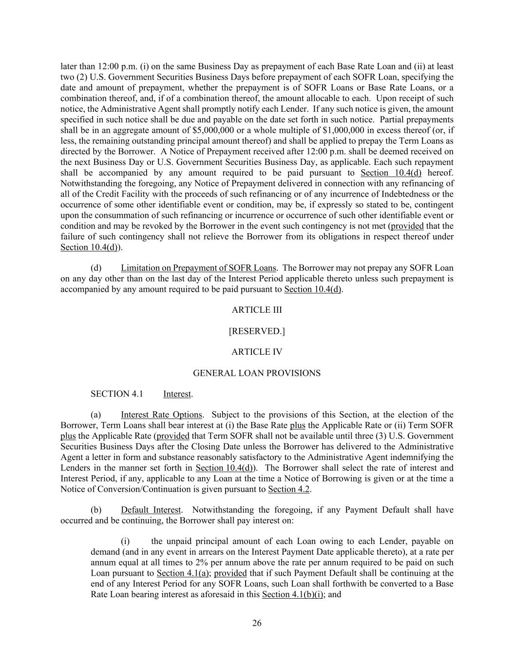 26 later than 12:00 p.m. (i) on the same Business Day as prepayment of each Base Rate Loan and (ii) at least two (2) U.S. Government Securities Business Days before prepayment of each SOFR Loan, specifying the date and amount of prepayment, whether the prepayment is of SOFR Loans or Base Rate Loans, or a combination thereof, and, if of a combination thereof, the amount allocable to each. Upon receipt of such notice, the Administrative Agent shall promptly notify each Lender. If any such notice is given, the amount specified in such notice shall be due and payable on the date set forth in such notice. Partial prepayments shall be in an aggregate amount of $5,000,000 or a whole multiple of $1,000,000 in excess thereof (or, if less, the remaining outstanding principal amount thereof) and shall be applied to prepay the Term Loans as directed by the Borrower. A Notice of Prepayment received after 12:00 p.m. shall be deemed received on the next Business Day or U.S. Government Securities Business Day, as applicable. Each such repayment shall be accompanied by any amount required to be paid pursuant to Section 10.4(d) hereof. Notwithstanding the foregoing, any Notice of Prepayment delivered in connection with any refinancing of all of the Credit Facility with the proceeds of such refinancing or of any incurrence of Indebtedness or the occurrence of some other identifiable event or condition, may be, if expressly so stated to be, contingent upon the consummation of such refinancing or incurrence or occurrence of such other identifiable event or condition and may be revoked by the Borrower in the event such contingency is not met (provided that the failure of such contingency shall not relieve the Borrower from its obligations in respect thereof under Section 10.4(d)). (d) Limitation on Prepayment of SOFR Loans. The Borrower may not prepay any SOFR Loan on any day other than on the last day of the Interest Period applicable thereto unless such prepayment is accompanied by any amount required to be paid pursuant to Section 10.4(d). ARTICLE III [RESERVED.] ARTICLE IV GENERAL LOAN PROVISIONS SECTION 4.1 Interest. (a) Interest Rate Options. Subject to the provisions of this Section, at the election of the Borrower, Term Loans shall bear interest at (i) the Base Rate plus the Applicable Rate or (ii) Term SOFR plus the Applicable Rate (provided that Term SOFR shall not be available until three (3) U.S. Government Securities Business Days after the Closing Date unless the Borrower has delivered to the Administrative Agent a letter in form and substance reasonably satisfactory to the Administrative Agent indemnifying the Lenders in the manner set forth in Section 10.4(d)). The Borrower shall select the rate of interest and Interest Period, if any, applicable to any Loan at the time a Notice of Borrowing is given or at the time a Notice of Conversion/Continuation is given pursuant to Section 4.2. (b) Default Interest. Notwithstanding the foregoing, if any Payment Default shall have occurred and be continuing, the Borrower shall pay interest on: (i) the unpaid principal amount of each Loan owing to each Lender, payable on demand (and in any event in arrears on the Interest Payment Date applicable thereto), at a rate per annum equal at all times to 2% per annum above the rate per annum required to be paid on such Loan pursuant to Section 4.1(a); provided that if such Payment Default shall be continuing at the end of any Interest Period for any SOFR Loans, such Loan shall forthwith be converted to a Base Rate Loan bearing interest as aforesaid in this Section 4.1(b)(i); and