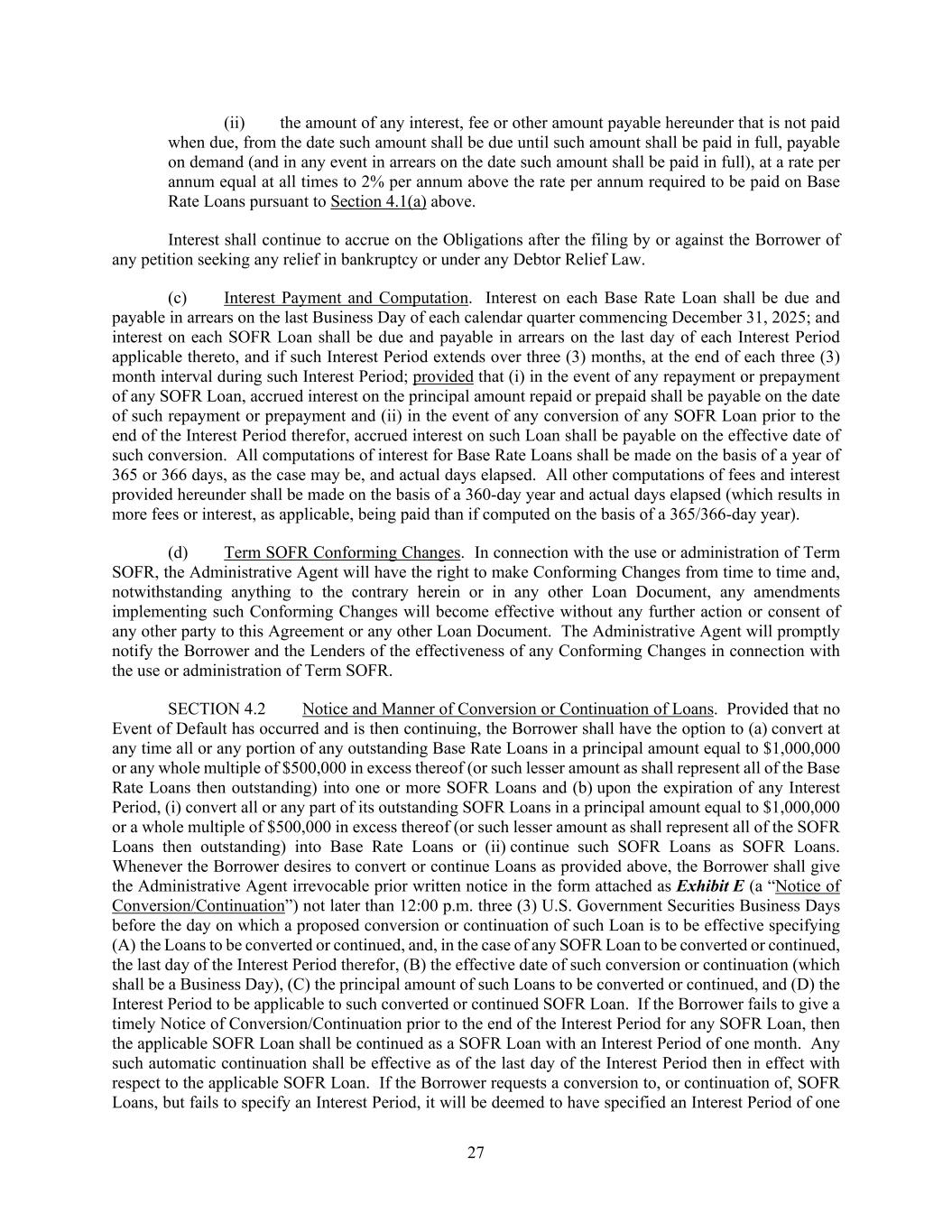 27 (ii) the amount of any interest, fee or other amount payable hereunder that is not paid when due, from the date such amount shall be due until such amount shall be paid in full, payable on demand (and in any event in arrears on the date such amount shall be paid in full), at a rate per annum equal at all times to 2% per annum above the rate per annum required to be paid on Base Rate Loans pursuant to Section 4.1(a) above. Interest shall continue to accrue on the Obligations after the filing by or against the Borrower of any petition seeking any relief in bankruptcy or under any Debtor Relief Law. (c) Interest Payment and Computation. Interest on each Base Rate Loan shall be due and payable in arrears on the last Business Day of each calendar quarter commencing December 31, 2025; and interest on each SOFR Loan shall be due and payable in arrears on the last day of each Interest Period applicable thereto, and if such Interest Period extends over three (3) months, at the end of each three (3) month interval during such Interest Period; provided that (i) in the event of any repayment or prepayment of any SOFR Loan, accrued interest on the principal amount repaid or prepaid shall be payable on the date of such repayment or prepayment and (ii) in the event of any conversion of any SOFR Loan prior to the end of the Interest Period therefor, accrued interest on such Loan shall be payable on the effective date of such conversion. All computations of interest for Base Rate Loans shall be made on the basis of a year of 365 or 366 days, as the case may be, and actual days elapsed. All other computations of fees and interest provided hereunder shall be made on the basis of a 360-day year and actual days elapsed (which results in more fees or interest, as applicable, being paid than if computed on the basis of a 365/366-day year). (d) Term SOFR Conforming Changes. In connection with the use or administration of Term SOFR, the Administrative Agent will have the right to make Conforming Changes from time to time and, notwithstanding anything to the contrary herein or in any other Loan Document, any amendments implementing such Conforming Changes will become effective without any further action or consent of any other party to this Agreement or any other Loan Document. The Administrative Agent will promptly notify the Borrower and the Lenders of the effectiveness of any Conforming Changes in connection with the use or administration of Term SOFR. SECTION 4.2 Notice and Manner of Conversion or Continuation of Loans. Provided that no Event of Default has occurred and is then continuing, the Borrower shall have the option to (a) convert at any time all or any portion of any outstanding Base Rate Loans in a principal amount equal to $1,000,000 or any whole multiple of $500,000 in excess thereof (or such lesser amount as shall represent all of the Base Rate Loans then outstanding) into one or more SOFR Loans and (b) upon the expiration of any Interest Period, (i) convert all or any part of its outstanding SOFR Loans in a principal amount equal to $1,000,000 or a whole multiple of $500,000 in excess thereof (or such lesser amount as shall represent all of the SOFR Loans then outstanding) into Base Rate Loans or (ii) continue such SOFR Loans as SOFR Loans. Whenever the Borrower desires to convert or continue Loans as provided above, the Borrower shall give the Administrative Agent irrevocable prior written notice in the form attached as Exhibit E (a “Notice of Conversion/Continuation”) not later than 12:00 p.m. three (3) U.S. Government Securities Business Days before the day on which a proposed conversion or continuation of such Loan is to be effective specifying (A) the Loans to be converted or continued, and, in the case of any SOFR Loan to be converted or continued, the last day of the Interest Period therefor, (B) the effective date of such conversion or continuation (which shall be a Business Day), (C) the principal amount of such Loans to be converted or continued, and (D) the Interest Period to be applicable to such converted or continued SOFR Loan. If the Borrower fails to give a timely Notice of Conversion/Continuation prior to the end of the Interest Period for any SOFR Loan, then the applicable SOFR Loan shall be continued as a SOFR Loan with an Interest Period of one month. Any such automatic continuation shall be effective as of the last day of the Interest Period then in effect with respect to the applicable SOFR Loan. If the Borrower requests a conversion to, or continuation of, SOFR Loans, but fails to specify an Interest Period, it will be deemed to have specified an Interest Period of one