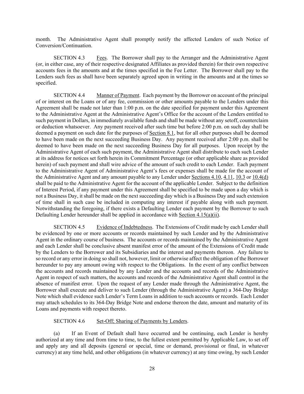 28 month. The Administrative Agent shall promptly notify the affected Lenders of such Notice of Conversion/Continuation. SECTION 4.3 Fees. The Borrower shall pay to the Arranger and the Administrative Agent (or, in either case, any of their respective designated Affiliates as provided therein) for their own respective accounts fees in the amounts and at the times specified in the Fee Letter. The Borrower shall pay to the Lenders such fees as shall have been separately agreed upon in writing in the amounts and at the times so specified. SECTION 4.4 Manner of Payment. Each payment by the Borrower on account of the principal of or interest on the Loans or of any fee, commission or other amounts payable to the Lenders under this Agreement shall be made not later than 1:00 p.m. on the date specified for payment under this Agreement to the Administrative Agent at the Administrative Agent’s Office for the account of the Lenders entitled to such payment in Dollars, in immediately available funds and shall be made without any setoff, counterclaim or deduction whatsoever. Any payment received after such time but before 2:00 p.m. on such day shall be deemed a payment on such date for the purposes of Section 8.1, but for all other purposes shall be deemed to have been made on the next succeeding Business Day. Any payment received after 2:00 p.m. shall be deemed to have been made on the next succeeding Business Day for all purposes. Upon receipt by the Administrative Agent of each such payment, the Administrative Agent shall distribute to each such Lender at its address for notices set forth herein its Commitment Percentage (or other applicable share as provided herein) of such payment and shall wire advice of the amount of such credit to each Lender. Each payment to the Administrative Agent of Administrative Agent’s fees or expenses shall be made for the account of the Administrative Agent and any amount payable to any Lender under Sections 4.10, 4.11, 10.3 or 10.4(d) shall be paid to the Administrative Agent for the account of the applicable Lender. Subject to the definition of Interest Period, if any payment under this Agreement shall be specified to be made upon a day which is not a Business Day, it shall be made on the next succeeding day which is a Business Day and such extension of time shall in such case be included in computing any interest if payable along with such payment. Notwithstanding the foregoing, if there exists a Defaulting Lender each payment by the Borrower to such Defaulting Lender hereunder shall be applied in accordance with Section 4.15(a)(ii). SECTION 4.5 Evidence of Indebtedness. The Extensions of Credit made by each Lender shall be evidenced by one or more accounts or records maintained by such Lender and by the Administrative Agent in the ordinary course of business. The accounts or records maintained by the Administrative Agent and each Lender shall be conclusive absent manifest error of the amount of the Extensions of Credit made by the Lenders to the Borrower and its Subsidiaries and the interest and payments thereon. Any failure to so record or any error in doing so shall not, however, limit or otherwise affect the obligation of the Borrower hereunder to pay any amount owing with respect to the Obligations. In the event of any conflict between the accounts and records maintained by any Lender and the accounts and records of the Administrative Agent in respect of such matters, the accounts and records of the Administrative Agent shall control in the absence of manifest error. Upon the request of any Lender made through the Administrative Agent, the Borrower shall execute and deliver to such Lender (through the Administrative Agent) a 364-Day Bridge Note which shall evidence such Lender’s Term Loans in addition to such accounts or records. Each Lender may attach schedules to its 364-Day Bridge Note and endorse thereon the date, amount and maturity of its Loans and payments with respect thereto. SECTION 4.6 Set-Off; Sharing of Payments by Lenders. (a) If an Event of Default shall have occurred and be continuing, each Lender is hereby authorized at any time and from time to time, to the fullest extent permitted by Applicable Law, to set off and apply any and all deposits (general or special, time or demand, provisional or final, in whatever currency) at any time held, and other obligations (in whatever currency) at any time owing, by such Lender