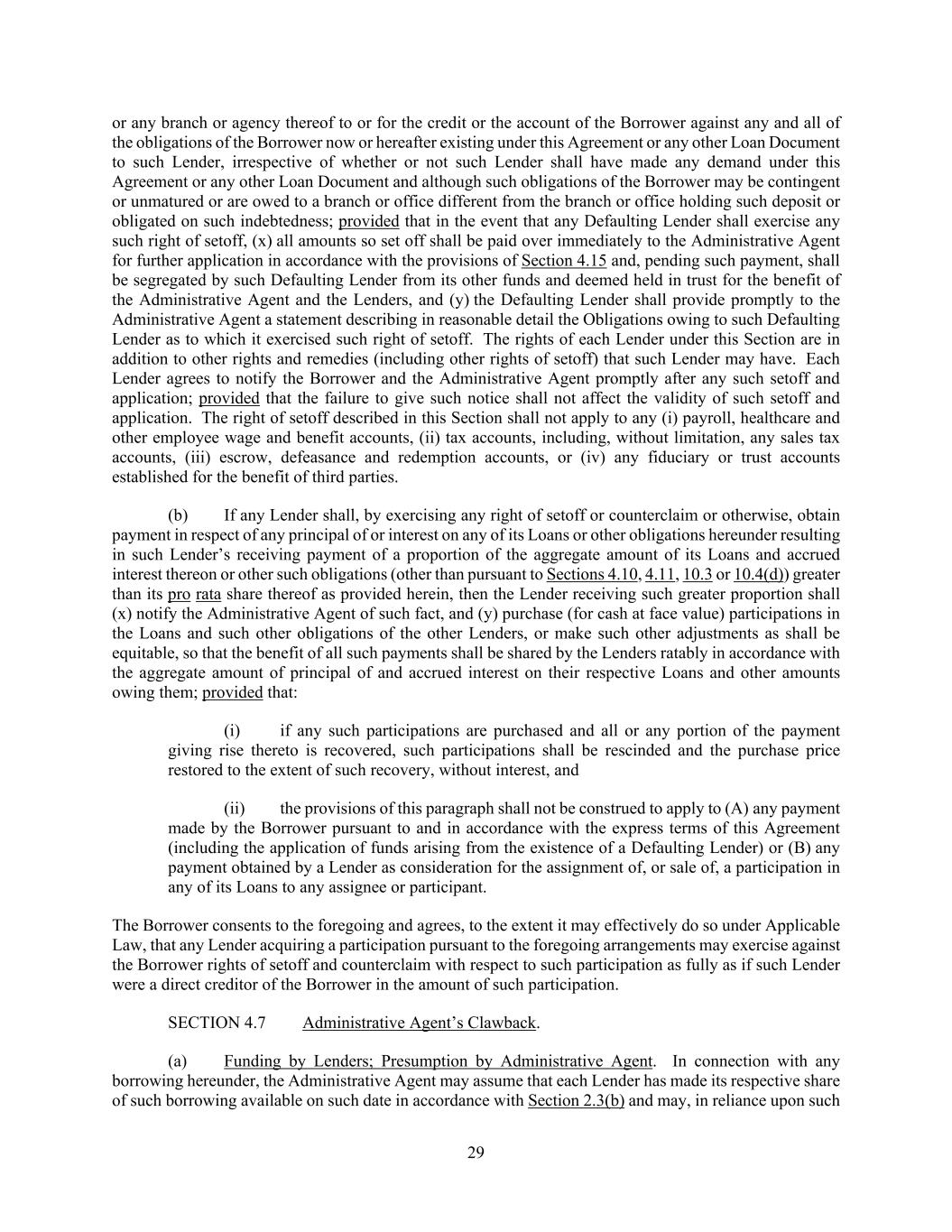 29 or any branch or agency thereof to or for the credit or the account of the Borrower against any and all of the obligations of the Borrower now or hereafter existing under this Agreement or any other Loan Document to such Lender, irrespective of whether or not such Lender shall have made any demand under this Agreement or any other Loan Document and although such obligations of the Borrower may be contingent or unmatured or are owed to a branch or office different from the branch or office holding such deposit or obligated on such indebtedness; provided that in the event that any Defaulting Lender shall exercise any such right of setoff, (x) all amounts so set off shall be paid over immediately to the Administrative Agent for further application in accordance with the provisions of Section 4.15 and, pending such payment, shall be segregated by such Defaulting Lender from its other funds and deemed held in trust for the benefit of the Administrative Agent and the Lenders, and (y) the Defaulting Lender shall provide promptly to the Administrative Agent a statement describing in reasonable detail the Obligations owing to such Defaulting Lender as to which it exercised such right of setoff. The rights of each Lender under this Section are in addition to other rights and remedies (including other rights of setoff) that such Lender may have. Each Lender agrees to notify the Borrower and the Administrative Agent promptly after any such setoff and application; provided that the failure to give such notice shall not affect the validity of such setoff and application. The right of setoff described in this Section shall not apply to any (i) payroll, healthcare and other employee wage and benefit accounts, (ii) tax accounts, including, without limitation, any sales tax accounts, (iii) escrow, defeasance and redemption accounts, or (iv) any fiduciary or trust accounts established for the benefit of third parties. (b) If any Lender shall, by exercising any right of setoff or counterclaim or otherwise, obtain payment in respect of any principal of or interest on any of its Loans or other obligations hereunder resulting in such Lender’s receiving payment of a proportion of the aggregate amount of its Loans and accrued interest thereon or other such obligations (other than pursuant to Sections 4.10, 4.11, 10.3 or 10.4(d)) greater than its pro rata share thereof as provided herein, then the Lender receiving such greater proportion shall (x) notify the Administrative Agent of such fact, and (y) purchase (for cash at face value) participations in the Loans and such other obligations of the other Lenders, or make such other adjustments as shall be equitable, so that the benefit of all such payments shall be shared by the Lenders ratably in accordance with the aggregate amount of principal of and accrued interest on their respective Loans and other amounts owing them; provided that: (i) if any such participations are purchased and all or any portion of the payment giving rise thereto is recovered, such participations shall be rescinded and the purchase price restored to the extent of such recovery, without interest, and (ii) the provisions of this paragraph shall not be construed to apply to (A) any payment made by the Borrower pursuant to and in accordance with the express terms of this Agreement (including the application of funds arising from the existence of a Defaulting Lender) or (B) any payment obtained by a Lender as consideration for the assignment of, or sale of, a participation in any of its Loans to any assignee or participant. The Borrower consents to the foregoing and agrees, to the extent it may effectively do so under Applicable Law, that any Lender acquiring a participation pursuant to the foregoing arrangements may exercise against the Borrower rights of setoff and counterclaim with respect to such participation as fully as if such Lender were a direct creditor of the Borrower in the amount of such participation. SECTION 4.7 Administrative Agent’s Clawback. (a) Funding by Lenders; Presumption by Administrative Agent. In connection with any borrowing hereunder, the Administrative Agent may assume that each Lender has made its respective share of such borrowing available on such date in accordance with Section 2.3(b) and may, in reliance upon such