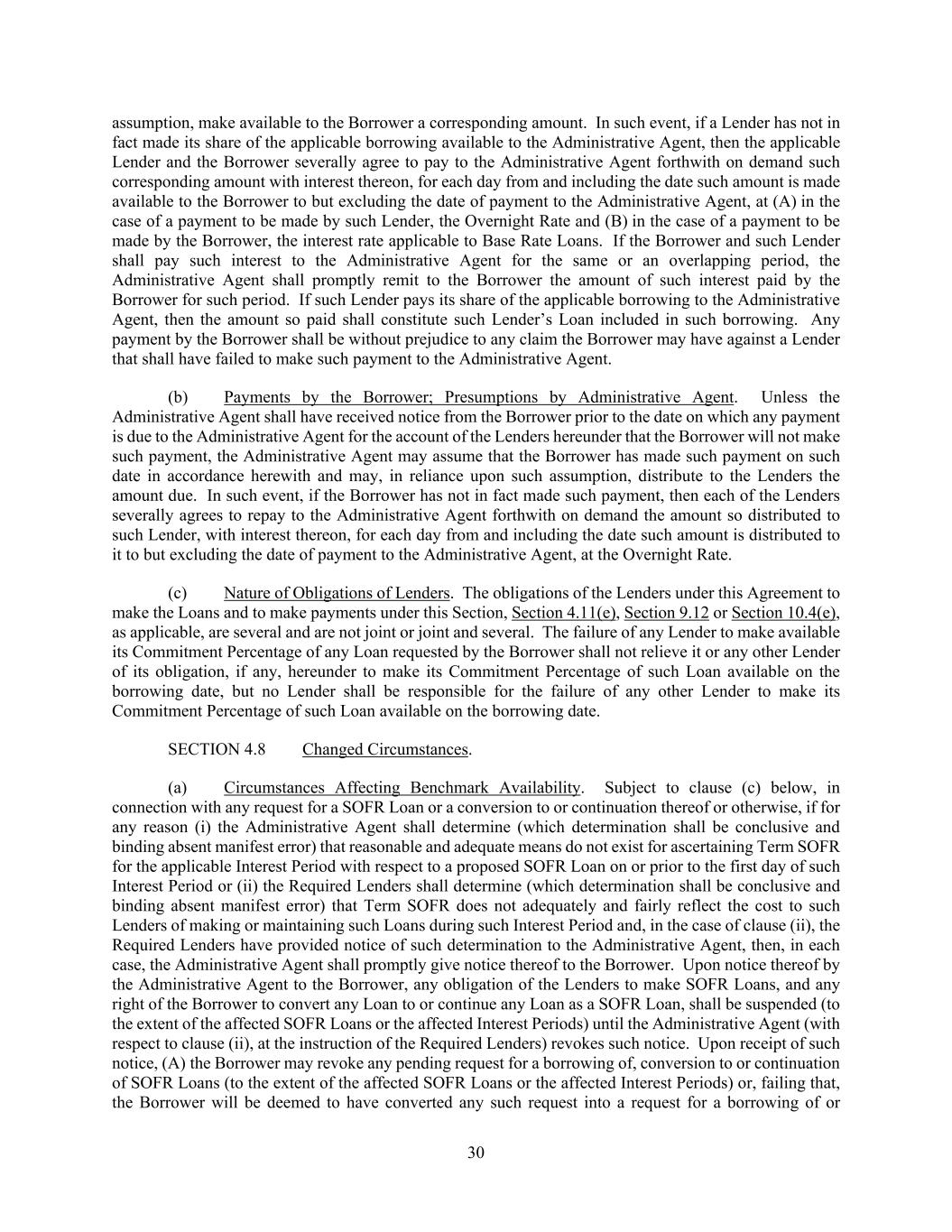 30 assumption, make available to the Borrower a corresponding amount. In such event, if a Lender has not in fact made its share of the applicable borrowing available to the Administrative Agent, then the applicable Lender and the Borrower severally agree to pay to the Administrative Agent forthwith on demand such corresponding amount with interest thereon, for each day from and including the date such amount is made available to the Borrower to but excluding the date of payment to the Administrative Agent, at (A) in the case of a payment to be made by such Lender, the Overnight Rate and (B) in the case of a payment to be made by the Borrower, the interest rate applicable to Base Rate Loans. If the Borrower and such Lender shall pay such interest to the Administrative Agent for the same or an overlapping period, the Administrative Agent shall promptly remit to the Borrower the amount of such interest paid by the Borrower for such period. If such Lender pays its share of the applicable borrowing to the Administrative Agent, then the amount so paid shall constitute such Lender’s Loan included in such borrowing. Any payment by the Borrower shall be without prejudice to any claim the Borrower may have against a Lender that shall have failed to make such payment to the Administrative Agent. (b) Payments by the Borrower; Presumptions by Administrative Agent. Unless the Administrative Agent shall have received notice from the Borrower prior to the date on which any payment is due to the Administrative Agent for the account of the Lenders hereunder that the Borrower will not make such payment, the Administrative Agent may assume that the Borrower has made such payment on such date in accordance herewith and may, in reliance upon such assumption, distribute to the Lenders the amount due. In such event, if the Borrower has not in fact made such payment, then each of the Lenders severally agrees to repay to the Administrative Agent forthwith on demand the amount so distributed to such Lender, with interest thereon, for each day from and including the date such amount is distributed to it to but excluding the date of payment to the Administrative Agent, at the Overnight Rate. (c) Nature of Obligations of Lenders. The obligations of the Lenders under this Agreement to make the Loans and to make payments under this Section, Section 4.11(e), Section 9.12 or Section 10.4(e), as applicable, are several and are not joint or joint and several. The failure of any Lender to make available its Commitment Percentage of any Loan requested by the Borrower shall not relieve it or any other Lender of its obligation, if any, hereunder to make its Commitment Percentage of such Loan available on the borrowing date, but no Lender shall be responsible for the failure of any other Lender to make its Commitment Percentage of such Loan available on the borrowing date. SECTION 4.8 Changed Circumstances. (a) Circumstances Affecting Benchmark Availability. Subject to clause (c) below, in connection with any request for a SOFR Loan or a conversion to or continuation thereof or otherwise, if for any reason (i) the Administrative Agent shall determine (which determination shall be conclusive and binding absent manifest error) that reasonable and adequate means do not exist for ascertaining Term SOFR for the applicable Interest Period with respect to a proposed SOFR Loan on or prior to the first day of such Interest Period or (ii) the Required Lenders shall determine (which determination shall be conclusive and binding absent manifest error) that Term SOFR does not adequately and fairly reflect the cost to such Lenders of making or maintaining such Loans during such Interest Period and, in the case of clause (ii), the Required Lenders have provided notice of such determination to the Administrative Agent, then, in each case, the Administrative Agent shall promptly give notice thereof to the Borrower. Upon notice thereof by the Administrative Agent to the Borrower, any obligation of the Lenders to make SOFR Loans, and any right of the Borrower to convert any Loan to or continue any Loan as a SOFR Loan, shall be suspended (to the extent of the affected SOFR Loans or the affected Interest Periods) until the Administrative Agent (with respect to clause (ii), at the instruction of the Required Lenders) revokes such notice. Upon receipt of such notice, (A) the Borrower may revoke any pending request for a borrowing of, conversion to or continuation of SOFR Loans (to the extent of the affected SOFR Loans or the affected Interest Periods) or, failing that, the Borrower will be deemed to have converted any such request into a request for a borrowing of or
