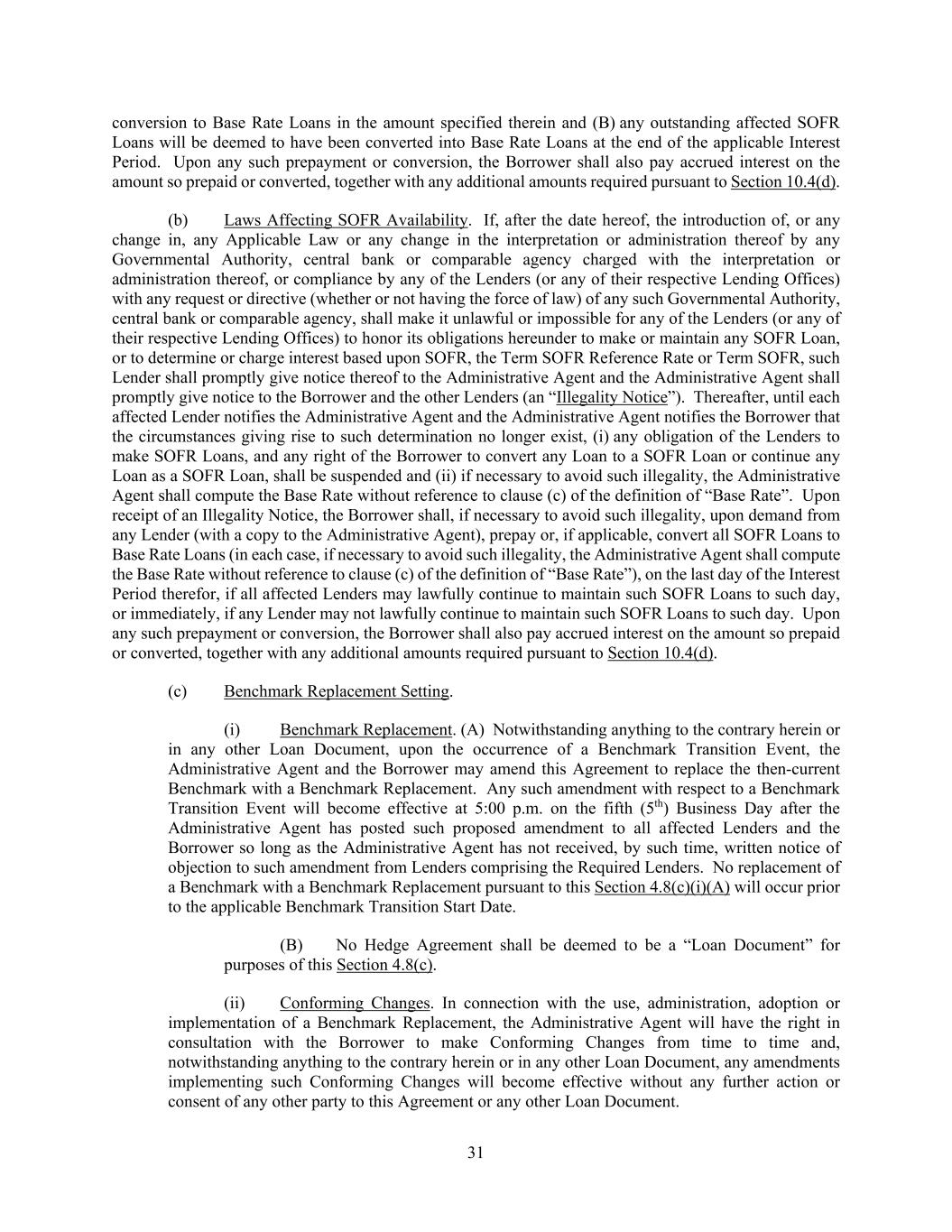 31 conversion to Base Rate Loans in the amount specified therein and (B) any outstanding affected SOFR Loans will be deemed to have been converted into Base Rate Loans at the end of the applicable Interest Period. Upon any such prepayment or conversion, the Borrower shall also pay accrued interest on the amount so prepaid or converted, together with any additional amounts required pursuant to Section 10.4(d). (b) Laws Affecting SOFR Availability. If, after the date hereof, the introduction of, or any change in, any Applicable Law or any change in the interpretation or administration thereof by any Governmental Authority, central bank or comparable agency charged with the interpretation or administration thereof, or compliance by any of the Lenders (or any of their respective Lending Offices) with any request or directive (whether or not having the force of law) of any such Governmental Authority, central bank or comparable agency, shall make it unlawful or impossible for any of the Lenders (or any of their respective Lending Offices) to honor its obligations hereunder to make or maintain any SOFR Loan, or to determine or charge interest based upon SOFR, the Term SOFR Reference Rate or Term SOFR, such Lender shall promptly give notice thereof to the Administrative Agent and the Administrative Agent shall promptly give notice to the Borrower and the other Lenders (an “Illegality Notice”). Thereafter, until each affected Lender notifies the Administrative Agent and the Administrative Agent notifies the Borrower that the circumstances giving rise to such determination no longer exist, (i) any obligation of the Lenders to make SOFR Loans, and any right of the Borrower to convert any Loan to a SOFR Loan or continue any Loan as a SOFR Loan, shall be suspended and (ii) if necessary to avoid such illegality, the Administrative Agent shall compute the Base Rate without reference to clause (c) of the definition of “Base Rate”. Upon receipt of an Illegality Notice, the Borrower shall, if necessary to avoid such illegality, upon demand from any Lender (with a copy to the Administrative Agent), prepay or, if applicable, convert all SOFR Loans to Base Rate Loans (in each case, if necessary to avoid such illegality, the Administrative Agent shall compute the Base Rate without reference to clause (c) of the definition of “Base Rate”), on the last day of the Interest Period therefor, if all affected Lenders may lawfully continue to maintain such SOFR Loans to such day, or immediately, if any Lender may not lawfully continue to maintain such SOFR Loans to such day. Upon any such prepayment or conversion, the Borrower shall also pay accrued interest on the amount so prepaid or converted, together with any additional amounts required pursuant to Section 10.4(d). (c) Benchmark Replacement Setting. (i) Benchmark Replacement. (A) Notwithstanding anything to the contrary herein or in any other Loan Document, upon the occurrence of a Benchmark Transition Event, the Administrative Agent and the Borrower may amend this Agreement to replace the then-current Benchmark with a Benchmark Replacement. Any such amendment with respect to a Benchmark Transition Event will become effective at 5:00 p.m. on the fifth (5th) Business Day after the Administrative Agent has posted such proposed amendment to all affected Lenders and the Borrower so long as the Administrative Agent has not received, by such time, written notice of objection to such amendment from Lenders comprising the Required Lenders. No replacement of a Benchmark with a Benchmark Replacement pursuant to this Section 4.8(c)(i)(A) will occur prior to the applicable Benchmark Transition Start Date. (B) No Hedge Agreement shall be deemed to be a “Loan Document” for purposes of this Section 4.8(c). (ii) Conforming Changes. In connection with the use, administration, adoption or implementation of a Benchmark Replacement, the Administrative Agent will have the right in consultation with the Borrower to make Conforming Changes from time to time and, notwithstanding anything to the contrary herein or in any other Loan Document, any amendments implementing such Conforming Changes will become effective without any further action or consent of any other party to this Agreement or any other Loan Document.