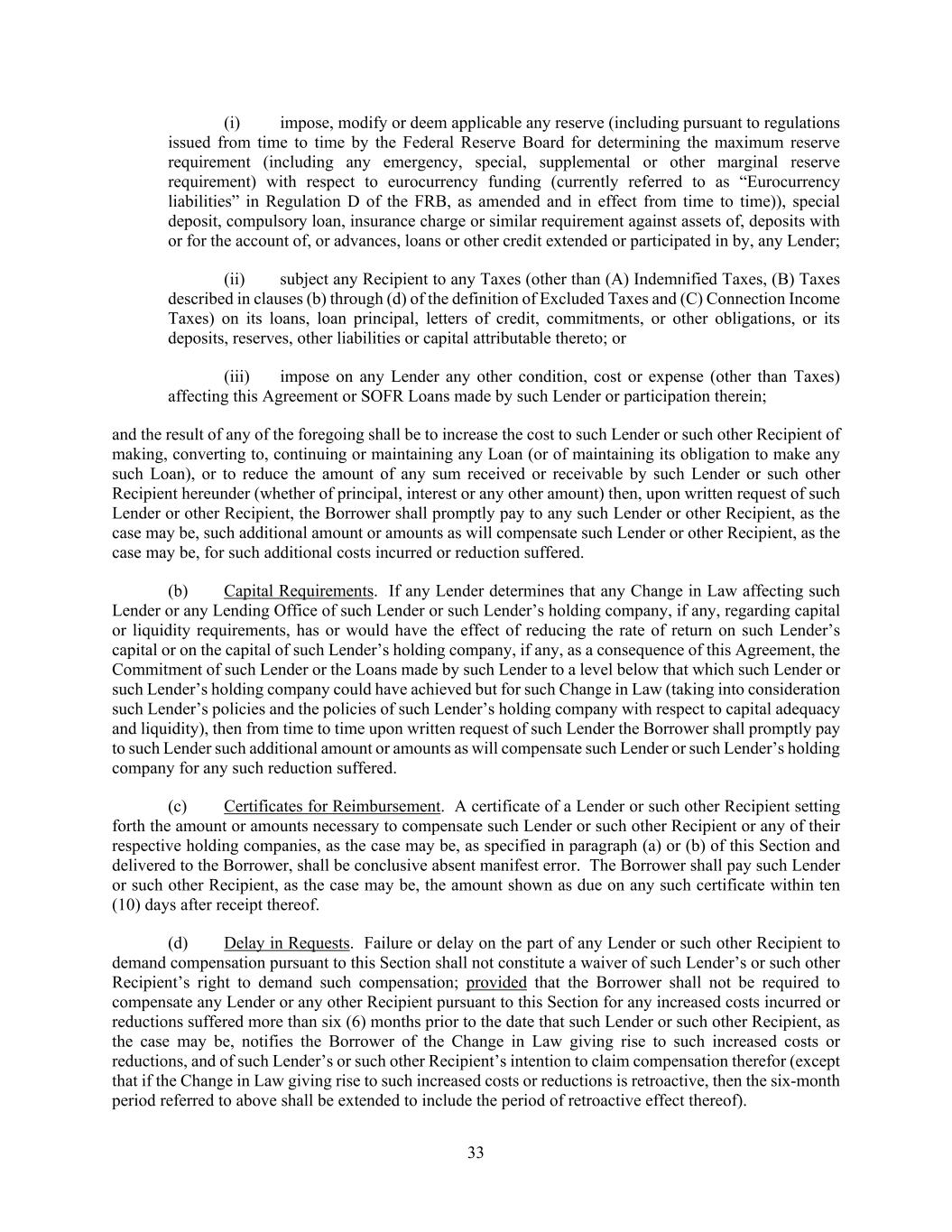 33 (i) impose, modify or deem applicable any reserve (including pursuant to regulations issued from time to time by the Federal Reserve Board for determining the maximum reserve requirement (including any emergency, special, supplemental or other marginal reserve requirement) with respect to eurocurrency funding (currently referred to as “Eurocurrency liabilities” in Regulation D of the FRB, as amended and in effect from time to time)), special deposit, compulsory loan, insurance charge or similar requirement against assets of, deposits with or for the account of, or advances, loans or other credit extended or participated in by, any Lender; (ii) subject any Recipient to any Taxes (other than (A) Indemnified Taxes, (B) Taxes described in clauses (b) through (d) of the definition of Excluded Taxes and (C) Connection Income Taxes) on its loans, loan principal, letters of credit, commitments, or other obligations, or its deposits, reserves, other liabilities or capital attributable thereto; or (iii) impose on any Lender any other condition, cost or expense (other than Taxes) affecting this Agreement or SOFR Loans made by such Lender or participation therein; and the result of any of the foregoing shall be to increase the cost to such Lender or such other Recipient of making, converting to, continuing or maintaining any Loan (or of maintaining its obligation to make any such Loan), or to reduce the amount of any sum received or receivable by such Lender or such other Recipient hereunder (whether of principal, interest or any other amount) then, upon written request of such Lender or other Recipient, the Borrower shall promptly pay to any such Lender or other Recipient, as the case may be, such additional amount or amounts as will compensate such Lender or other Recipient, as the case may be, for such additional costs incurred or reduction suffered. (b) Capital Requirements. If any Lender determines that any Change in Law affecting such Lender or any Lending Office of such Lender or such Lender’s holding company, if any, regarding capital or liquidity requirements, has or would have the effect of reducing the rate of return on such Lender’s capital or on the capital of such Lender’s holding company, if any, as a consequence of this Agreement, the Commitment of such Lender or the Loans made by such Lender to a level below that which such Lender or such Lender’s holding company could have achieved but for such Change in Law (taking into consideration such Lender’s policies and the policies of such Lender’s holding company with respect to capital adequacy and liquidity), then from time to time upon written request of such Lender the Borrower shall promptly pay to such Lender such additional amount or amounts as will compensate such Lender or such Lender’s holding company for any such reduction suffered. (c) Certificates for Reimbursement. A certificate of a Lender or such other Recipient setting forth the amount or amounts necessary to compensate such Lender or such other Recipient or any of their respective holding companies, as the case may be, as specified in paragraph (a) or (b) of this Section and delivered to the Borrower, shall be conclusive absent manifest error. The Borrower shall pay such Lender or such other Recipient, as the case may be, the amount shown as due on any such certificate within ten (10) days after receipt thereof. (d) Delay in Requests. Failure or delay on the part of any Lender or such other Recipient to demand compensation pursuant to this Section shall not constitute a waiver of such Lender’s or such other Recipient’s right to demand such compensation; provided that the Borrower shall not be required to compensate any Lender or any other Recipient pursuant to this Section for any increased costs incurred or reductions suffered more than six (6) months prior to the date that such Lender or such other Recipient, as the case may be, notifies the Borrower of the Change in Law giving rise to such increased costs or reductions, and of such Lender’s or such other Recipient’s intention to claim compensation therefor (except that if the Change in Law giving rise to such increased costs or reductions is retroactive, then the six-month period referred to above shall be extended to include the period of retroactive effect thereof).