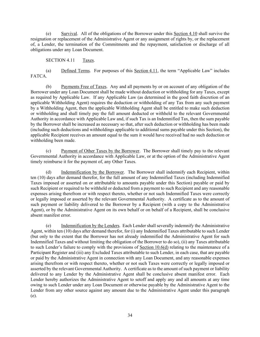 34 (e) Survival. All of the obligations of the Borrower under this Section 4.10 shall survive the resignation or replacement of the Administrative Agent or any assignment of rights by, or the replacement of, a Lender, the termination of the Commitments and the repayment, satisfaction or discharge of all obligations under any Loan Document. SECTION 4.11 Taxes. (a) Defined Terms. For purposes of this Section 4.11, the term “Applicable Law” includes FATCA. (b) Payments Free of Taxes. Any and all payments by or on account of any obligation of the Borrower under any Loan Document shall be made without deduction or withholding for any Taxes, except as required by Applicable Law. If any Applicable Law (as determined in the good faith discretion of an applicable Withholding Agent) requires the deduction or withholding of any Tax from any such payment by a Withholding Agent, then the applicable Withholding Agent shall be entitled to make such deduction or withholding and shall timely pay the full amount deducted or withheld to the relevant Governmental Authority in accordance with Applicable Law and, if such Tax is an Indemnified Tax, then the sum payable by the Borrower shall be increased as necessary so that, after such deduction or withholding has been made (including such deductions and withholdings applicable to additional sums payable under this Section), the applicable Recipient receives an amount equal to the sum it would have received had no such deduction or withholding been made. (c) Payment of Other Taxes by the Borrower. The Borrower shall timely pay to the relevant Governmental Authority in accordance with Applicable Law, or at the option of the Administrative Agent timely reimburse it for the payment of, any Other Taxes. (d) Indemnification by the Borrower. The Borrower shall indemnify each Recipient, within ten (10) days after demand therefor, for the full amount of any Indemnified Taxes (including Indemnified Taxes imposed or asserted on or attributable to amounts payable under this Section) payable or paid by such Recipient or required to be withheld or deducted from a payment to such Recipient and any reasonable expenses arising therefrom or with respect thereto, whether or not such Indemnified Taxes were correctly or legally imposed or asserted by the relevant Governmental Authority. A certificate as to the amount of such payment or liability delivered to the Borrower by a Recipient (with a copy to the Administrative Agent), or by the Administrative Agent on its own behalf or on behalf of a Recipient, shall be conclusive absent manifest error. (e) Indemnification by the Lenders. Each Lender shall severally indemnify the Administrative Agent, within ten (10) days after demand therefor, for (i) any Indemnified Taxes attributable to such Lender (but only to the extent that the Borrower has not already indemnified the Administrative Agent for such Indemnified Taxes and without limiting the obligation of the Borrower to do so), (ii) any Taxes attributable to such Lender’s failure to comply with the provisions of Section 10.6(d) relating to the maintenance of a Participant Register and (iii) any Excluded Taxes attributable to such Lender, in each case, that are payable or paid by the Administrative Agent in connection with any Loan Document, and any reasonable expenses arising therefrom or with respect thereto, whether or not such Taxes were correctly or legally imposed or asserted by the relevant Governmental Authority. A certificate as to the amount of such payment or liability delivered to any Lender by the Administrative Agent shall be conclusive absent manifest error. Each Lender hereby authorizes the Administrative Agent to setoff and apply any and all amounts at any time owing to such Lender under any Loan Document or otherwise payable by the Administrative Agent to the Lender from any other source against any amount due to the Administrative Agent under this paragraph (e).