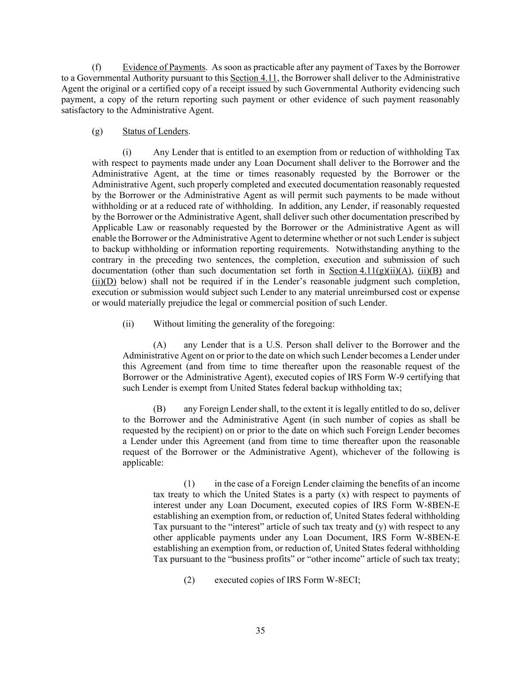 35 (f) Evidence of Payments. As soon as practicable after any payment of Taxes by the Borrower to a Governmental Authority pursuant to this Section 4.11, the Borrower shall deliver to the Administrative Agent the original or a certified copy of a receipt issued by such Governmental Authority evidencing such payment, a copy of the return reporting such payment or other evidence of such payment reasonably satisfactory to the Administrative Agent. (g) Status of Lenders. (i) Any Lender that is entitled to an exemption from or reduction of withholding Tax with respect to payments made under any Loan Document shall deliver to the Borrower and the Administrative Agent, at the time or times reasonably requested by the Borrower or the Administrative Agent, such properly completed and executed documentation reasonably requested by the Borrower or the Administrative Agent as will permit such payments to be made without withholding or at a reduced rate of withholding. In addition, any Lender, if reasonably requested by the Borrower or the Administrative Agent, shall deliver such other documentation prescribed by Applicable Law or reasonably requested by the Borrower or the Administrative Agent as will enable the Borrower or the Administrative Agent to determine whether or not such Lender is subject to backup withholding or information reporting requirements. Notwithstanding anything to the contrary in the preceding two sentences, the completion, execution and submission of such documentation (other than such documentation set forth in Section 4.11(g)(ii)(A), (ii)(B) and (ii)(D) below) shall not be required if in the Lender’s reasonable judgment such completion, execution or submission would subject such Lender to any material unreimbursed cost or expense or would materially prejudice the legal or commercial position of such Lender. (ii) Without limiting the generality of the foregoing: (A) any Lender that is a U.S. Person shall deliver to the Borrower and the Administrative Agent on or prior to the date on which such Lender becomes a Lender under this Agreement (and from time to time thereafter upon the reasonable request of the Borrower or the Administrative Agent), executed copies of IRS Form W-9 certifying that such Lender is exempt from United States federal backup withholding tax; (B) any Foreign Lender shall, to the extent it is legally entitled to do so, deliver to the Borrower and the Administrative Agent (in such number of copies as shall be requested by the recipient) on or prior to the date on which such Foreign Lender becomes a Lender under this Agreement (and from time to time thereafter upon the reasonable request of the Borrower or the Administrative Agent), whichever of the following is applicable: (1) in the case of a Foreign Lender claiming the benefits of an income tax treaty to which the United States is a party (x) with respect to payments of interest under any Loan Document, executed copies of IRS Form W-8BEN-E establishing an exemption from, or reduction of, United States federal withholding Tax pursuant to the “interest” article of such tax treaty and (y) with respect to any other applicable payments under any Loan Document, IRS Form W-8BEN-E establishing an exemption from, or reduction of, United States federal withholding Tax pursuant to the “business profits” or “other income” article of such tax treaty; (2) executed copies of IRS Form W-8ECI;