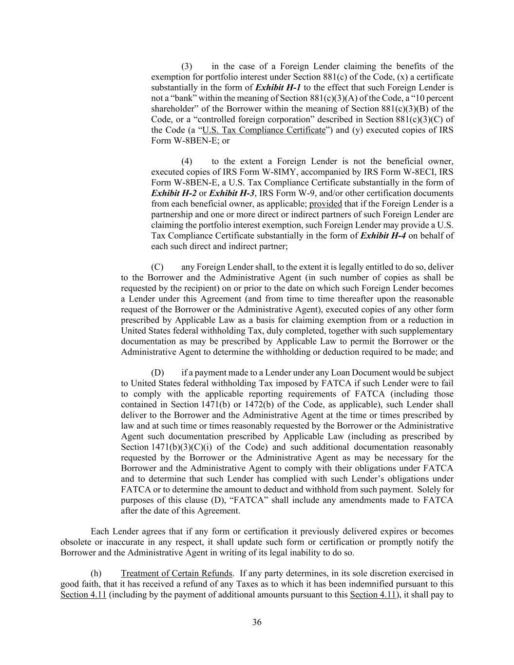 36 (3) in the case of a Foreign Lender claiming the benefits of the exemption for portfolio interest under Section 881(c) of the Code, (x) a certificate substantially in the form of Exhibit H-1 to the effect that such Foreign Lender is not a “bank” within the meaning of Section 881(c)(3)(A) of the Code, a “10 percent shareholder” of the Borrower within the meaning of Section 881(c)(3)(B) of the Code, or a “controlled foreign corporation” described in Section 881(c)(3)(C) of the Code (a “U.S. Tax Compliance Certificate”) and (y) executed copies of IRS Form W-8BEN-E; or (4) to the extent a Foreign Lender is not the beneficial owner, executed copies of IRS Form W-8IMY, accompanied by IRS Form W-8ECI, IRS Form W-8BEN-E, a U.S. Tax Compliance Certificate substantially in the form of Exhibit H-2 or Exhibit H-3, IRS Form W-9, and/or other certification documents from each beneficial owner, as applicable; provided that if the Foreign Lender is a partnership and one or more direct or indirect partners of such Foreign Lender are claiming the portfolio interest exemption, such Foreign Lender may provide a U.S. Tax Compliance Certificate substantially in the form of Exhibit H-4 on behalf of each such direct and indirect partner; (C) any Foreign Lender shall, to the extent it is legally entitled to do so, deliver to the Borrower and the Administrative Agent (in such number of copies as shall be requested by the recipient) on or prior to the date on which such Foreign Lender becomes a Lender under this Agreement (and from time to time thereafter upon the reasonable request of the Borrower or the Administrative Agent), executed copies of any other form prescribed by Applicable Law as a basis for claiming exemption from or a reduction in United States federal withholding Tax, duly completed, together with such supplementary documentation as may be prescribed by Applicable Law to permit the Borrower or the Administrative Agent to determine the withholding or deduction required to be made; and (D) if a payment made to a Lender under any Loan Document would be subject to United States federal withholding Tax imposed by FATCA if such Lender were to fail to comply with the applicable reporting requirements of FATCA (including those contained in Section 1471(b) or 1472(b) of the Code, as applicable), such Lender shall deliver to the Borrower and the Administrative Agent at the time or times prescribed by law and at such time or times reasonably requested by the Borrower or the Administrative Agent such documentation prescribed by Applicable Law (including as prescribed by Section 1471(b)(3)(C)(i) of the Code) and such additional documentation reasonably requested by the Borrower or the Administrative Agent as may be necessary for the Borrower and the Administrative Agent to comply with their obligations under FATCA and to determine that such Lender has complied with such Lender’s obligations under FATCA or to determine the amount to deduct and withhold from such payment. Solely for purposes of this clause (D), “FATCA” shall include any amendments made to FATCA after the date of this Agreement. Each Lender agrees that if any form or certification it previously delivered expires or becomes obsolete or inaccurate in any respect, it shall update such form or certification or promptly notify the Borrower and the Administrative Agent in writing of its legal inability to do so. (h) Treatment of Certain Refunds. If any party determines, in its sole discretion exercised in good faith, that it has received a refund of any Taxes as to which it has been indemnified pursuant to this Section 4.11 (including by the payment of additional amounts pursuant to this Section 4.11), it shall pay to
