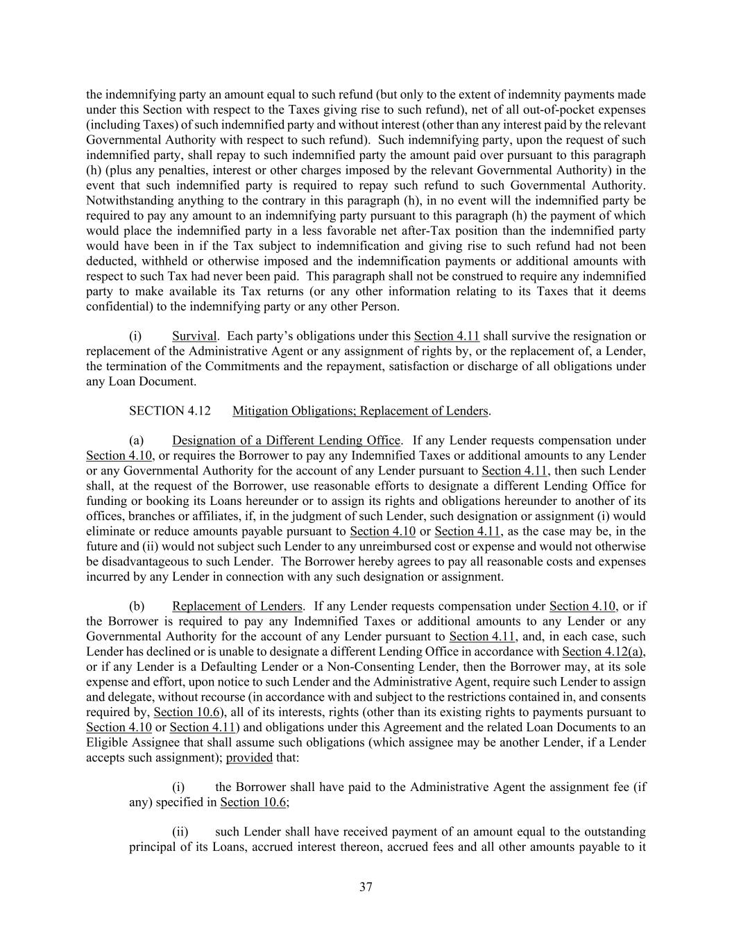 37 the indemnifying party an amount equal to such refund (but only to the extent of indemnity payments made under this Section with respect to the Taxes giving rise to such refund), net of all out-of-pocket expenses (including Taxes) of such indemnified party and without interest (other than any interest paid by the relevant Governmental Authority with respect to such refund). Such indemnifying party, upon the request of such indemnified party, shall repay to such indemnified party the amount paid over pursuant to this paragraph (h) (plus any penalties, interest or other charges imposed by the relevant Governmental Authority) in the event that such indemnified party is required to repay such refund to such Governmental Authority. Notwithstanding anything to the contrary in this paragraph (h), in no event will the indemnified party be required to pay any amount to an indemnifying party pursuant to this paragraph (h) the payment of which would place the indemnified party in a less favorable net after-Tax position than the indemnified party would have been in if the Tax subject to indemnification and giving rise to such refund had not been deducted, withheld or otherwise imposed and the indemnification payments or additional amounts with respect to such Tax had never been paid. This paragraph shall not be construed to require any indemnified party to make available its Tax returns (or any other information relating to its Taxes that it deems confidential) to the indemnifying party or any other Person. (i) Survival. Each party’s obligations under this Section 4.11 shall survive the resignation or replacement of the Administrative Agent or any assignment of rights by, or the replacement of, a Lender, the termination of the Commitments and the repayment, satisfaction or discharge of all obligations under any Loan Document. SECTION 4.12 Mitigation Obligations; Replacement of Lenders. (a) Designation of a Different Lending Office. If any Lender requests compensation under Section 4.10, or requires the Borrower to pay any Indemnified Taxes or additional amounts to any Lender or any Governmental Authority for the account of any Lender pursuant to Section 4.11, then such Lender shall, at the request of the Borrower, use reasonable efforts to designate a different Lending Office for funding or booking its Loans hereunder or to assign its rights and obligations hereunder to another of its offices, branches or affiliates, if, in the judgment of such Lender, such designation or assignment (i) would eliminate or reduce amounts payable pursuant to Section 4.10 or Section 4.11, as the case may be, in the future and (ii) would not subject such Lender to any unreimbursed cost or expense and would not otherwise be disadvantageous to such Lender. The Borrower hereby agrees to pay all reasonable costs and expenses incurred by any Lender in connection with any such designation or assignment. (b) Replacement of Lenders. If any Lender requests compensation under Section 4.10, or if the Borrower is required to pay any Indemnified Taxes or additional amounts to any Lender or any Governmental Authority for the account of any Lender pursuant to Section 4.11, and, in each case, such Lender has declined or is unable to designate a different Lending Office in accordance with Section 4.12(a), or if any Lender is a Defaulting Lender or a Non-Consenting Lender, then the Borrower may, at its sole expense and effort, upon notice to such Lender and the Administrative Agent, require such Lender to assign and delegate, without recourse (in accordance with and subject to the restrictions contained in, and consents required by, Section 10.6), all of its interests, rights (other than its existing rights to payments pursuant to Section 4.10 or Section 4.11) and obligations under this Agreement and the related Loan Documents to an Eligible Assignee that shall assume such obligations (which assignee may be another Lender, if a Lender accepts such assignment); provided that: (i) the Borrower shall have paid to the Administrative Agent the assignment fee (if any) specified in Section 10.6; (ii) such Lender shall have received payment of an amount equal to the outstanding principal of its Loans, accrued interest thereon, accrued fees and all other amounts payable to it
