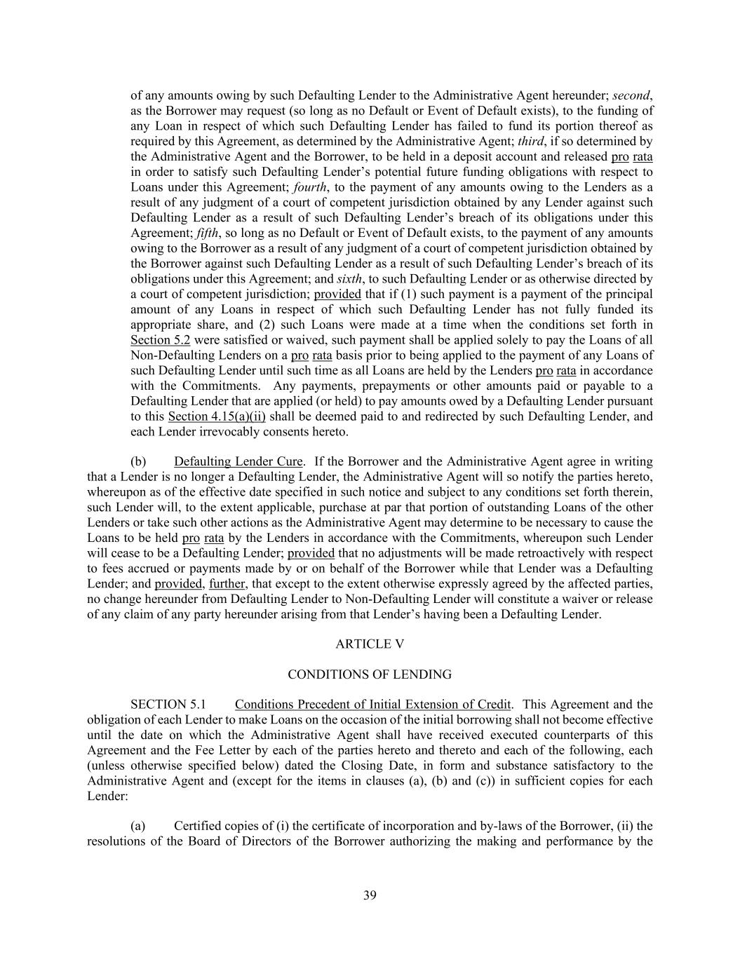 39 of any amounts owing by such Defaulting Lender to the Administrative Agent hereunder; second, as the Borrower may request (so long as no Default or Event of Default exists), to the funding of any Loan in respect of which such Defaulting Lender has failed to fund its portion thereof as required by this Agreement, as determined by the Administrative Agent; third, if so determined by the Administrative Agent and the Borrower, to be held in a deposit account and released pro rata in order to satisfy such Defaulting Lender’s potential future funding obligations with respect to Loans under this Agreement; fourth, to the payment of any amounts owing to the Lenders as a result of any judgment of a court of competent jurisdiction obtained by any Lender against such Defaulting Lender as a result of such Defaulting Lender’s breach of its obligations under this Agreement; fifth, so long as no Default or Event of Default exists, to the payment of any amounts owing to the Borrower as a result of any judgment of a court of competent jurisdiction obtained by the Borrower against such Defaulting Lender as a result of such Defaulting Lender’s breach of its obligations under this Agreement; and sixth, to such Defaulting Lender or as otherwise directed by a court of competent jurisdiction; provided that if (1) such payment is a payment of the principal amount of any Loans in respect of which such Defaulting Lender has not fully funded its appropriate share, and (2) such Loans were made at a time when the conditions set forth in Section 5.2 were satisfied or waived, such payment shall be applied solely to pay the Loans of all Non-Defaulting Lenders on a pro rata basis prior to being applied to the payment of any Loans of such Defaulting Lender until such time as all Loans are held by the Lenders pro rata in accordance with the Commitments. Any payments, prepayments or other amounts paid or payable to a Defaulting Lender that are applied (or held) to pay amounts owed by a Defaulting Lender pursuant to this Section 4.15(a)(ii) shall be deemed paid to and redirected by such Defaulting Lender, and each Lender irrevocably consents hereto. (b) Defaulting Lender Cure. If the Borrower and the Administrative Agent agree in writing that a Lender is no longer a Defaulting Lender, the Administrative Agent will so notify the parties hereto, whereupon as of the effective date specified in such notice and subject to any conditions set forth therein, such Lender will, to the extent applicable, purchase at par that portion of outstanding Loans of the other Lenders or take such other actions as the Administrative Agent may determine to be necessary to cause the Loans to be held pro rata by the Lenders in accordance with the Commitments, whereupon such Lender will cease to be a Defaulting Lender; provided that no adjustments will be made retroactively with respect to fees accrued or payments made by or on behalf of the Borrower while that Lender was a Defaulting Lender; and provided, further, that except to the extent otherwise expressly agreed by the affected parties, no change hereunder from Defaulting Lender to Non-Defaulting Lender will constitute a waiver or release of any claim of any party hereunder arising from that Lender’s having been a Defaulting Lender. ARTICLE V CONDITIONS OF LENDING SECTION 5.1 Conditions Precedent of Initial Extension of Credit. This Agreement and the obligation of each Lender to make Loans on the occasion of the initial borrowing shall not become effective until the date on which the Administrative Agent shall have received executed counterparts of this Agreement and the Fee Letter by each of the parties hereto and thereto and each of the following, each (unless otherwise specified below) dated the Closing Date, in form and substance satisfactory to the Administrative Agent and (except for the items in clauses (a), (b) and (c)) in sufficient copies for each Lender: (a) Certified copies of (i) the certificate of incorporation and by-laws of the Borrower, (ii) the resolutions of the Board of Directors of the Borrower authorizing the making and performance by the