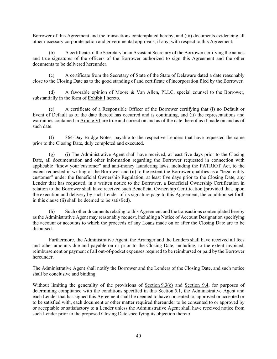 40 Borrower of this Agreement and the transactions contemplated hereby, and (iii) documents evidencing all other necessary corporate action and governmental approvals, if any, with respect to this Agreement. (b) A certificate of the Secretary or an Assistant Secretary of the Borrower certifying the names and true signatures of the officers of the Borrower authorized to sign this Agreement and the other documents to be delivered hereunder. (c) A certificate from the Secretary of State of the State of Delaware dated a date reasonably close to the Closing Date as to the good standing of and certificate of incorporation filed by the Borrower. (d) A favorable opinion of Moore & Van Allen, PLLC, special counsel to the Borrower, substantially in the form of Exhibit I hereto. (e) A certificate of a Responsible Officer of the Borrower certifying that (i) no Default or Event of Default as of the date thereof has occurred and is continuing, and (ii) the representations and warranties contained in Article VI are true and correct on and as of the date thereof as if made on and as of such date. (f) 364-Day Bridge Notes, payable to the respective Lenders that have requested the same prior to the Closing Date, duly completed and executed. (g) (i) The Administrative Agent shall have received, at least five days prior to the Closing Date, all documentation and other information regarding the Borrower requested in connection with applicable “know your customer” and anti-money laundering laws, including the PATRIOT Act, to the extent requested in writing of the Borrower and (ii) to the extent the Borrower qualifies as a “legal entity customer” under the Beneficial Ownership Regulation, at least five days prior to the Closing Date, any Lender that has requested, in a written notice to the Borrower, a Beneficial Ownership Certification in relation to the Borrower shall have received such Beneficial Ownership Certification (provided that, upon the execution and delivery by such Lender of its signature page to this Agreement, the condition set forth in this clause (ii) shall be deemed to be satisfied). (h) Such other documents relating to this Agreement and the transactions contemplated hereby as the Administrative Agent may reasonably request, including a Notice of Account Designation specifying the account or accounts to which the proceeds of any Loans made on or after the Closing Date are to be disbursed. Furthermore, the Administrative Agent, the Arranger and the Lenders shall have received all fees and other amounts due and payable on or prior to the Closing Date, including, to the extent invoiced, reimbursement or payment of all out-of-pocket expenses required to be reimbursed or paid by the Borrower hereunder. The Administrative Agent shall notify the Borrower and the Lenders of the Closing Date, and such notice shall be conclusive and binding. Without limiting the generality of the provisions of Section 9.3(c) and Section 9.4, for purposes of determining compliance with the conditions specified in this Section 5.1, the Administrative Agent and each Lender that has signed this Agreement shall be deemed to have consented to, approved or accepted or to be satisfied with, each document or other matter required thereunder to be consented to or approved by or acceptable or satisfactory to a Lender unless the Administrative Agent shall have received notice from such Lender prior to the proposed Closing Date specifying its objection thereto.