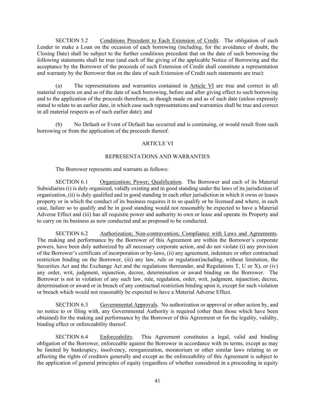 41 SECTION 5.2 Conditions Precedent to Each Extension of Credit. The obligation of each Lender to make a Loan on the occasion of each borrowing (including, for the avoidance of doubt, the Closing Date) shall be subject to the further conditions precedent that on the date of such borrowing the following statements shall be true (and each of the giving of the applicable Notice of Borrowing and the acceptance by the Borrower of the proceeds of such Extension of Credit shall constitute a representation and warranty by the Borrower that on the date of such Extension of Credit such statements are true): (a) The representations and warranties contained in Article VI are true and correct in all material respects on and as of the date of such borrowing, before and after giving effect to such borrowing and to the application of the proceeds therefrom, as though made on and as of such date (unless expressly stated to relate to an earlier date, in which case such representations and warranties shall be true and correct in all material respects as of such earlier date); and (b) No Default or Event of Default has occurred and is continuing, or would result from such borrowing or from the application of the proceeds thereof. ARTICLE VI REPRESENTATIONS AND WARRANTIES The Borrower represents and warrants as follows: SECTION 6.1 Organization; Power; Qualification. The Borrower and each of its Material Subsidiaries (i) is duly organized, validly existing and in good standing under the laws of its jurisdiction of organization, (ii) is duly qualified and in good standing in each other jurisdiction in which it owns or leases property or in which the conduct of its business requires it to so qualify or be licensed and where, in each case, failure so to qualify and be in good standing would not reasonably be expected to have a Material Adverse Effect and (iii) has all requisite power and authority to own or lease and operate its Property and to carry on its business as now conducted and as proposed to be conducted. SECTION 6.2 Authorization; Non-contravention; Compliance with Laws and Agreements. The making and performance by the Borrower of this Agreement are within the Borrower’s corporate powers, have been duly authorized by all necessary corporate action, and do not violate (i) any provision of the Borrower’s certificate of incorporation or by-laws, (ii) any agreement, indenture or other contractual restriction binding on the Borrower, (iii) any law, rule or regulation (including, without limitation, the Securities Act and the Exchange Act and the regulations thereunder, and Regulations T, U or X), or (iv) any order, writ, judgment, injunction, decree, determination or award binding on the Borrower. The Borrower is not in violation of any such law, rule, regulation, order, writ, judgment, injunction, decree, determination or award or in breach of any contractual restriction binding upon it, except for such violation or breach which would not reasonably be expected to have a Material Adverse Effect. SECTION 6.3 Governmental Approvals. No authorization or approval or other action by, and no notice to or filing with, any Governmental Authority is required (other than those which have been obtained) for the making and performance by the Borrower of this Agreement or for the legality, validity, binding effect or enforceability thereof. SECTION 6.4 Enforceability. This Agreement constitutes a legal, valid and binding obligation of the Borrower, enforceable against the Borrower in accordance with its terms, except as may be limited by bankruptcy, insolvency, reorganization, moratorium or other similar laws relating to or affecting the rights of creditors generally and except as the enforceability of this Agreement is subject to the application of general principles of equity (regardless of whether considered in a proceeding in equity