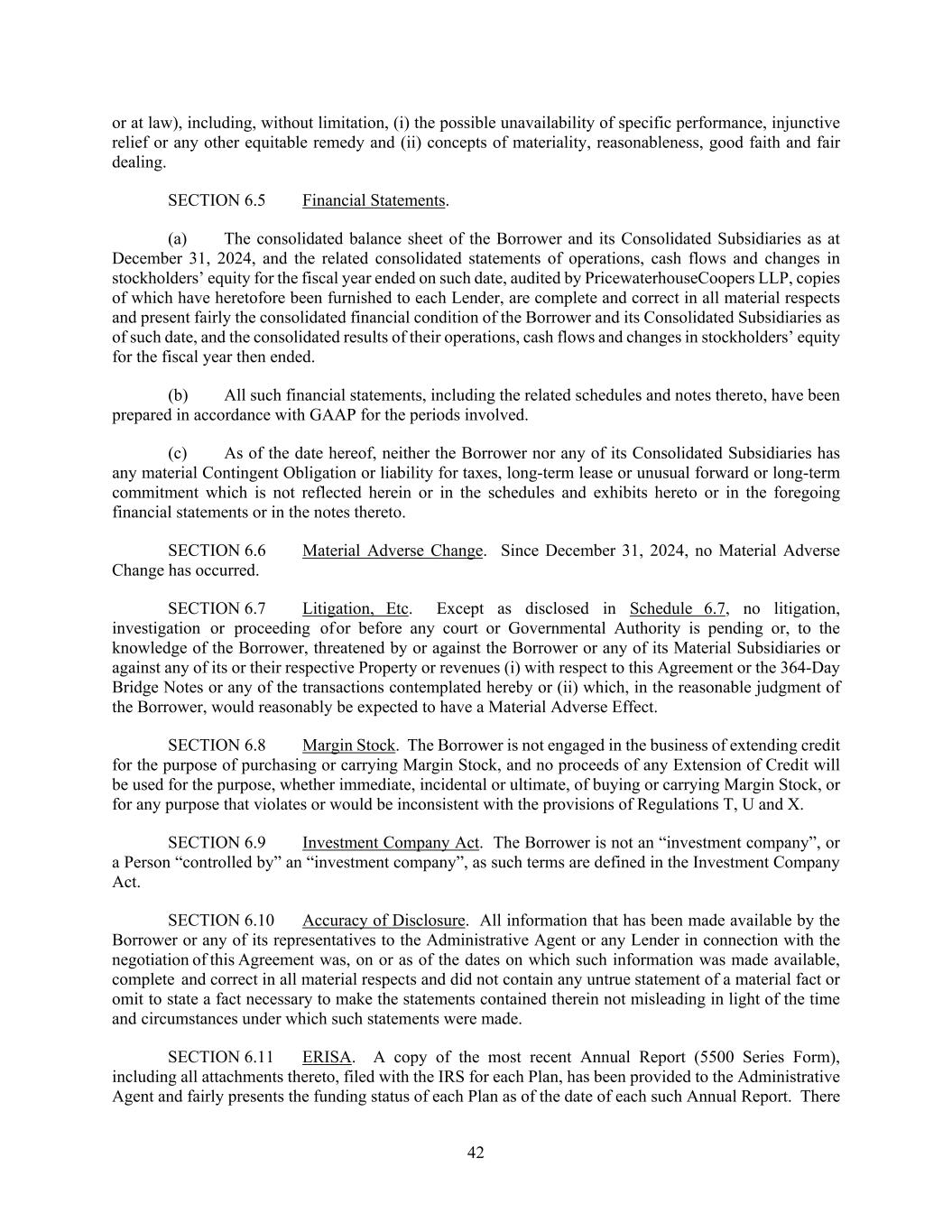 42 or at law), including, without limitation, (i) the possible unavailability of specific performance, injunctive relief or any other equitable remedy and (ii) concepts of materiality, reasonableness, good faith and fair dealing. SECTION 6.5 Financial Statements. (a) The consolidated balance sheet of the Borrower and its Consolidated Subsidiaries as at December 31, 2024, and the related consolidated statements of operations, cash flows and changes in stockholders’ equity for the fiscal year ended on such date, audited by PricewaterhouseCoopers LLP, copies of which have heretofore been furnished to each Lender, are complete and correct in all material respects and present fairly the consolidated financial condition of the Borrower and its Consolidated Subsidiaries as of such date, and the consolidated results of their operations, cash flows and changes in stockholders’ equity for the fiscal year then ended. (b) All such financial statements, including the related schedules and notes thereto, have been prepared in accordance with GAAP for the periods involved. (c) As of the date hereof, neither the Borrower nor any of its Consolidated Subsidiaries has any material Contingent Obligation or liability for taxes, long-term lease or unusual forward or long-term commitment which is not reflected herein or in the schedules and exhibits hereto or in the foregoing financial statements or in the notes thereto. SECTION 6.6 Material Adverse Change. Since December 31, 2024, no Material Adverse Change has occurred. SECTION 6.7 Litigation, Etc. Except as disclosed in Schedule 6.7, no litigation, investigation or proceeding of or before any court or Governmental Authority is pending or, to the knowledge of the Borrower, threatened by or against the Borrower or any of its Material Subsidiaries or against any of its or their respective Property or revenues (i) with respect to this Agreement or the 364-Day Bridge Notes or any of the transactions contemplated hereby or (ii) which, in the reasonable judgment of the Borrower, would reasonably be expected to have a Material Adverse Effect. SECTION 6.8 Margin Stock. The Borrower is not engaged in the business of extending credit for the purpose of purchasing or carrying Margin Stock, and no proceeds of any Extension of Credit will be used for the purpose, whether immediate, incidental or ultimate, of buying or carrying Margin Stock, or for any purpose that violates or would be inconsistent with the provisions of Regulations T, U and X. SECTION 6.9 Investment Company Act. The Borrower is not an “investment company”, or a Person “controlled by” an “investment company”, as such terms are defined in the Investment Company Act. SECTION 6.10 Accuracy of Disclosure. All information that has been made available by the Borrower or any of its representatives to the Administrative Agent or any Lender in connection with the negotiation of this Agreement was, on or as of the dates on which such information was made available, complete and correct in all material respects and did not contain any untrue statement of a material fact or omit to state a fact necessary to make the statements contained therein not misleading in light of the time and circumstances under which such statements were made. SECTION 6.11 ERISA. A copy of the most recent Annual Report (5500 Series Form), including all attachments thereto, filed with the IRS for each Plan, has been provided to the Administrative Agent and fairly presents the funding status of each Plan as of the date of each such Annual Report. There