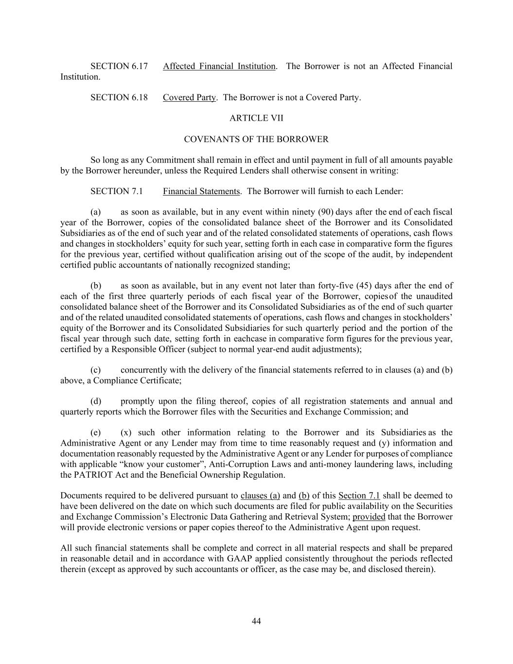 44 SECTION 6.17 Affected Financial Institution. The Borrower is not an Affected Financial Institution. SECTION 6.18 Covered Party. The Borrower is not a Covered Party. ARTICLE VII COVENANTS OF THE BORROWER So long as any Commitment shall remain in effect and until payment in full of all amounts payable by the Borrower hereunder, unless the Required Lenders shall otherwise consent in writing: SECTION 7.1 Financial Statements. The Borrower will furnish to each Lender: (a) as soon as available, but in any event within ninety (90) days after the end of each fiscal year of the Borrower, copies of the consolidated balance sheet of the Borrower and its Consolidated Subsidiaries as of the end of such year and of the related consolidated statements of operations, cash flows and changes in stockholders’ equity for such year, setting forth in each case in comparative form the figures for the previous year, certified without qualification arising out of the scope of the audit, by independent certified public accountants of nationally recognized standing; (b) as soon as available, but in any event not later than forty-five (45) days after the end of each of the first three quarterly periods of each fiscal year of the Borrower, copies of the unaudited consolidated balance sheet of the Borrower and its Consolidated Subsidiaries as of the end of such quarter and of the related unaudited consolidated statements of operations, cash flows and changes in stockholders’ equity of the Borrower and its Consolidated Subsidiaries for such quarterly period and the portion of the fiscal year through such date, setting forth in each case in comparative form figures for the previous year, certified by a Responsible Officer (subject to normal year-end audit adjustments); (c) concurrently with the delivery of the financial statements referred to in clauses (a) and (b) above, a Compliance Certificate; (d) promptly upon the filing thereof, copies of all registration statements and annual and quarterly reports which the Borrower files with the Securities and Exchange Commission; and (e) (x) such other information relating to the Borrower and its Subsidiaries as the Administrative Agent or any Lender may from time to time reasonably request and (y) information and documentation reasonably requested by the Administrative Agent or any Lender for purposes of compliance with applicable “know your customer”, Anti-Corruption Laws and anti-money laundering laws, including the PATRIOT Act and the Beneficial Ownership Regulation. Documents required to be delivered pursuant to clauses (a) and (b) of this Section 7.1 shall be deemed to have been delivered on the date on which such documents are filed for public availability on the Securities and Exchange Commission’s Electronic Data Gathering and Retrieval System; provided that the Borrower will provide electronic versions or paper copies thereof to the Administrative Agent upon request. All such financial statements shall be complete and correct in all material respects and shall be prepared in reasonable detail and in accordance with GAAP applied consistently throughout the periods reflected therein (except as approved by such accountants or officer, as the case may be, and disclosed therein).