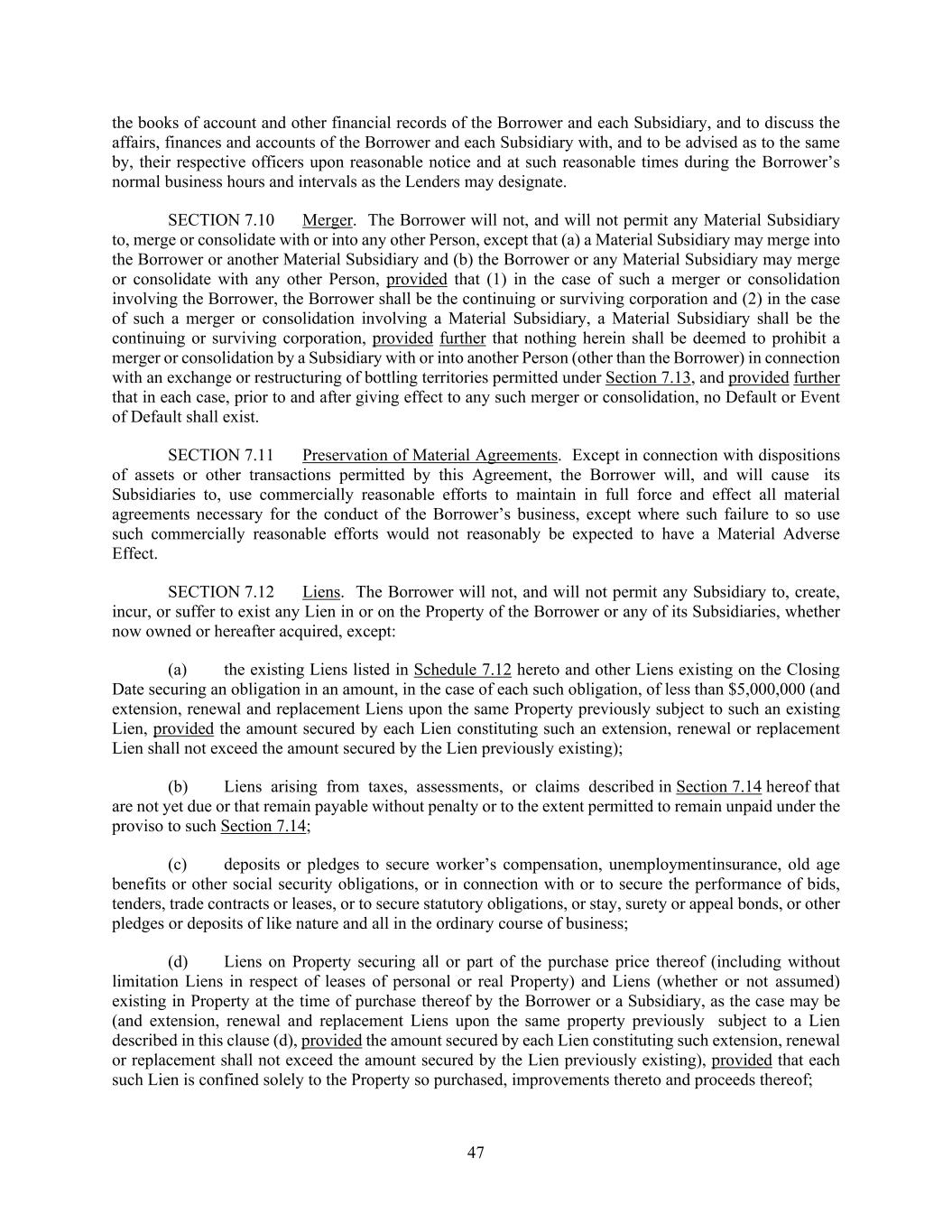 47 the books of account and other financial records of the Borrower and each Subsidiary, and to discuss the affairs, finances and accounts of the Borrower and each Subsidiary with, and to be advised as to the same by, their respective officers upon reasonable notice and at such reasonable times during the Borrower’s normal business hours and intervals as the Lenders may designate. SECTION 7.10 Merger. The Borrower will not, and will not permit any Material Subsidiary to, merge or consolidate with or into any other Person, except that (a) a Material Subsidiary may merge into the Borrower or another Material Subsidiary and (b) the Borrower or any Material Subsidiary may merge or consolidate with any other Person, provided that (1) in the case of such a merger or consolidation involving the Borrower, the Borrower shall be the continuing or surviving corporation and (2) in the case of such a merger or consolidation involving a Material Subsidiary, a Material Subsidiary shall be the continuing or surviving corporation, provided further that nothing herein shall be deemed to prohibit a merger or consolidation by a Subsidiary with or into another Person (other than the Borrower) in connection with an exchange or restructuring of bottling territories permitted under Section 7.13, and provided further that in each case, prior to and after giving effect to any such merger or consolidation, no Default or Event of Default shall exist. SECTION 7.11 Preservation of Material Agreements. Except in connection with dispositions of assets or other transactions permitted by this Agreement, the Borrower will, and will cause its Subsidiaries to, use commercially reasonable efforts to maintain in full force and effect all material agreements necessary for the conduct of the Borrower’s business, except where such failure to so use such commercially reasonable efforts would not reasonably be expected to have a Material Adverse Effect. SECTION 7.12 Liens. The Borrower will not, and will not permit any Subsidiary to, create, incur, or suffer to exist any Lien in or on the Property of the Borrower or any of its Subsidiaries, whether now owned or hereafter acquired, except: (a) the existing Liens listed in Schedule 7.12 hereto and other Liens existing on the Closing Date securing an obligation in an amount, in the case of each such obligation, of less than $5,000,000 (and extension, renewal and replacement Liens upon the same Property previously subject to such an existing Lien, provided the amount secured by each Lien constituting such an extension, renewal or replacement Lien shall not exceed the amount secured by the Lien previously existing); (b) Liens arising from taxes, assessments, or claims described in Section 7.14 hereof that are not yet due or that remain payable without penalty or to the extent permitted to remain unpaid under the proviso to such Section 7.14; (c) deposits or pledges to secure worker’s compensation, unemployment insurance, old age benefits or other social security obligations, or in connection with or to secure the performance of bids, tenders, trade contracts or leases, or to secure statutory obligations, or stay, surety or appeal bonds, or other pledges or deposits of like nature and all in the ordinary course of business; (d) Liens on Property securing all or part of the purchase price thereof (including without limitation Liens in respect of leases of personal or real Property) and Liens (whether or not assumed) existing in Property at the time of purchase thereof by the Borrower or a Subsidiary, as the case may be (and extension, renewal and replacement Liens upon the same property previously subject to a Lien described in this clause (d), provided the amount secured by each Lien constituting such extension, renewal or replacement shall not exceed the amount secured by the Lien previously existing), provided that each such Lien is confined solely to the Property so purchased, improvements thereto and proceeds thereof;