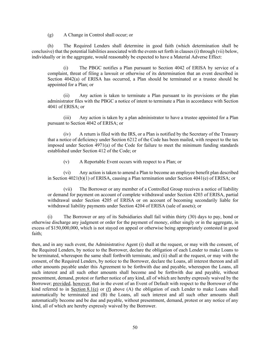 50 (g) A Change in Control shall occur; or (h) The Required Lenders shall determine in good faith (which determination shall be conclusive) that the potential liabilities associated with the events set forth in clauses (i) through (vii) below, individually or in the aggregate, would reasonably be expected to have a Material Adverse Effect: (i) The PBGC notifies a Plan pursuant to Section 4042 of ERISA by service of a complaint, threat of filing a lawsuit or otherwise of its determination that an event described in Section 4042(a) of ERISA has occurred, a Plan should be terminated or a trustee should be appointed for a Plan; or (ii) Any action is taken to terminate a Plan pursuant to its provisions or the plan administrator files with the PBGC a notice of intent to terminate a Plan in accordance with Section 4041 of ERISA; or (iii) Any action is taken by a plan administrator to have a trustee appointed for a Plan pursuant to Section 4042 of ERISA; or (iv) A return is filed with the IRS, or a Plan is notified by the Secretary of the Treasury that a notice of deficiency under Section 6212 of the Code has been mailed, with respect to the tax imposed under Section 4971(a) of the Code for failure to meet the minimum funding standards established under Section 412 of the Code; or (v) A Reportable Event occurs with respect to a Plan; or (vi) Any action is taken to amend a Plan to become an employee benefit plan described in Section 4021(b)(1) of ERISA, causing a Plan termination under Section 4041(e) of ERISA; or (vii) The Borrower or any member of a Controlled Group receives a notice of liability or demand for payment on account of complete withdrawal under Section 4203 of ERISA, partial withdrawal under Section 4205 of ERISA or on account of becoming secondarily liable for withdrawal liability payments under Section 4204 of ERISA (sale of assets); or (i) The Borrower or any of its Subsidiaries shall fail within thirty (30) days to pay, bond or otherwise discharge any judgment or order for the payment of money, either singly or in the aggregate, in excess of $150,000,000, which is not stayed on appeal or otherwise being appropriately contested in good faith; then, and in any such event, the Administrative Agent (i) shall at the request, or may with the consent, of the Required Lenders, by notice to the Borrower, declare the obligation of each Lender to make Loans to be terminated, whereupon the same shall forthwith terminate, and (ii) shall at the request, or may with the consent, of the Required Lenders, by notice to the Borrower, declare the Loans, all interest thereon and all other amounts payable under this Agreement to be forthwith due and payable, whereupon the Loans, all such interest and all such other amounts shall become and be forthwith due and payable, without presentment, demand, protest or further notice of any kind, all of which are hereby expressly waived by the Borrower; provided, however, that in the event of an Event of Default with respect to the Borrower of the kind referred to in Section 8.1(e) or (f) above (A) the obligation of each Lender to make Loans shall automatically be terminated and (B) the Loans, all such interest and all such other amounts shall automatically become and be due and payable, without presentment, demand, protest or any notice of any kind, all of which are hereby expressly waived by the Borrower.