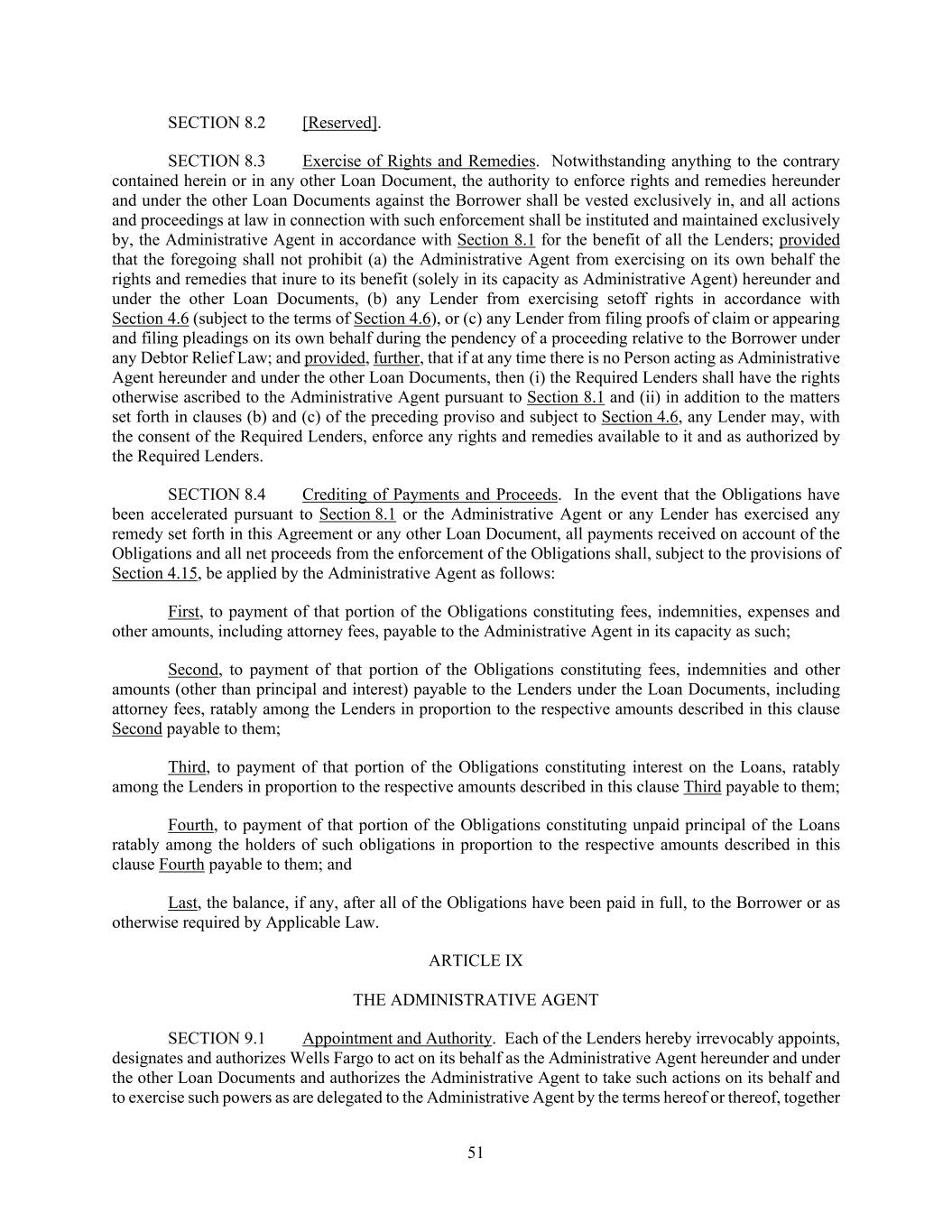 51 SECTION 8.2 [Reserved]. SECTION 8.3 Exercise of Rights and Remedies. Notwithstanding anything to the contrary contained herein or in any other Loan Document, the authority to enforce rights and remedies hereunder and under the other Loan Documents against the Borrower shall be vested exclusively in, and all actions and proceedings at law in connection with such enforcement shall be instituted and maintained exclusively by, the Administrative Agent in accordance with Section 8.1 for the benefit of all the Lenders; provided that the foregoing shall not prohibit (a) the Administrative Agent from exercising on its own behalf the rights and remedies that inure to its benefit (solely in its capacity as Administrative Agent) hereunder and under the other Loan Documents, (b) any Lender from exercising setoff rights in accordance with Section 4.6 (subject to the terms of Section 4.6), or (c) any Lender from filing proofs of claim or appearing and filing pleadings on its own behalf during the pendency of a proceeding relative to the Borrower under any Debtor Relief Law; and provided, further, that if at any time there is no Person acting as Administrative Agent hereunder and under the other Loan Documents, then (i) the Required Lenders shall have the rights otherwise ascribed to the Administrative Agent pursuant to Section 8.1 and (ii) in addition to the matters set forth in clauses (b) and (c) of the preceding proviso and subject to Section 4.6, any Lender may, with the consent of the Required Lenders, enforce any rights and remedies available to it and as authorized by the Required Lenders. SECTION 8.4 Crediting of Payments and Proceeds. In the event that the Obligations have been accelerated pursuant to Section 8.1 or the Administrative Agent or any Lender has exercised any remedy set forth in this Agreement or any other Loan Document, all payments received on account of the Obligations and all net proceeds from the enforcement of the Obligations shall, subject to the provisions of Section 4.15, be applied by the Administrative Agent as follows: First, to payment of that portion of the Obligations constituting fees, indemnities, expenses and other amounts, including attorney fees, payable to the Administrative Agent in its capacity as such; Second, to payment of that portion of the Obligations constituting fees, indemnities and other amounts (other than principal and interest) payable to the Lenders under the Loan Documents, including attorney fees, ratably among the Lenders in proportion to the respective amounts described in this clause Second payable to them; Third, to payment of that portion of the Obligations constituting interest on the Loans, ratably among the Lenders in proportion to the respective amounts described in this clause Third payable to them; Fourth, to payment of that portion of the Obligations constituting unpaid principal of the Loans ratably among the holders of such obligations in proportion to the respective amounts described in this clause Fourth payable to them; and Last, the balance, if any, after all of the Obligations have been paid in full, to the Borrower or as otherwise required by Applicable Law. ARTICLE IX THE ADMINISTRATIVE AGENT SECTION 9.1 Appointment and Authority. Each of the Lenders hereby irrevocably appoints, designates and authorizes Wells Fargo to act on its behalf as the Administrative Agent hereunder and under the other Loan Documents and authorizes the Administrative Agent to take such actions on its behalf and to exercise such powers as are delegated to the Administrative Agent by the terms hereof or thereof, together