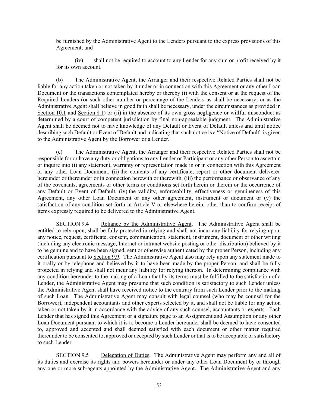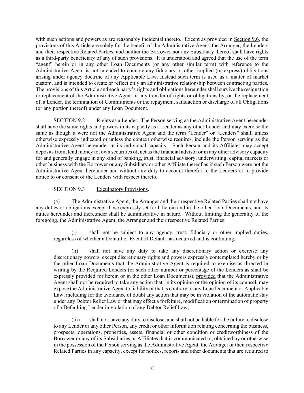 52 with such actions and powers as are reasonably incidental thereto. Except as provided in Section 9.6, the provisions of this Article are solely for the benefit of the Administrative Agent, the Arranger, the Lenders and their respective Related Parties, and neither the Borrower nor any Subsidiary thereof shall have rights as a third-party beneficiary of any of such provisions. It is understood and agreed that the use of the term “agent” herein or in any other Loan Documents (or any other similar term) with reference to the Administrative Agent is not intended to connote any fiduciary or other implied (or express) obligations arising under agency doctrine of any Applicable Law. Instead such term is used as a matter of market custom, and is intended to create or reflect only an administrative relationship between contracting parties. The provisions of this Article and each party’s rights and obligations hereunder shall survive the resignation or replacement of the Administrative Agent or any transfer of rights or obligations by, or the replacement of, a Lender, the termination of Commitments or the repayment, satisfaction or discharge of all Obligations (or any portion thereof) under any Loan Document. SECTION 9.2 Rights as a Lender. The Person serving as the Administrative Agent hereunder shall have the same rights and powers in its capacity as a Lender as any other Lender and may exercise the same as though it were not the Administrative Agent and the term “Lender” or “Lenders” shall, unless otherwise expressly indicated or unless the context otherwise requires, include the Person serving as the Administrative Agent hereunder in its individual capacity. Such Person and its Affiliates may accept deposits from, lend money to, own securities of, act as the financial advisor or in any other advisory capacity for and generally engage in any kind of banking, trust, financial advisory, underwriting, capital markets or other business with the Borrower or any Subsidiary or other Affiliate thereof as if such Person were not the Administrative Agent hereunder and without any duty to account therefor to the Lenders or to provide notice to or consent of the Lenders with respect thereto. SECTION 9.3 Exculpatory Provisions. (a) The Administrative Agent, the Arranger and their respective Related Parties shall not have any duties or obligations except those expressly set forth herein and in the other Loan Documents, and its duties hereunder and thereunder shall be administrative in nature. Without limiting the generality of the foregoing, the Administrative Agent, the Arranger and their respective Related Parties: (i) shall not be subject to any agency, trust, fiduciary or other implied duties, regardless of whether a Default or Event of Default has occurred and is continuing; (ii) shall not have any duty to take any discretionary action or exercise any discretionary powers, except discretionary rights and powers expressly contemplated hereby or by the other Loan Documents that the Administrative Agent is required to exercise as directed in writing by the Required Lenders (or such other number or percentage of the Lenders as shall be expressly provided for herein or in the other Loan Documents), provided that the Administrative Agent shall not be required to take any action that, in its opinion or the opinion of its counsel, may expose the Administrative Agent to liability or that is contrary to any Loan Document or Applicable Law, including for the avoidance of doubt any action that may be in violation of the automatic stay under any Debtor Relief Law or that may effect a forfeiture, modification or termination of property of a Defaulting Lender in violation of any Debtor Relief Law; (iii) shall not, have any duty to disclose, and shall not be liable for the failure to disclose to any Lender or any other Person, any credit or other information relating concerning the business, prospects, operations, properties, assets, financial or other condition or creditworthiness of the Borrower or any of its Subsidiaries or Affiliates that is communicated to, obtained by or otherwise in the possession of the Person serving as the Administrative Agent, the Arranger or their respective Related Parties in any capacity, except for notices, reports and other documents that are required to