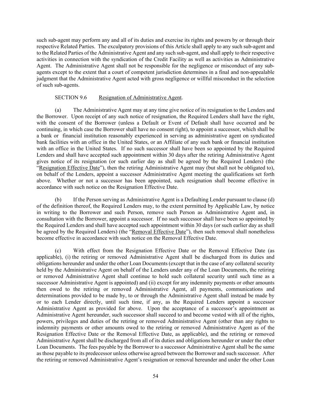 54 such sub-agent may perform any and all of its duties and exercise its rights and powers by or through their respective Related Parties. The exculpatory provisions of this Article shall apply to any such sub-agent and to the Related Parties of the Administrative Agent and any such sub-agent, and shall apply to their respective activities in connection with the syndication of the Credit Facility as well as activities as Administrative Agent. The Administrative Agent shall not be responsible for the negligence or misconduct of any sub- agents except to the extent that a court of competent jurisdiction determines in a final and non-appealable judgment that the Administrative Agent acted with gross negligence or willful misconduct in the selection of such sub-agents. SECTION 9.6 Resignation of Administrative Agent. (a) The Administrative Agent may at any time give notice of its resignation to the Lenders and the Borrower. Upon receipt of any such notice of resignation, the Required Lenders shall have the right, with the consent of the Borrower (unless a Default or Event of Default shall have occurred and be continuing, in which case the Borrower shall have no consent right), to appoint a successor, which shall be a bank or financial institution reasonably experienced in serving as administrative agent on syndicated bank facilities with an office in the United States, or an Affiliate of any such bank or financial institution with an office in the United States. If no such successor shall have been so appointed by the Required Lenders and shall have accepted such appointment within 30 days after the retiring Administrative Agent gives notice of its resignation (or such earlier day as shall be agreed by the Required Lenders) (the “Resignation Effective Date”), then the retiring Administrative Agent may (but shall not be obligated to), on behalf of the Lenders, appoint a successor Administrative Agent meeting the qualifications set forth above. Whether or not a successor has been appointed, such resignation shall become effective in accordance with such notice on the Resignation Effective Date. (b) If the Person serving as Administrative Agent is a Defaulting Lender pursuant to clause (d) of the definition thereof, the Required Lenders may, to the extent permitted by Applicable Law, by notice in writing to the Borrower and such Person, remove such Person as Administrative Agent and, in consultation with the Borrower, appoint a successor. If no such successor shall have been so appointed by the Required Lenders and shall have accepted such appointment within 30 days (or such earlier day as shall be agreed by the Required Lenders) (the “Removal Effective Date”), then such removal shall nonetheless become effective in accordance with such notice on the Removal Effective Date. (c) With effect from the Resignation Effective Date or the Removal Effective Date (as applicable), (i) the retiring or removed Administrative Agent shall be discharged from its duties and obligations hereunder and under the other Loan Documents (except that in the case of any collateral security held by the Administrative Agent on behalf of the Lenders under any of the Loan Documents, the retiring or removed Administrative Agent shall continue to hold such collateral security until such time as a successor Administrative Agent is appointed) and (ii) except for any indemnity payments or other amounts then owed to the retiring or removed Administrative Agent, all payments, communications and determinations provided to be made by, to or through the Administrative Agent shall instead be made by or to each Lender directly, until such time, if any, as the Required Lenders appoint a successor Administrative Agent as provided for above. Upon the acceptance of a successor’s appointment as Administrative Agent hereunder, such successor shall succeed to and become vested with all of the rights, powers, privileges and duties of the retiring or removed Administrative Agent (other than any rights to indemnity payments or other amounts owed to the retiring or removed Administrative Agent as of the Resignation Effective Date or the Removal Effective Date, as applicable), and the retiring or removed Administrative Agent shall be discharged from all of its duties and obligations hereunder or under the other Loan Documents. The fees payable by the Borrower to a successor Administrative Agent shall be the same as those payable to its predecessor unless otherwise agreed between the Borrower and such successor. After the retiring or removed Administrative Agent’s resignation or removal hereunder and under the other Loan