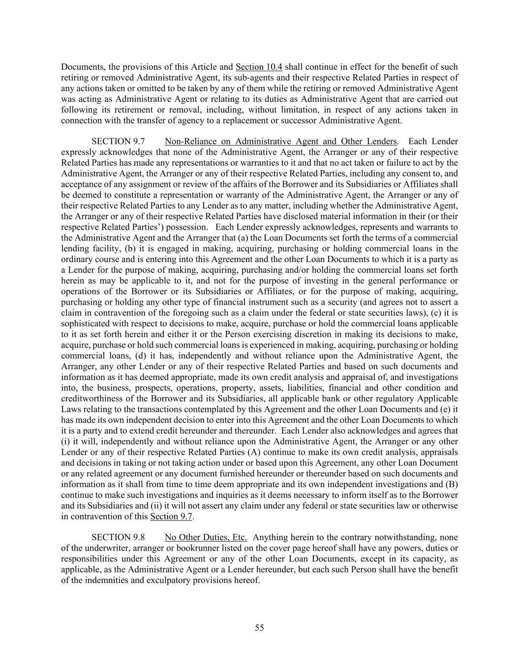 55 Documents, the provisions of this Article and Section 10.4 shall continue in effect for the benefit of such retiring or removed Administrative Agent, its sub-agents and their respective Related Parties in respect of any actions taken or omitted to be taken by any of them while the retiring or removed Administrative Agent was acting as Administrative Agent or relating to its duties as Administrative Agent that are carried out following its retirement or removal, including, without limitation, in respect of any actions taken in connection with the transfer of agency to a replacement or successor Administrative Agent. SECTION 9.7 Non-Reliance on Administrative Agent and Other Lenders. Each Lender expressly acknowledges that none of the Administrative Agent, the Arranger or any of their respective Related Parties has made any representations or warranties to it and that no act taken or failure to act by the Administrative Agent, the Arranger or any of their respective Related Parties, including any consent to, and acceptance of any assignment or review of the affairs of the Borrower and its Subsidiaries or Affiliates shall be deemed to constitute a representation or warranty of the Administrative Agent, the Arranger or any of their respective Related Parties to any Lender as to any matter, including whether the Administrative Agent, the Arranger or any of their respective Related Parties have disclosed material information in their (or their respective Related Parties’) possession. Each Lender expressly acknowledges, represents and warrants to the Administrative Agent and the Arranger that (a) the Loan Documents set forth the terms of a commercial lending facility, (b) it is engaged in making, acquiring, purchasing or holding commercial loans in the ordinary course and is entering into this Agreement and the other Loan Documents to which it is a party as a Lender for the purpose of making, acquiring, purchasing and/or holding the commercial loans set forth herein as may be applicable to it, and not for the purpose of investing in the general performance or operations of the Borrower or its Subsidiaries or Affiliates, or for the purpose of making, acquiring, purchasing or holding any other type of financial instrument such as a security (and agrees not to assert a claim in contravention of the foregoing such as a claim under the federal or state securities laws), (c) it is sophisticated with respect to decisions to make, acquire, purchase or hold the commercial loans applicable to it as set forth herein and either it or the Person exercising discretion in making its decisions to make, acquire, purchase or hold such commercial loans is experienced in making, acquiring, purchasing or holding commercial loans, (d) it has, independently and without reliance upon the Administrative Agent, the Arranger, any other Lender or any of their respective Related Parties and based on such documents and information as it has deemed appropriate, made its own credit analysis and appraisal of, and investigations into, the business, prospects, operations, property, assets, liabilities, financial and other condition and creditworthiness of the Borrower and its Subsidiaries, all applicable bank or other regulatory Applicable Laws relating to the transactions contemplated by this Agreement and the other Loan Documents and (e) it has made its own independent decision to enter into this Agreement and the other Loan Documents to which it is a party and to extend credit hereunder and thereunder. Each Lender also acknowledges and agrees that (i) it will, independently and without reliance upon the Administrative Agent, the Arranger or any other Lender or any of their respective Related Parties (A) continue to make its own credit analysis, appraisals and decisions in taking or not taking action under or based upon this Agreement, any other Loan Document or any related agreement or any document furnished hereunder or thereunder based on such documents and information as it shall from time to time deem appropriate and its own independent investigations and (B) continue to make such investigations and inquiries as it deems necessary to inform itself as to the Borrower and its Subsidiaries and (ii) it will not assert any claim under any federal or state securities law or otherwise in contravention of this Section 9.7. SECTION 9.8 No Other Duties, Etc. Anything herein to the contrary notwithstanding, none of the underwriter, arranger or bookrunner listed on the cover page hereof shall have any powers, duties or responsibilities under this Agreement or any of the other Loan Documents, except in its capacity, as applicable, as the Administrative Agent or a Lender hereunder, but each such Person shall have the benefit of the indemnities and exculpatory provisions hereof.