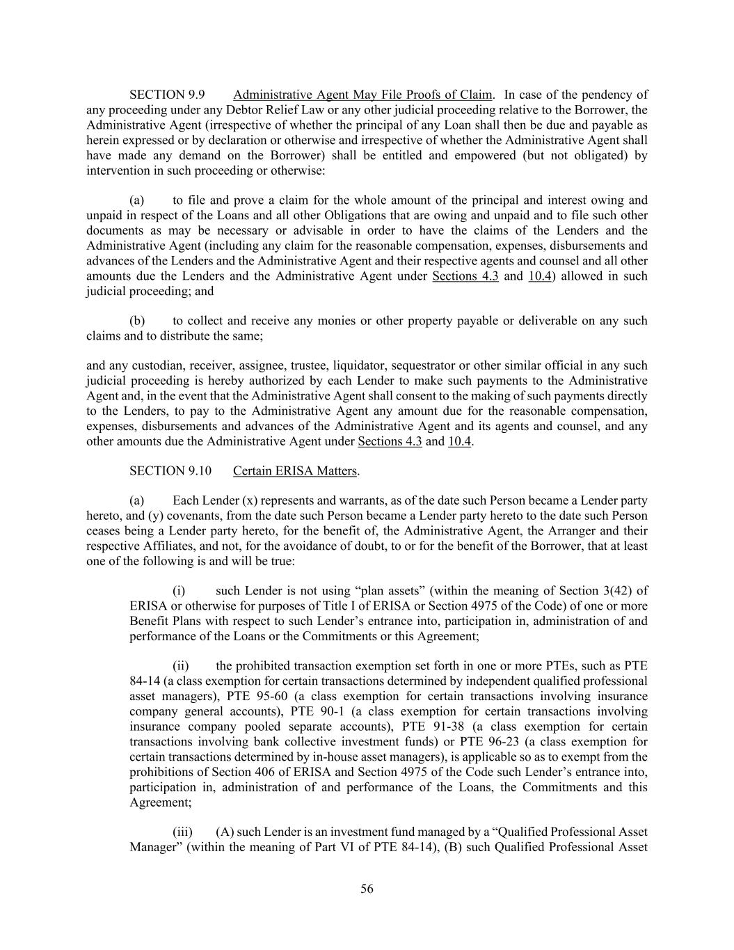 56 SECTION 9.9 Administrative Agent May File Proofs of Claim. In case of the pendency of any proceeding under any Debtor Relief Law or any other judicial proceeding relative to the Borrower, the Administrative Agent (irrespective of whether the principal of any Loan shall then be due and payable as herein expressed or by declaration or otherwise and irrespective of whether the Administrative Agent shall have made any demand on the Borrower) shall be entitled and empowered (but not obligated) by intervention in such proceeding or otherwise: (a) to file and prove a claim for the whole amount of the principal and interest owing and unpaid in respect of the Loans and all other Obligations that are owing and unpaid and to file such other documents as may be necessary or advisable in order to have the claims of the Lenders and the Administrative Agent (including any claim for the reasonable compensation, expenses, disbursements and advances of the Lenders and the Administrative Agent and their respective agents and counsel and all other amounts due the Lenders and the Administrative Agent under Sections 4.3 and 10.4) allowed in such judicial proceeding; and (b) to collect and receive any monies or other property payable or deliverable on any such claims and to distribute the same; and any custodian, receiver, assignee, trustee, liquidator, sequestrator or other similar official in any such judicial proceeding is hereby authorized by each Lender to make such payments to the Administrative Agent and, in the event that the Administrative Agent shall consent to the making of such payments directly to the Lenders, to pay to the Administrative Agent any amount due for the reasonable compensation, expenses, disbursements and advances of the Administrative Agent and its agents and counsel, and any other amounts due the Administrative Agent under Sections 4.3 and 10.4. SECTION 9.10 Certain ERISA Matters. (a) Each Lender (x) represents and warrants, as of the date such Person became a Lender party hereto, and (y) covenants, from the date such Person became a Lender party hereto to the date such Person ceases being a Lender party hereto, for the benefit of, the Administrative Agent, the Arranger and their respective Affiliates, and not, for the avoidance of doubt, to or for the benefit of the Borrower, that at least one of the following is and will be true: (i) such Lender is not using “plan assets” (within the meaning of Section 3(42) of ERISA or otherwise for purposes of Title I of ERISA or Section 4975 of the Code) of one or more Benefit Plans with respect to such Lender’s entrance into, participation in, administration of and performance of the Loans or the Commitments or this Agreement; (ii) the prohibited transaction exemption set forth in one or more PTEs, such as PTE 84-14 (a class exemption for certain transactions determined by independent qualified professional asset managers), PTE 95-60 (a class exemption for certain transactions involving insurance company general accounts), PTE 90-1 (a class exemption for certain transactions involving insurance company pooled separate accounts), PTE 91-38 (a class exemption for certain transactions involving bank collective investment funds) or PTE 96-23 (a class exemption for certain transactions determined by in-house asset managers), is applicable so as to exempt from the prohibitions of Section 406 of ERISA and Section 4975 of the Code such Lender’s entrance into, participation in, administration of and performance of the Loans, the Commitments and this Agreement; (iii) (A) such Lender is an investment fund managed by a “Qualified Professional Asset Manager” (within the meaning of Part VI of PTE 84-14), (B) such Qualified Professional Asset